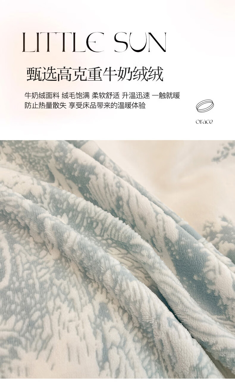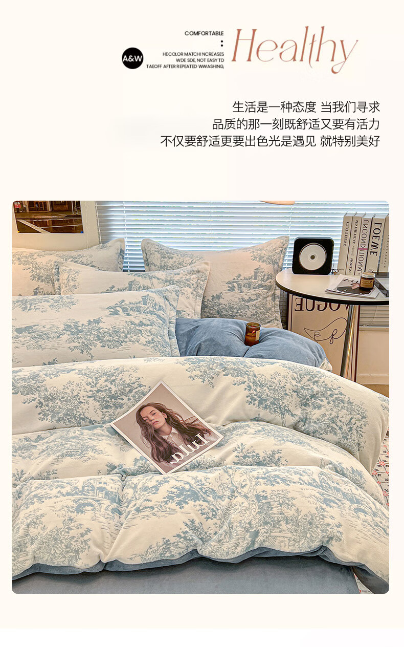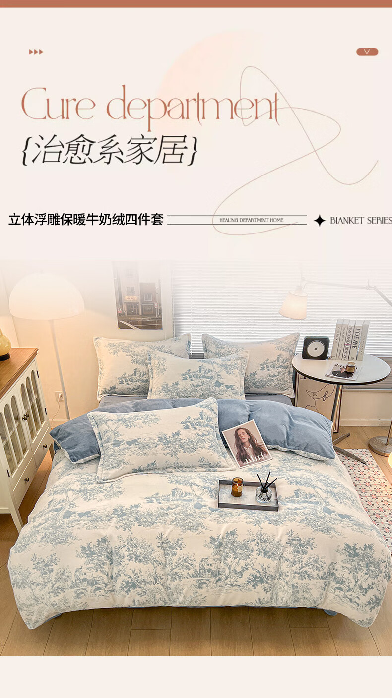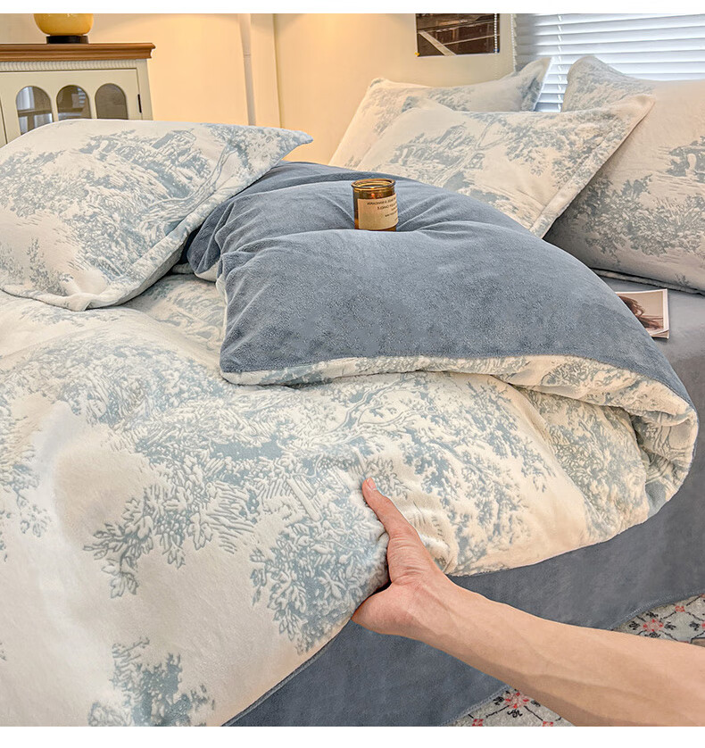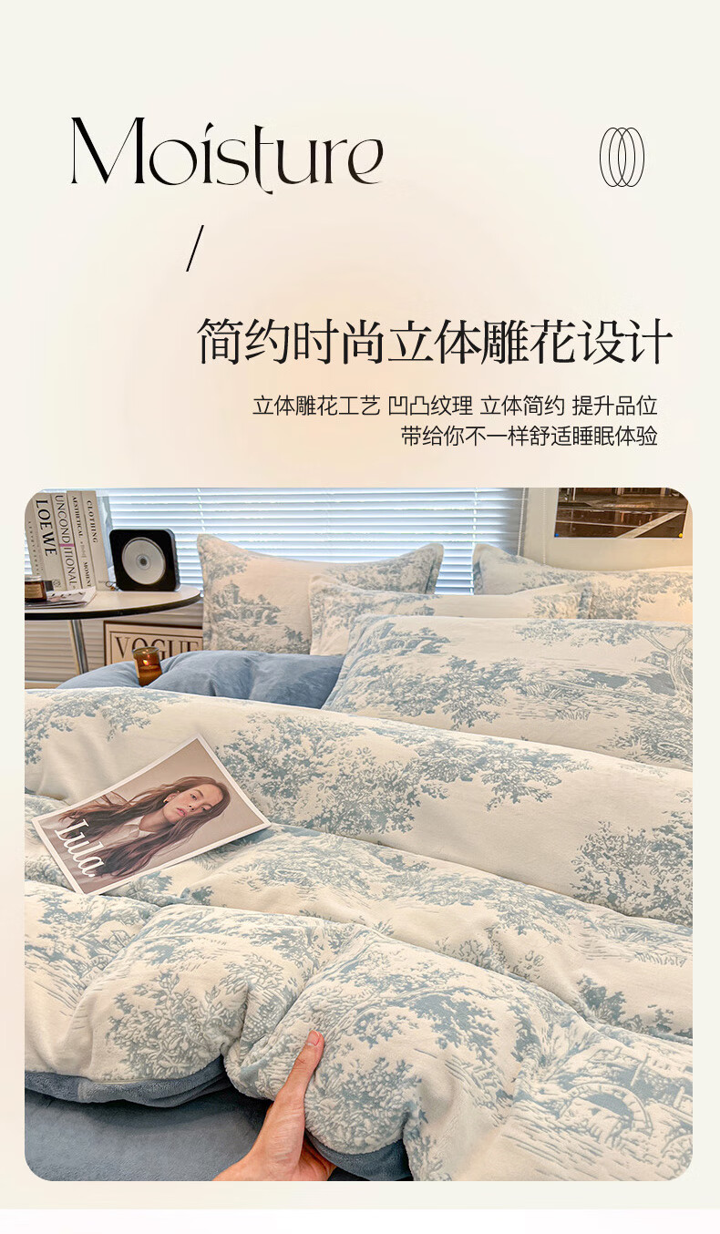 猫人(MiiOW)冬季雕花加厚牛奶绒被套单件150x200单独珊瑚法兰绒加绒被罩 乐枝蓝【加密牛奶绒 蓄热保暖不易掉毛】 2.0m床单四件套-适合220x240cm被芯