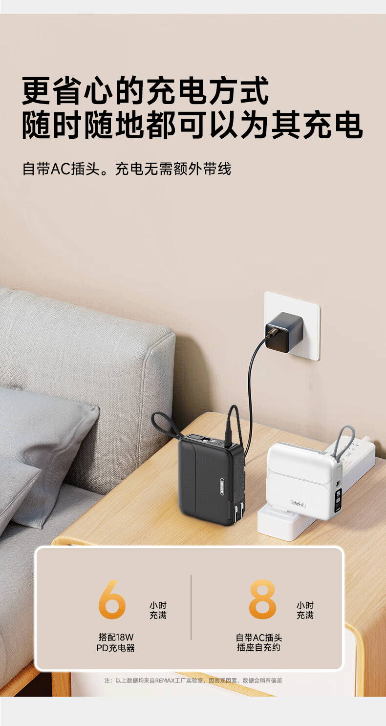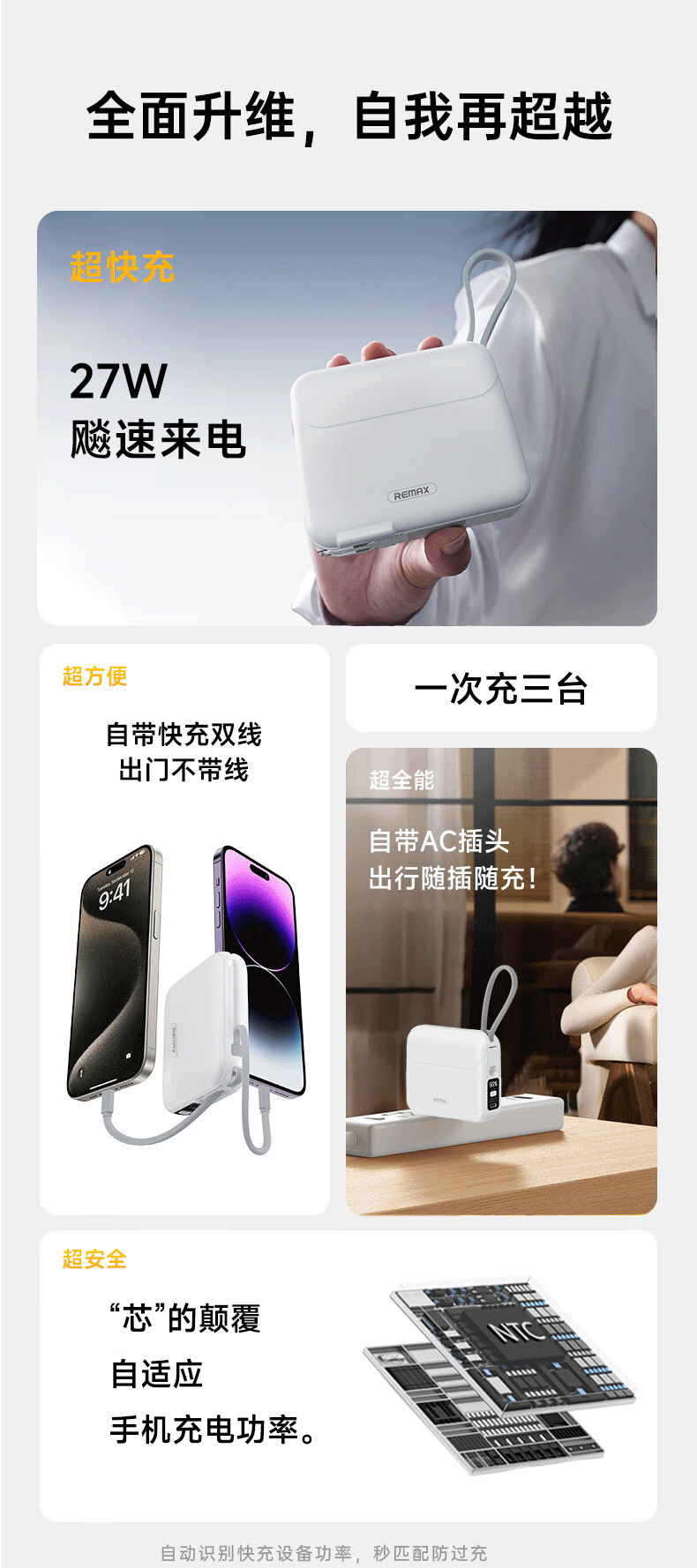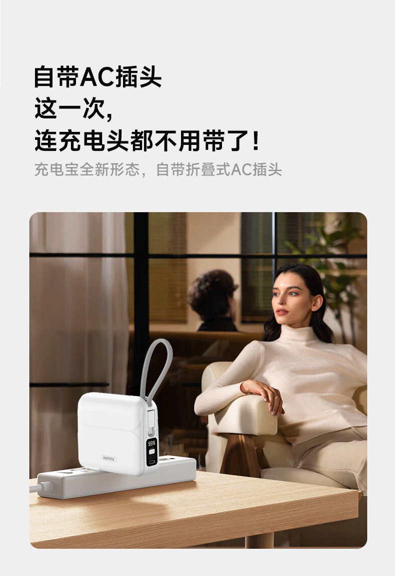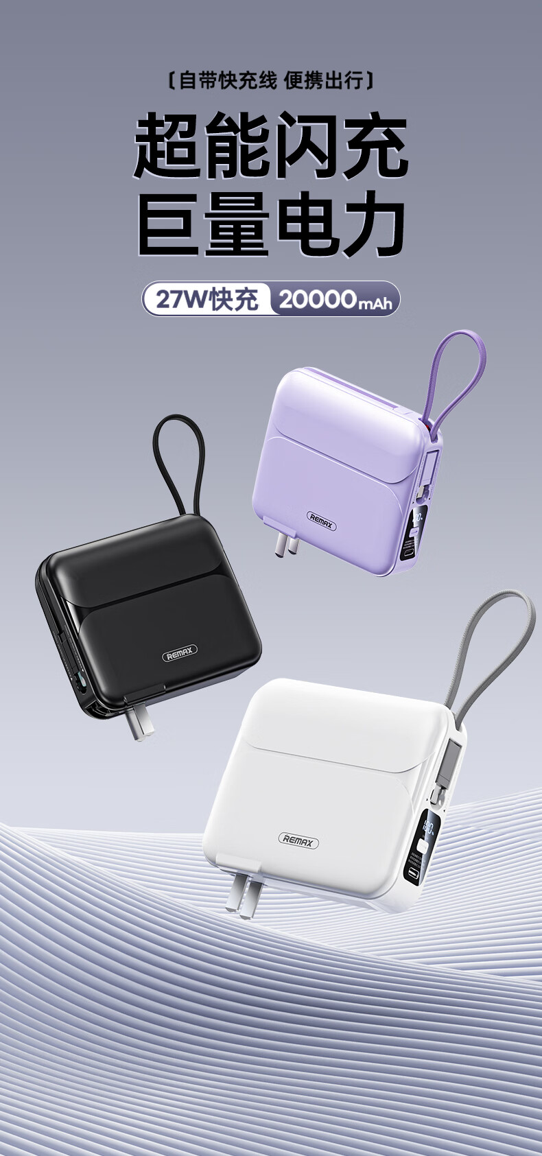remax睿量【3C认证】三合一充电宝20000毫安时自带双线+AC插头27W快充移动电源适用苹果16华为可上飞机