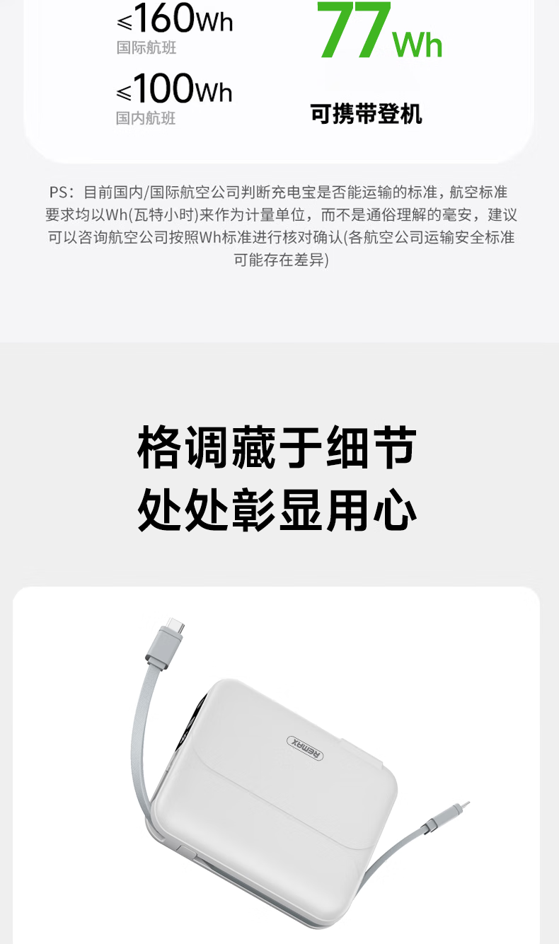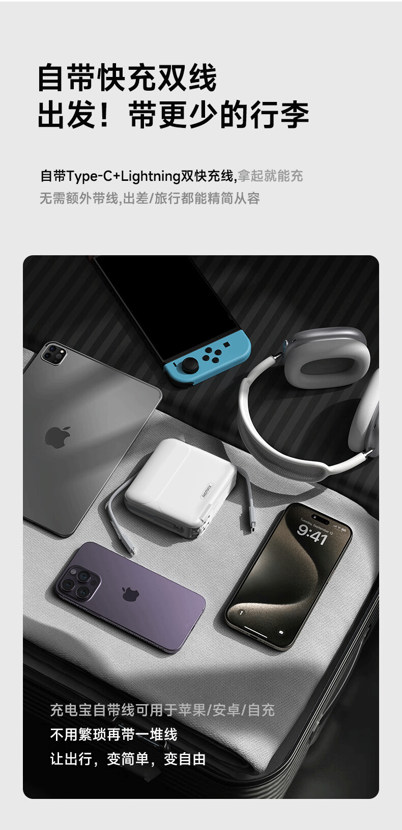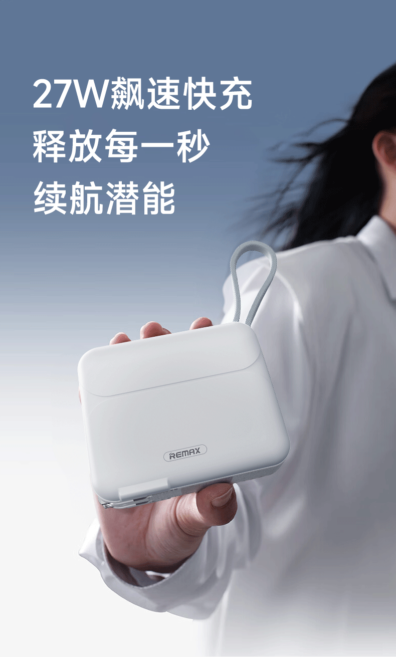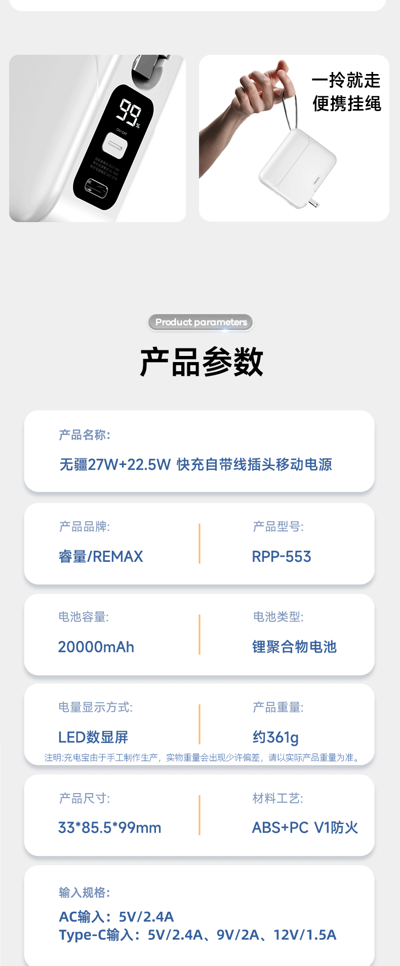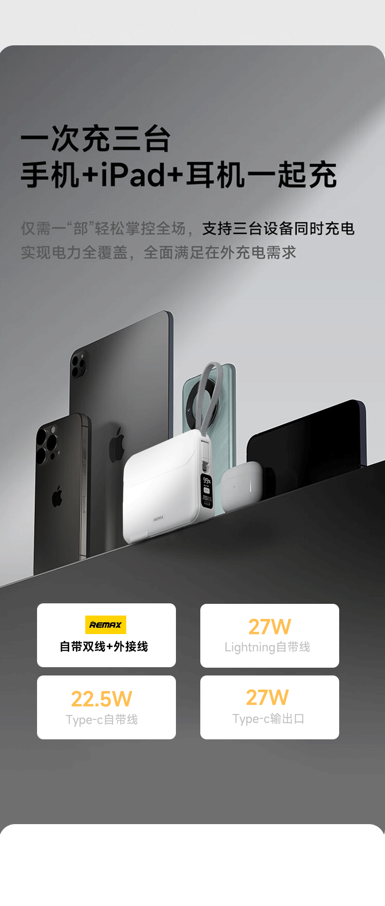 remax睿量【3C认证】三合一充电宝20000毫安时自带双线+AC插头27W快充移动电源适用苹果16华为可上飞机