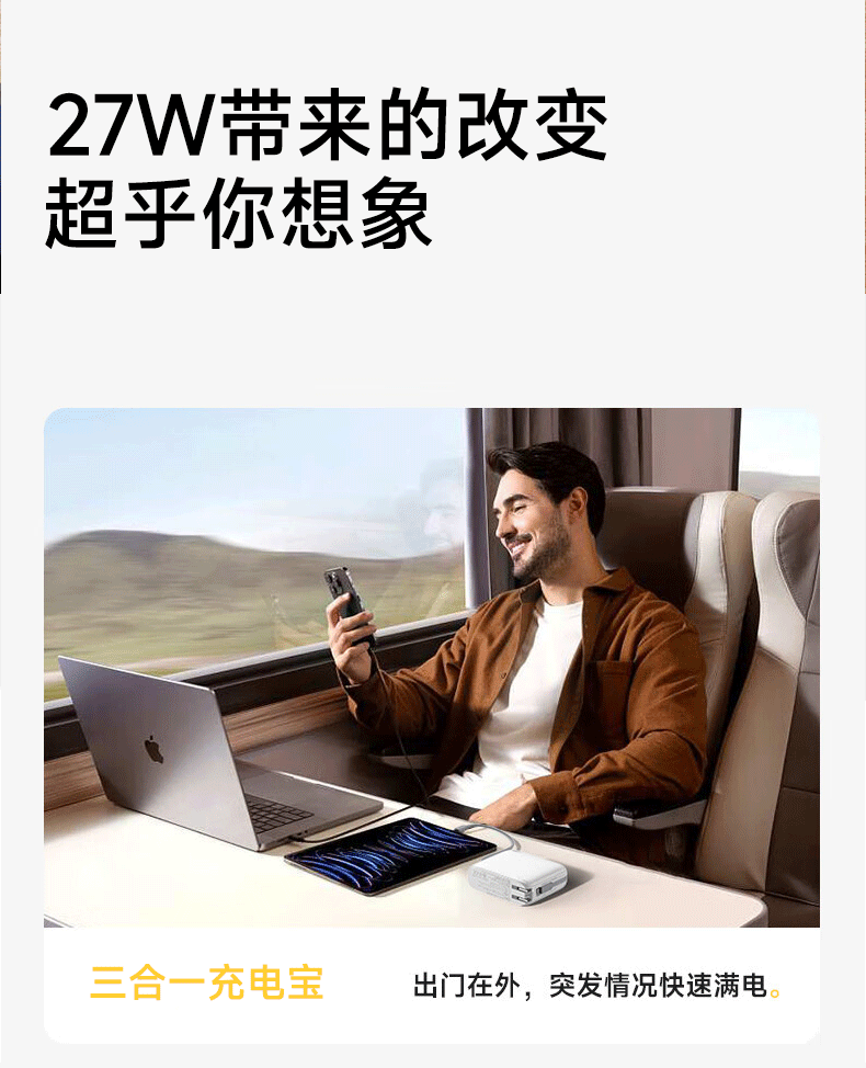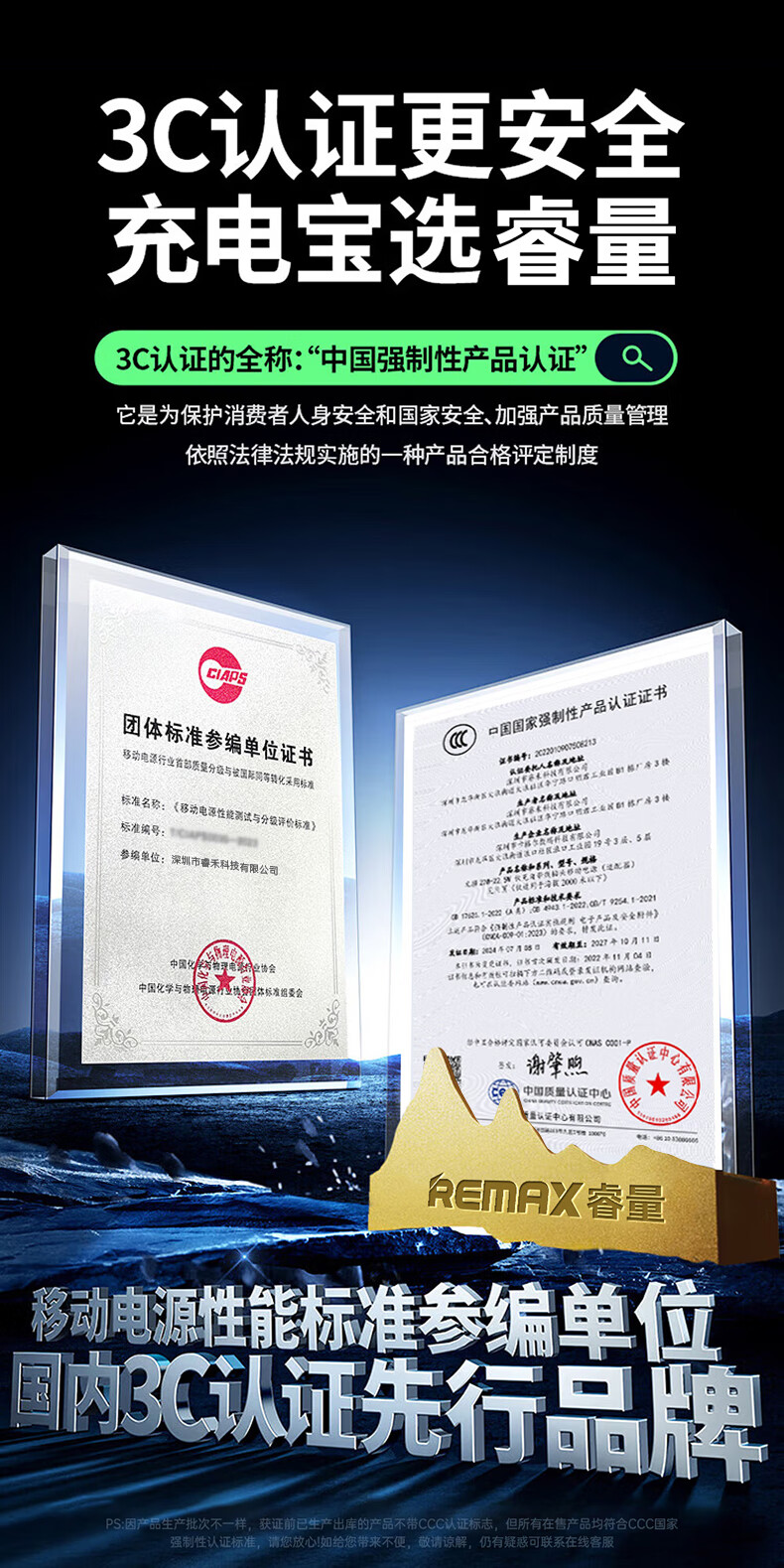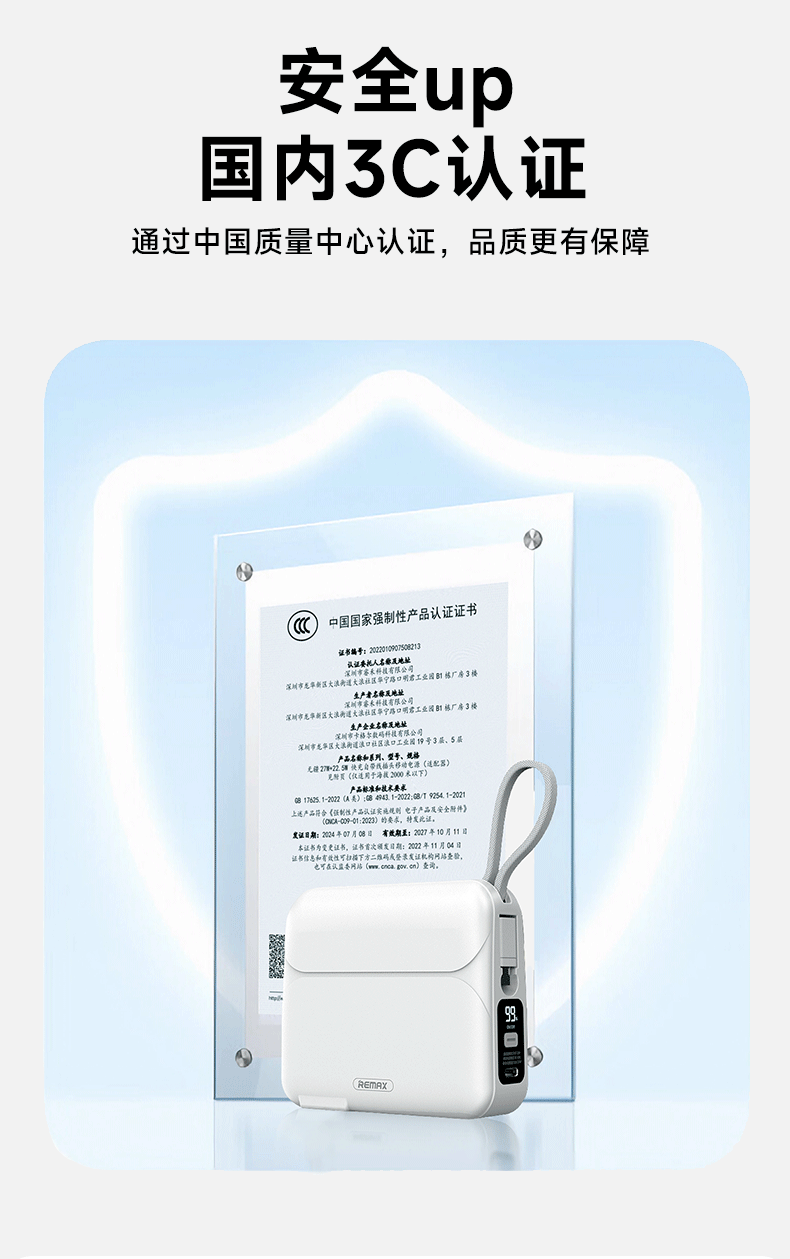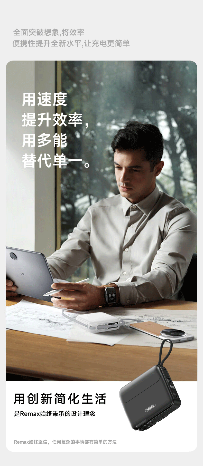 remax睿量【3C认证】三合一充电宝20000毫安时自带双线+AC插头27W快充移动电源适用苹果16华为可上飞机