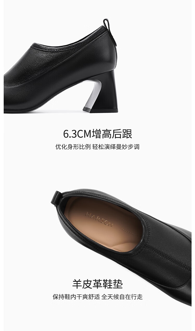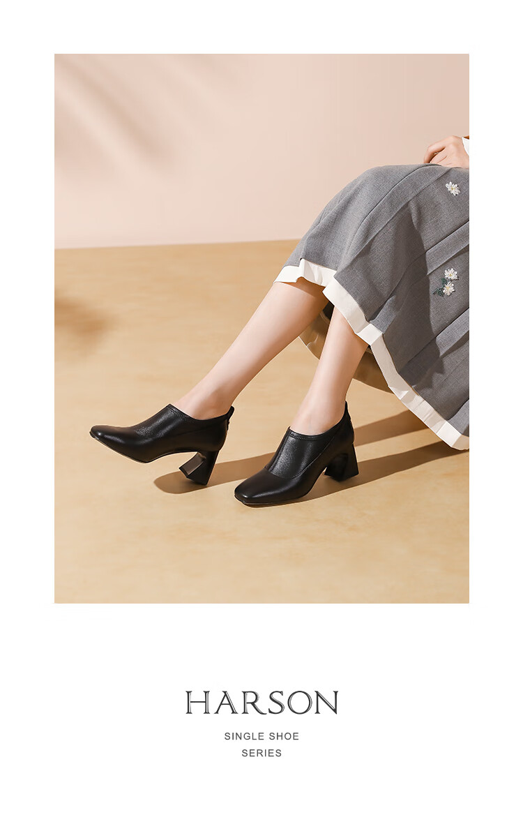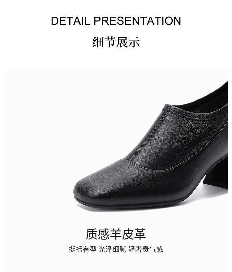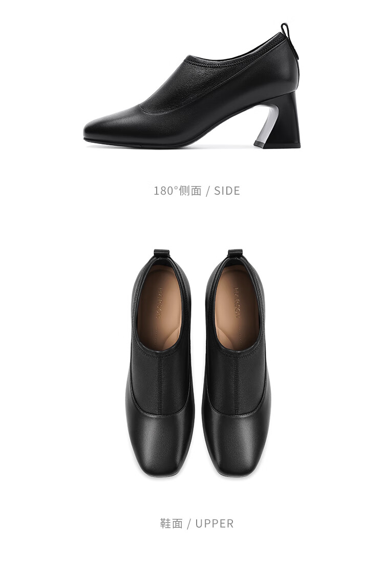 哈森复古方头粗跟羊皮女鞋2025新款时尚单靴高跟深口单鞋女HHL259030 黑色 羊皮革 34