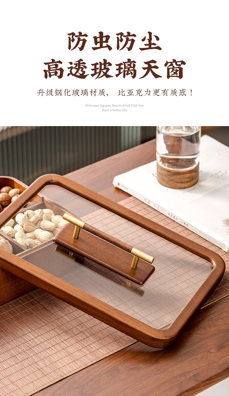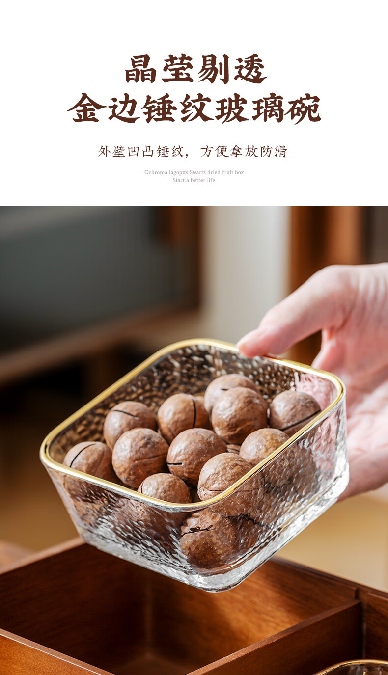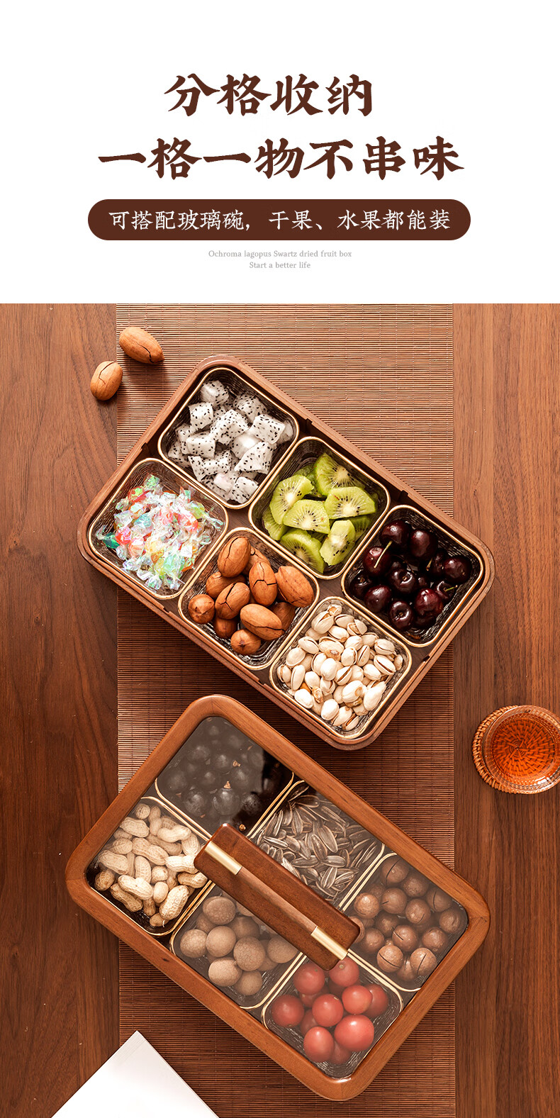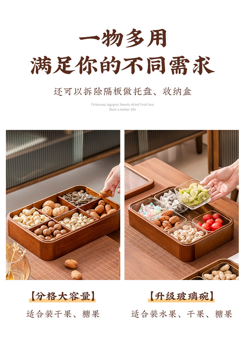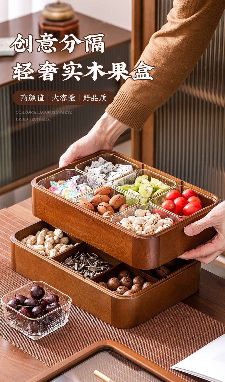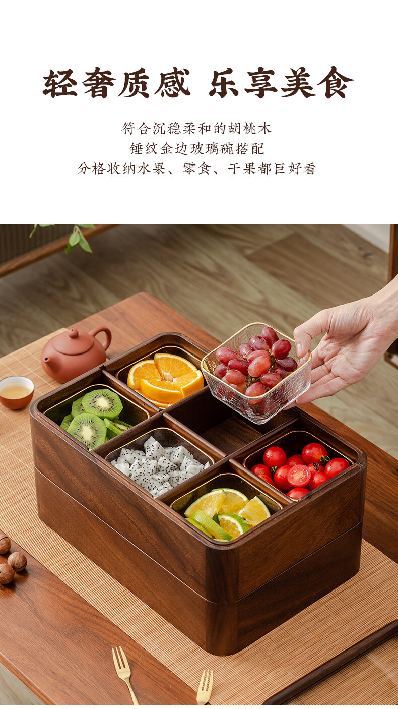 木雅轩干果盘实木干果盒瓜子糖果盘分格水果盘客厅干果收纳盒果盘零食盘 单层干果盘+6玻璃碗