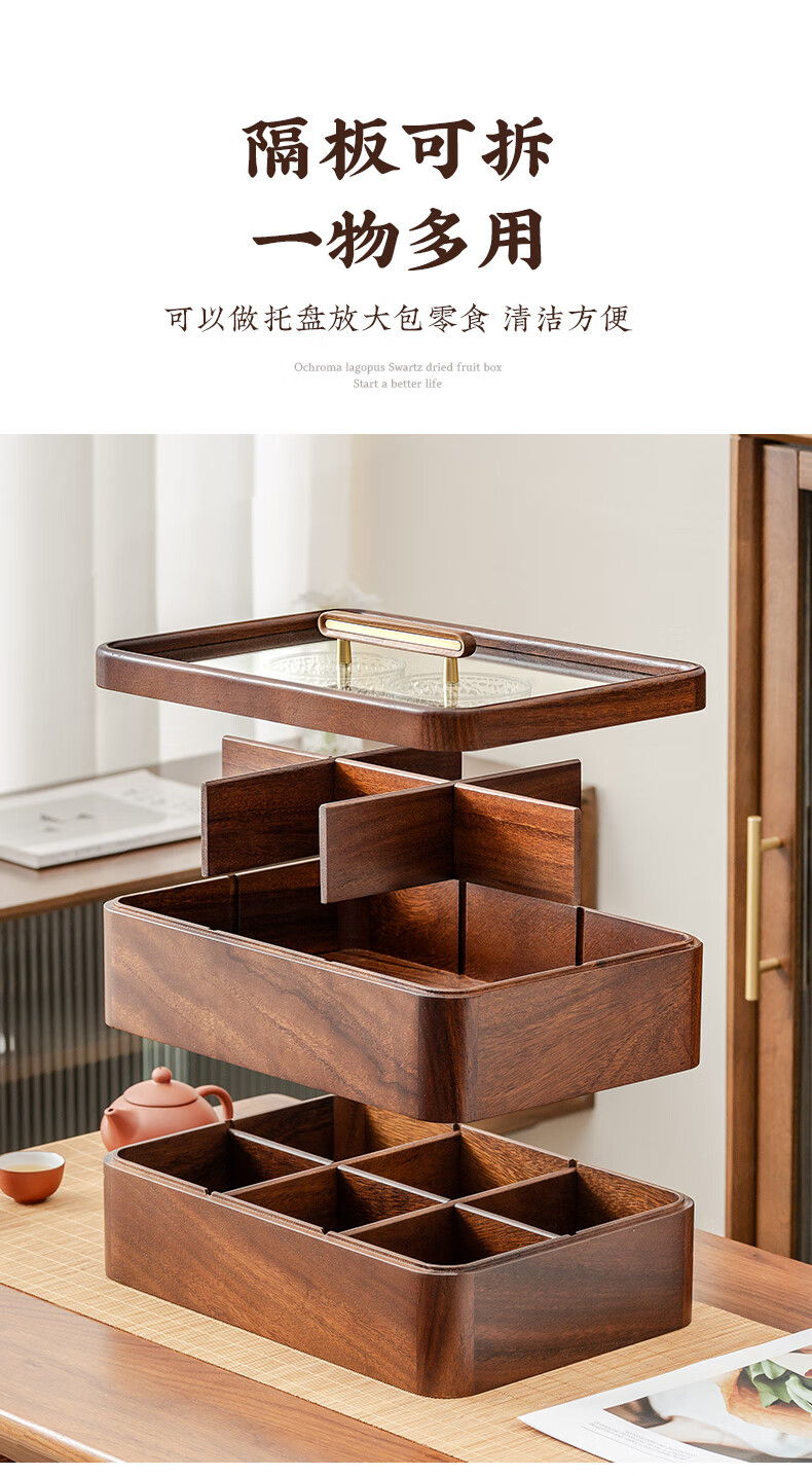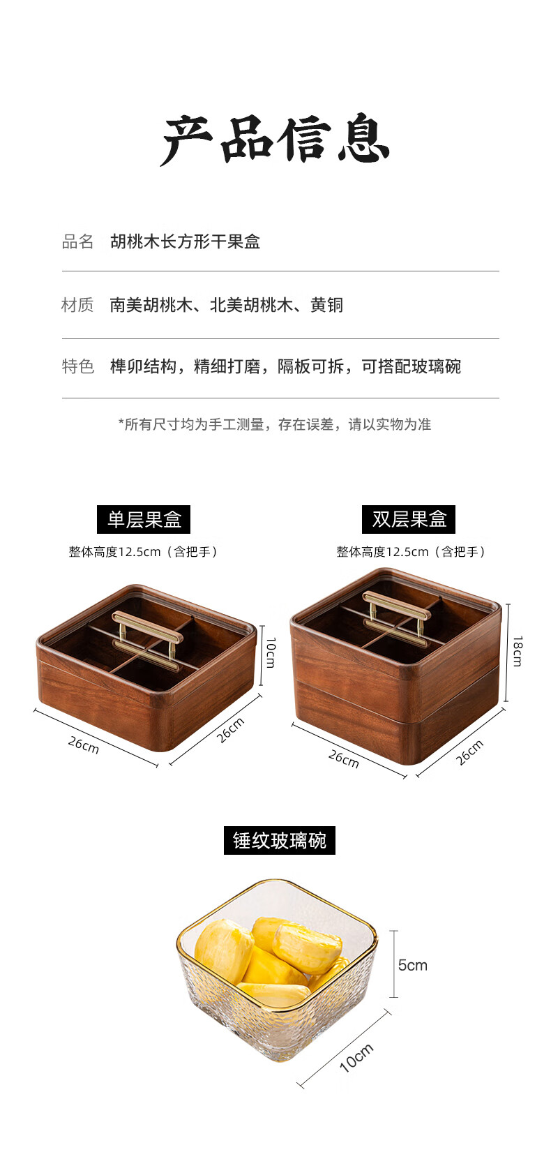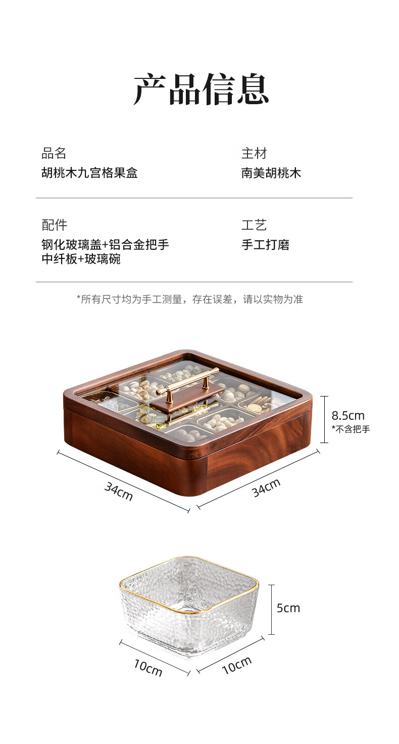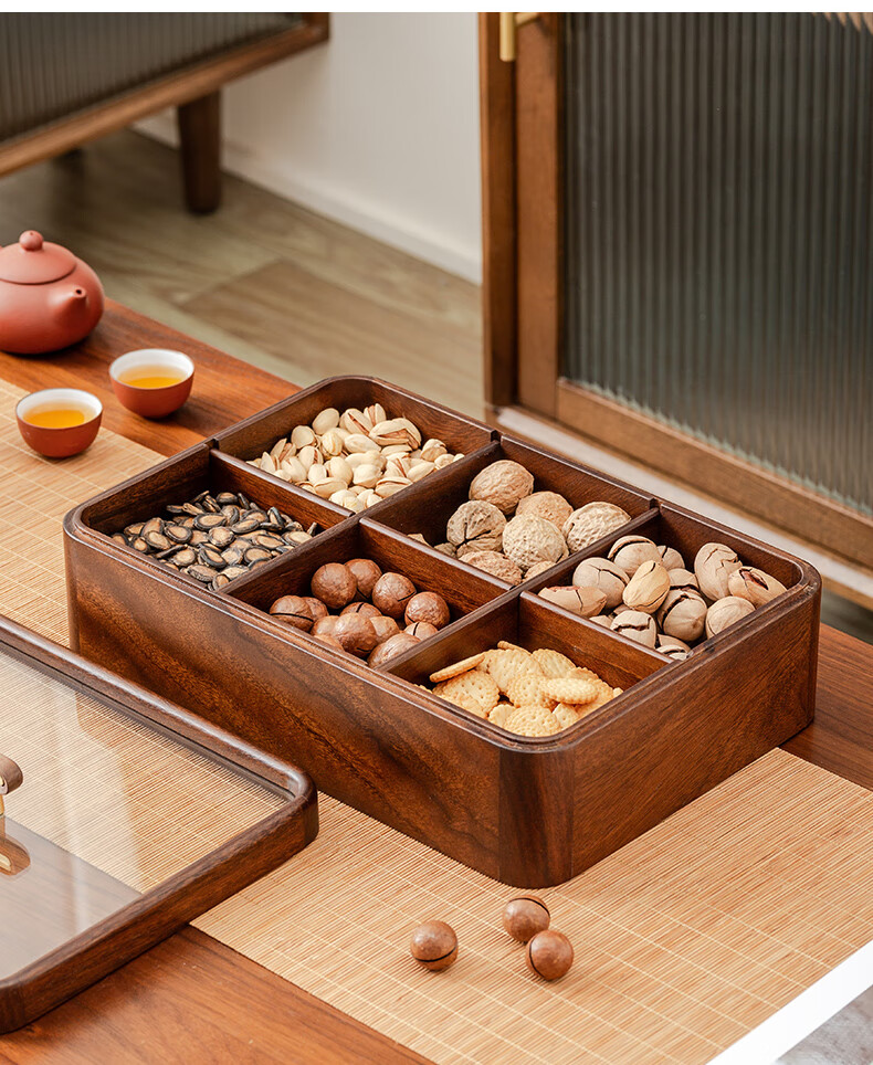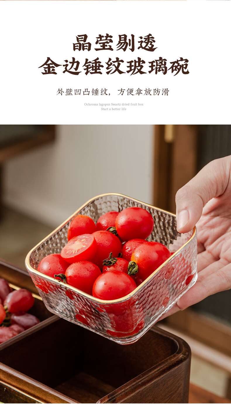 木雅轩干果盘实木干果盒瓜子糖果盘分格水果盘客厅干果收纳盒果盘零食盘 单层干果盘+6玻璃碗