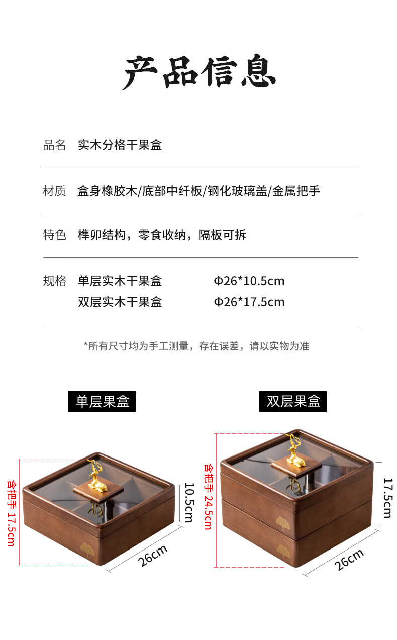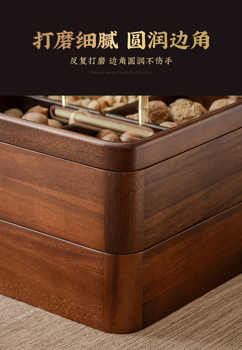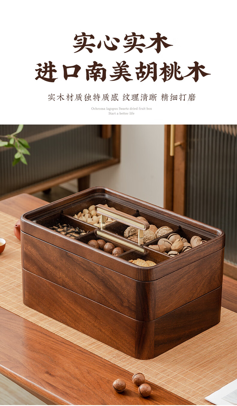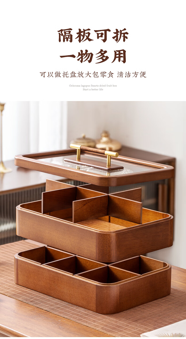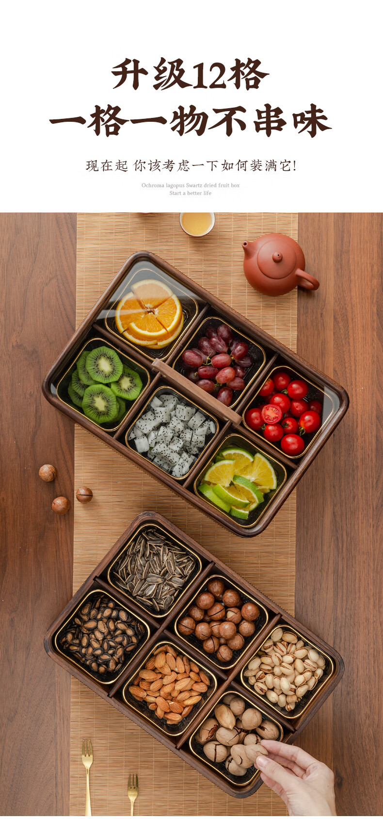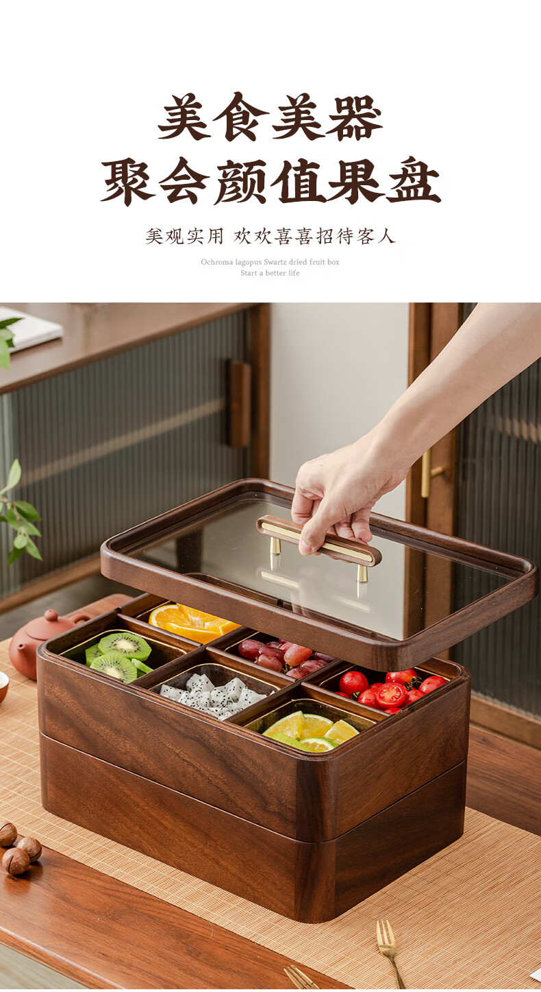 木雅轩干果盘实木干果盒瓜子糖果盘分格水果盘客厅干果收纳盒果盘零食盘 单层干果盘+6玻璃碗