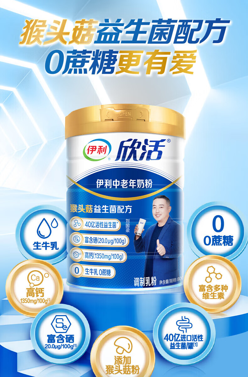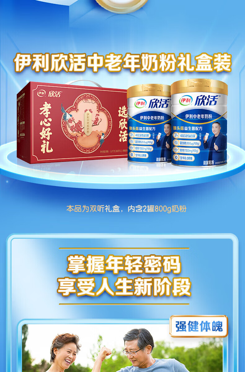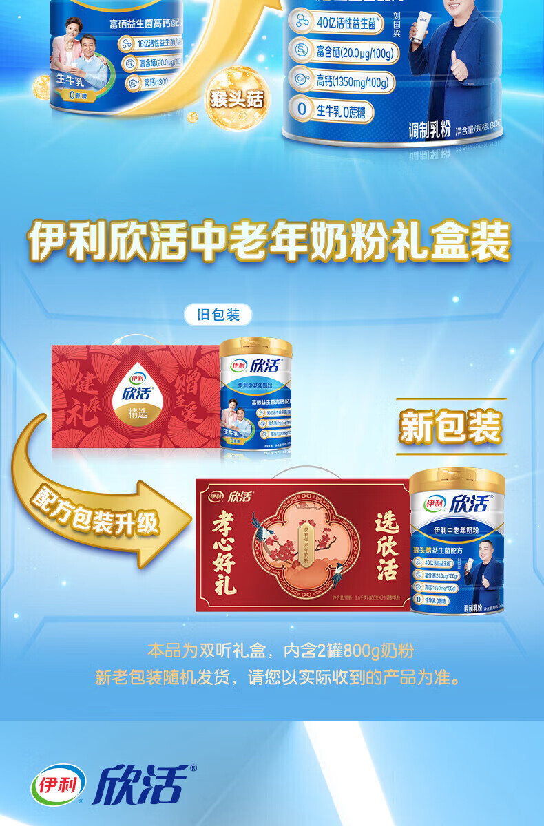 伊利欣活中老年富硒奶粉800g 高钙高蛋白 益生菌 维生素 0蔗糖 送礼 【富硒多维高钙】800g*2罐 礼盒装