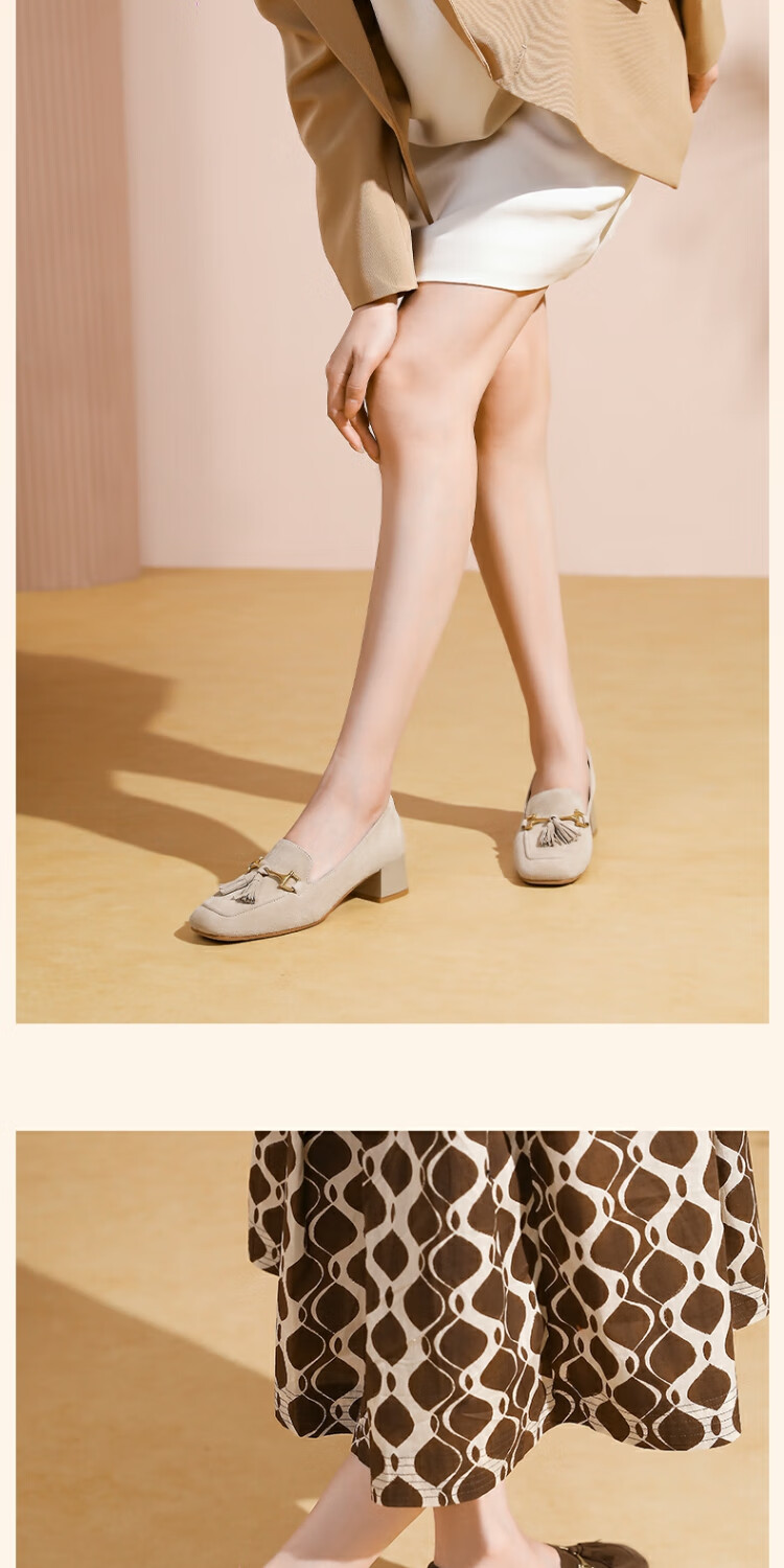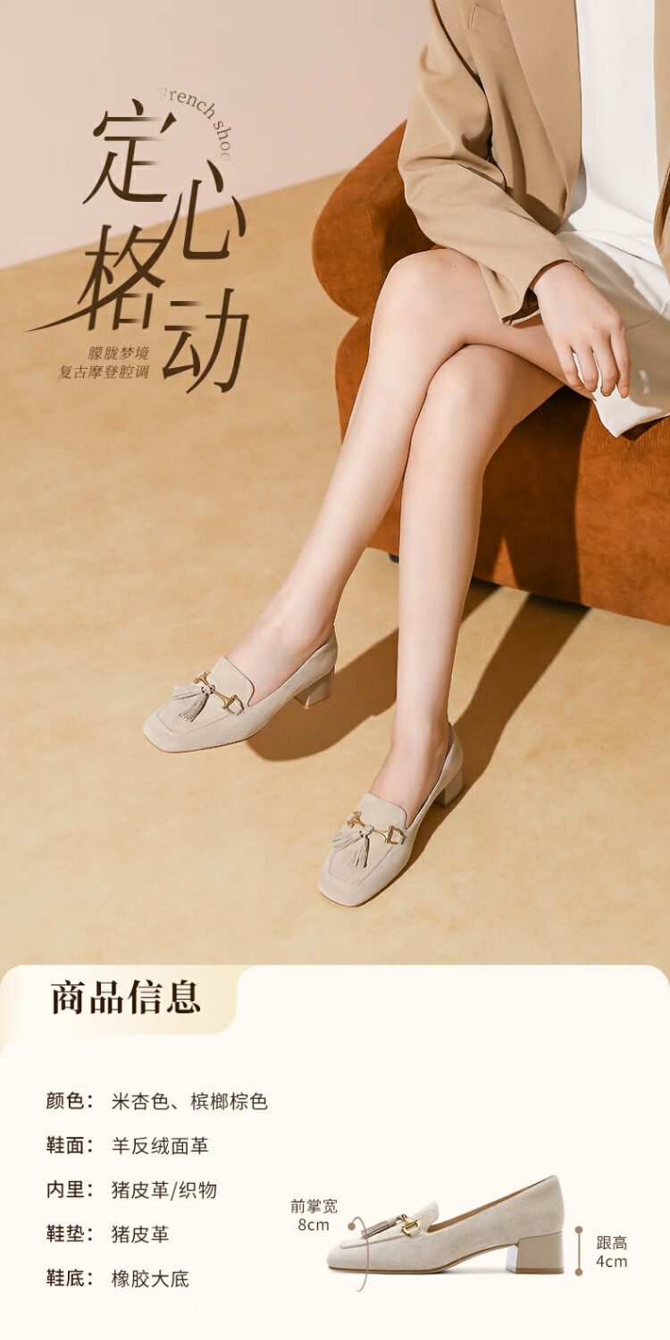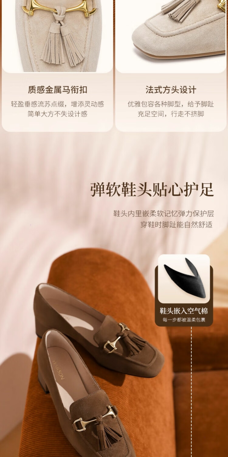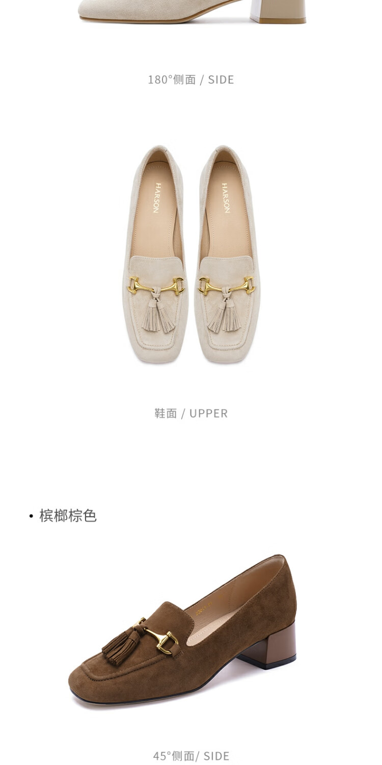 哈森绒面流苏乐福鞋高跟上班通勤百搭女鞋单鞋2025秋新品HL257122 米杏色 羊反绒面革 36
