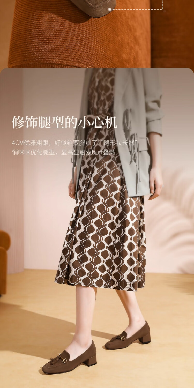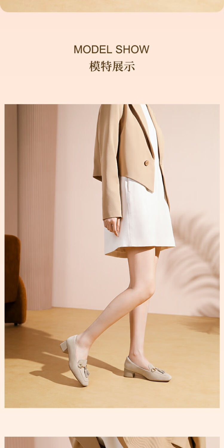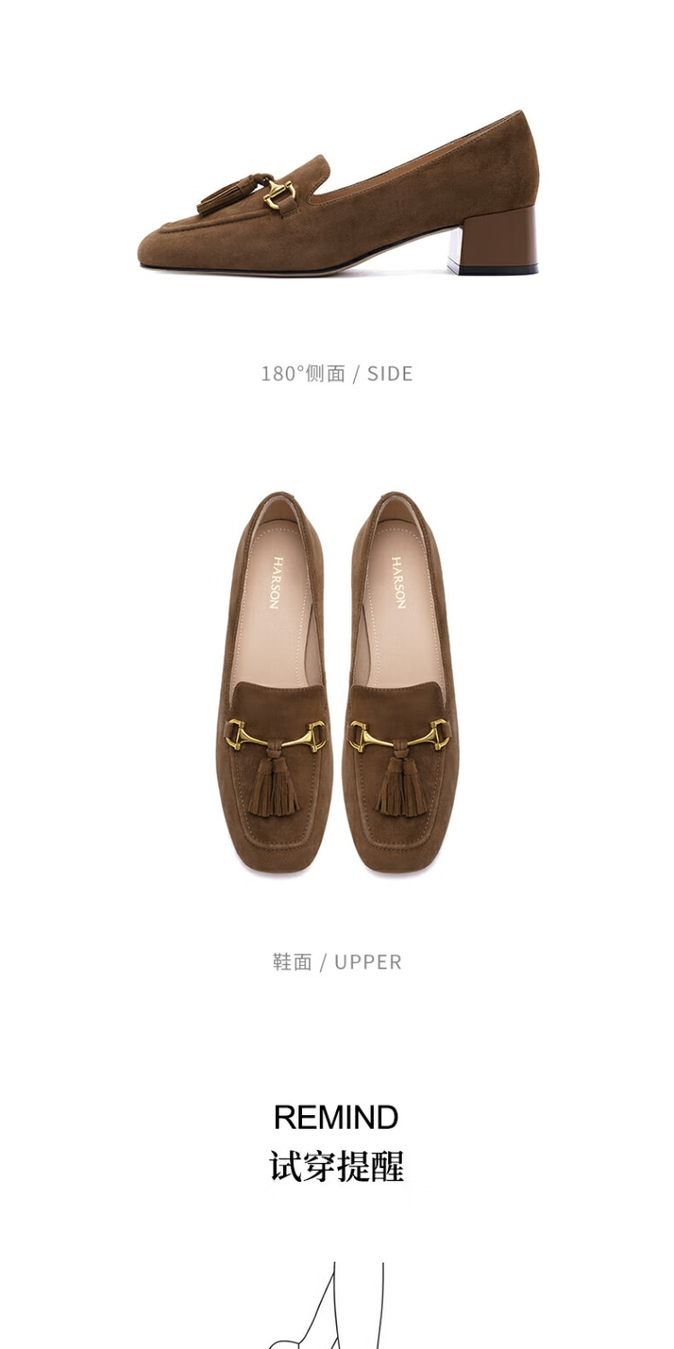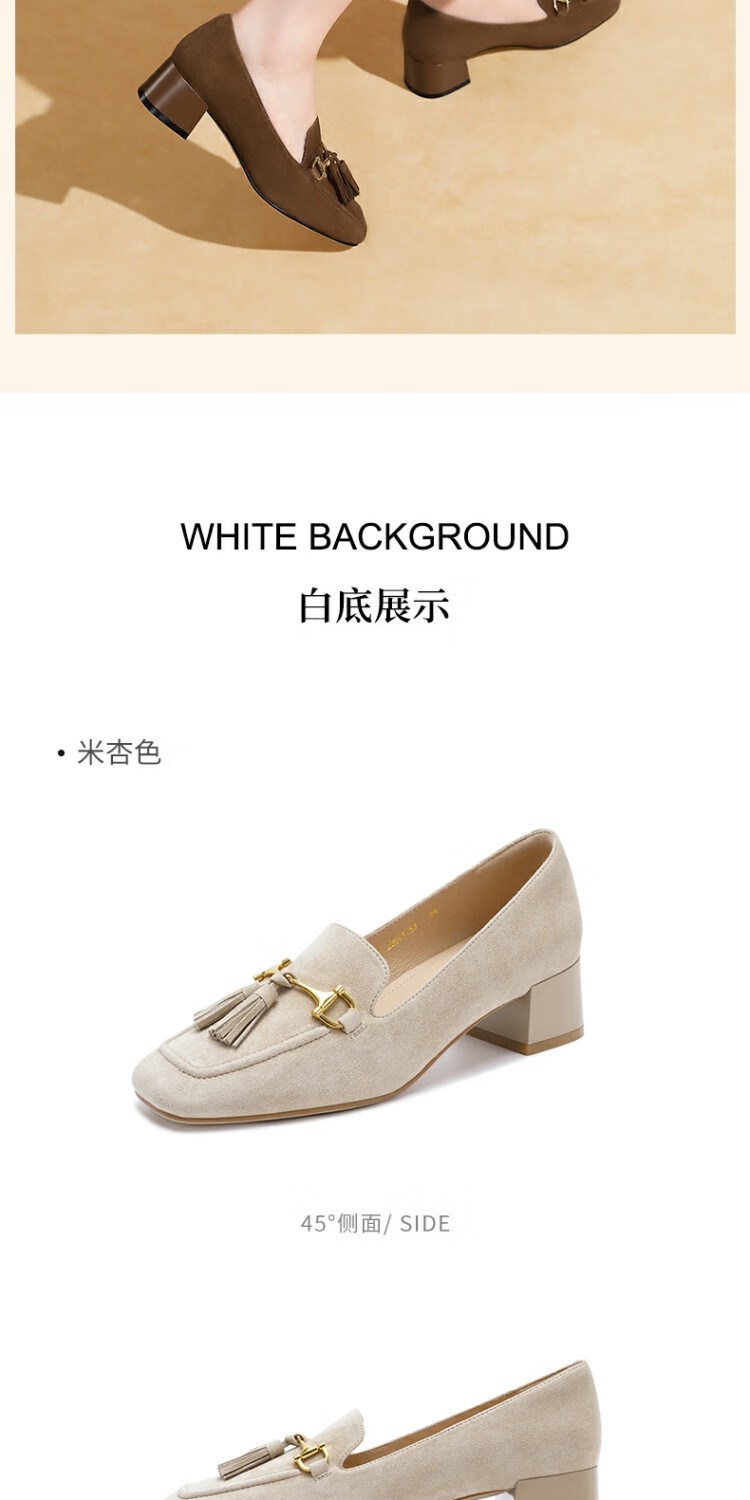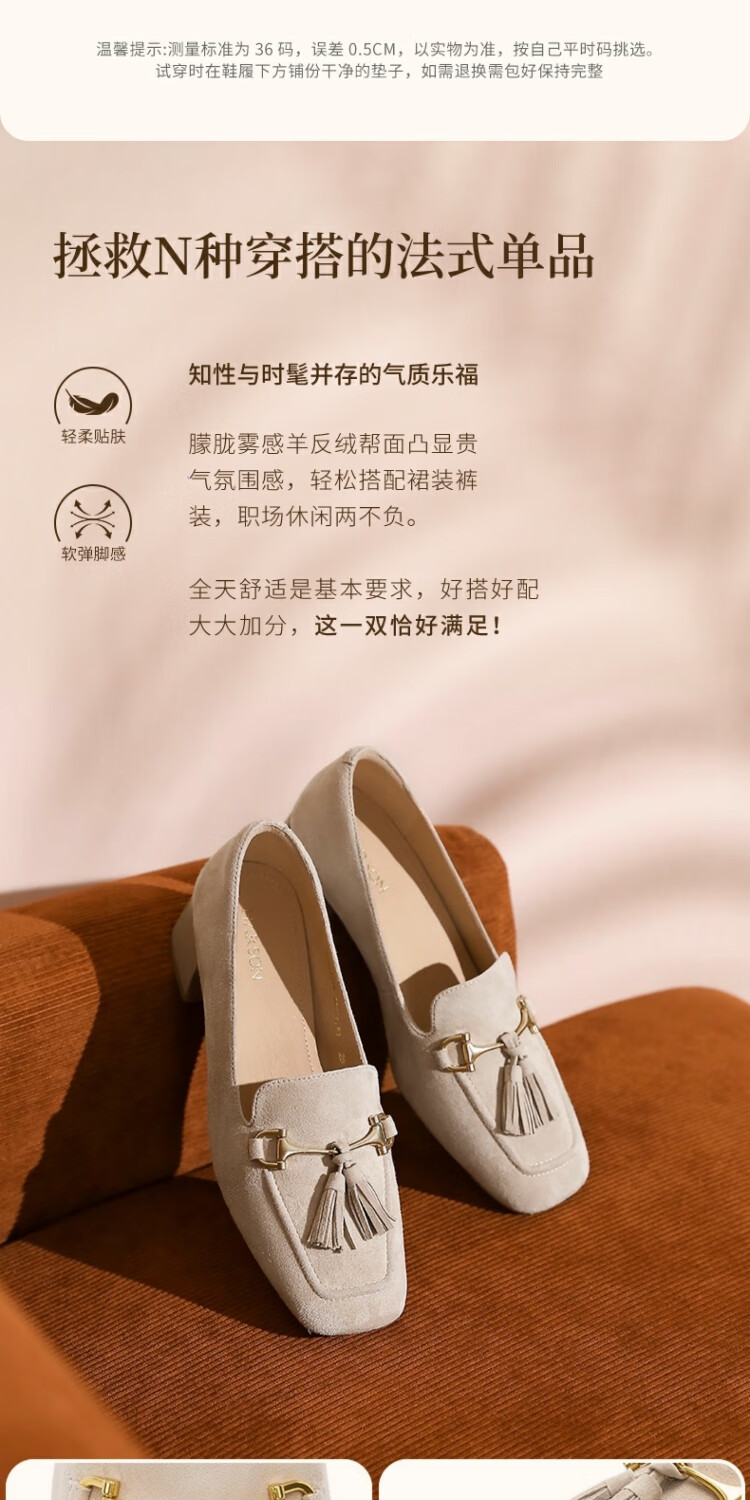 哈森绒面流苏乐福鞋高跟上班通勤百搭女鞋单鞋2025秋新品HL257122 米杏色 羊反绒面革 36