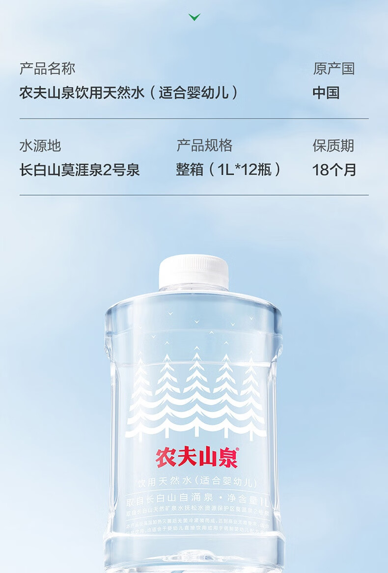 农夫山泉 饮用水 饮用天然水(适合婴幼儿) 1L*12瓶 整箱装