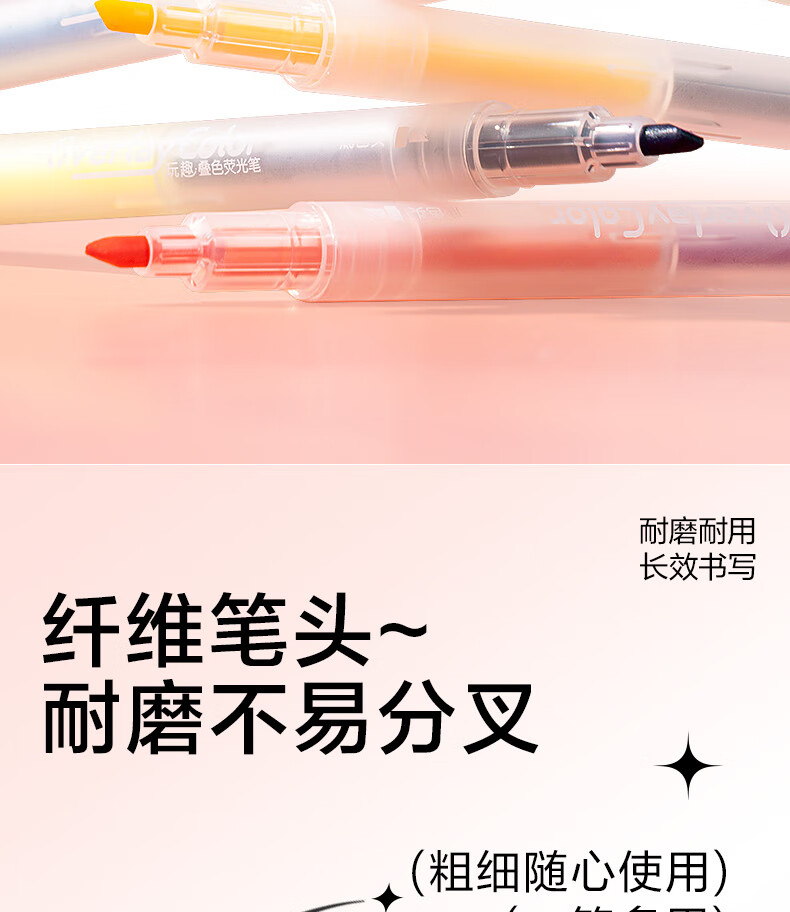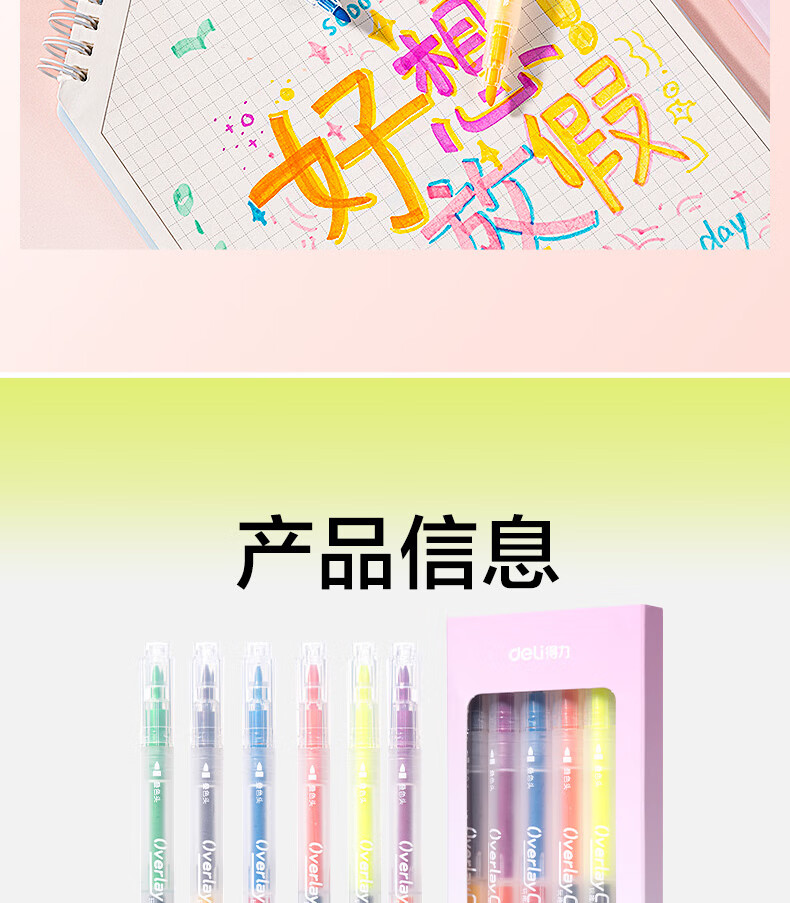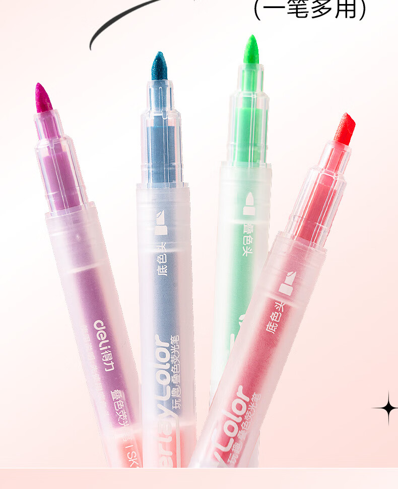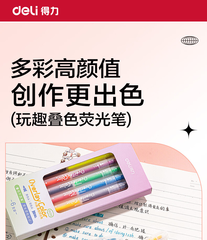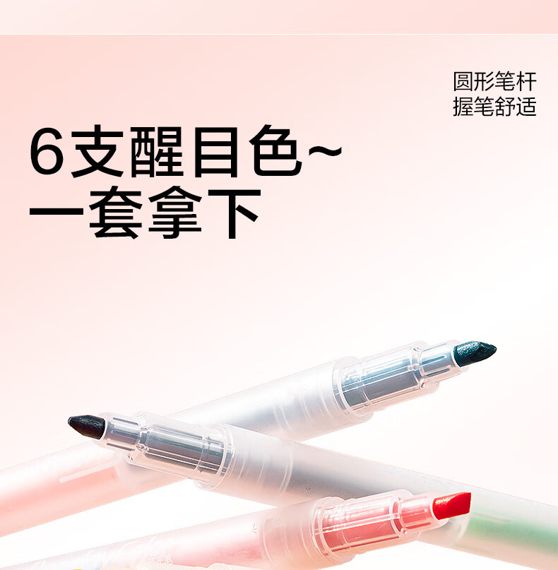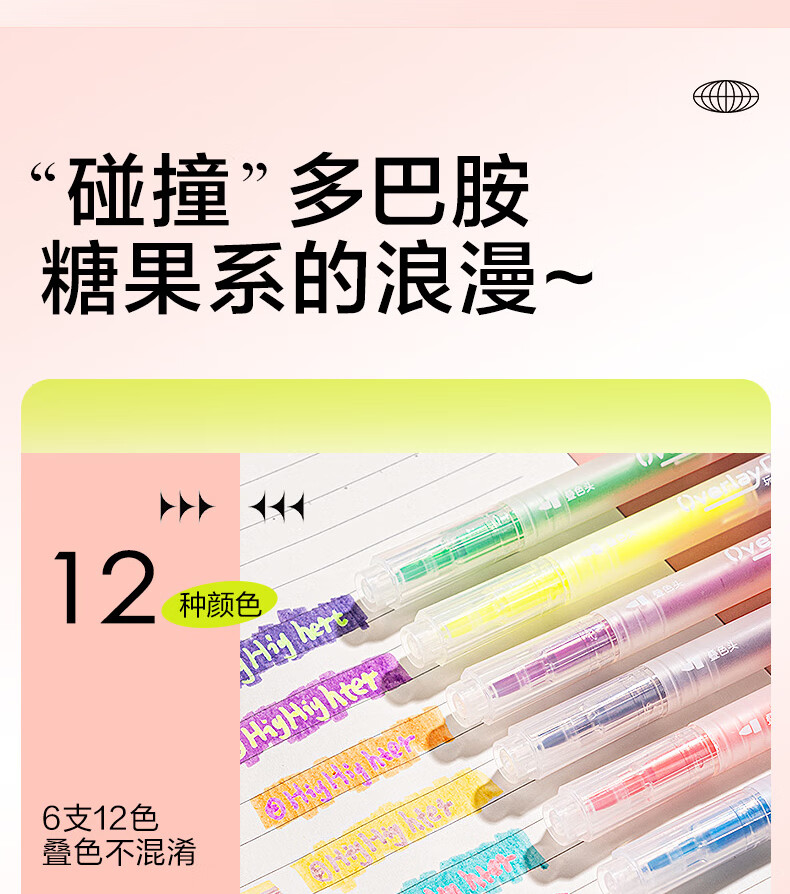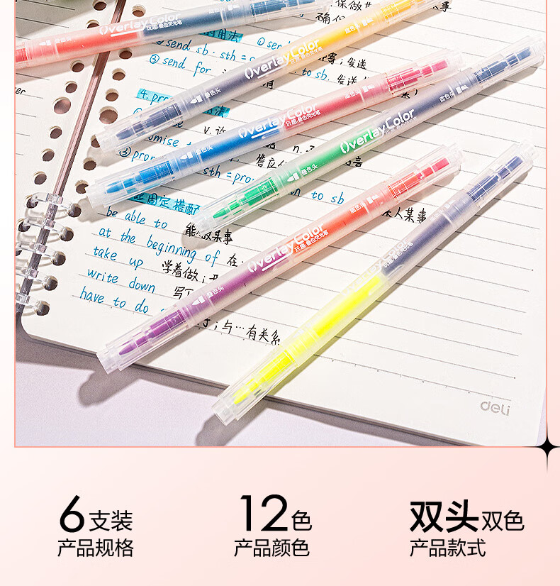得力叠色荧光笔划重点笔不晕染彩色记号笔标记笔高颜值手抄报专用笔银光笔彩笔做笔记手帐工具背书神器 【多巴胺】6支12色
