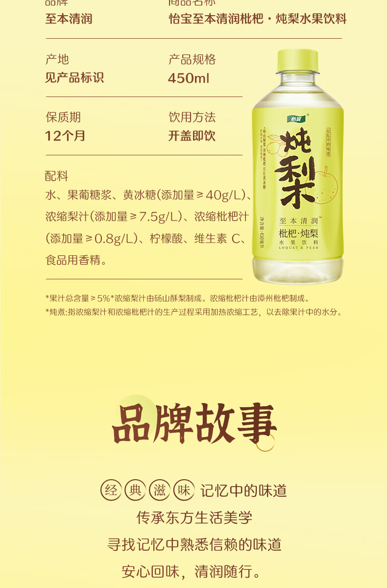 怡宝至本清润枇杷·炖梨水果饮料450ml*15瓶/整箱【特价】25.3月起产