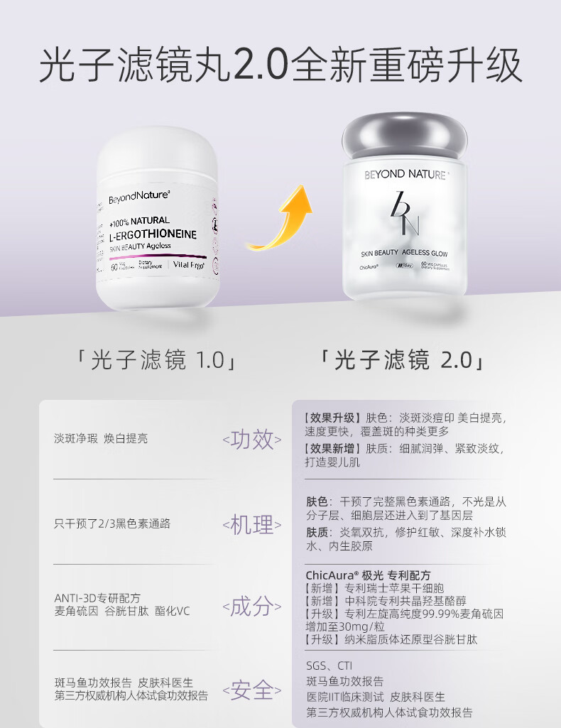 Beyond Nature蓓养乐麦角硫因光子滤镜丸2.0谷胱甘肽内服美白淡斑抗衰老紧致女