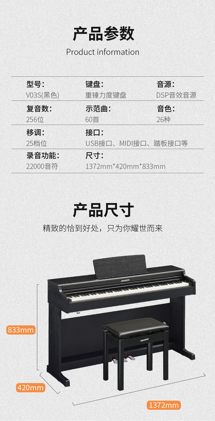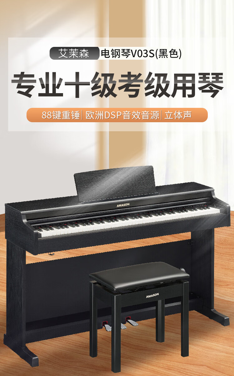 艾茉森(Amason)珠江钢琴 考级电钢琴88键重锤数码电子钢琴专业成人儿童V03S黑