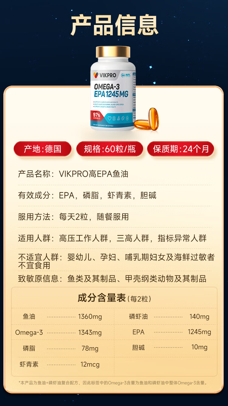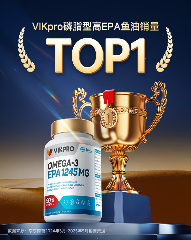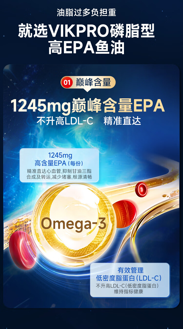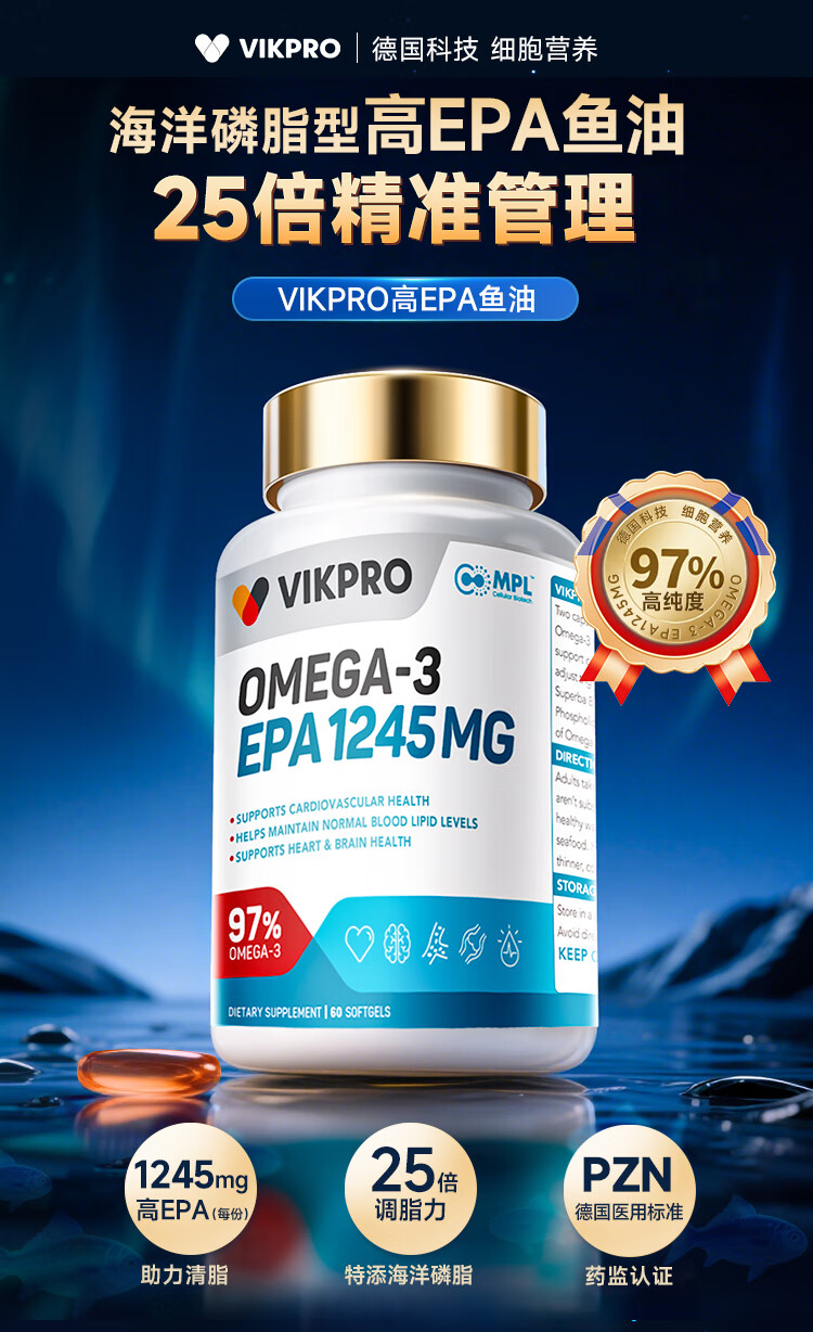 vikpro 97%高EPA鱼油60粒*2瓶 高吸收高纯度深海鱼油磷脂型omega-3