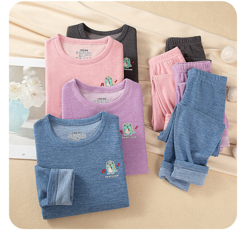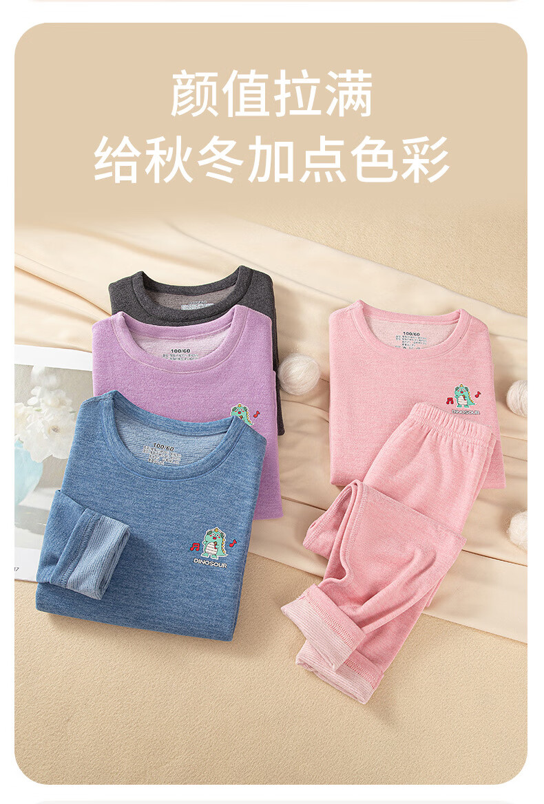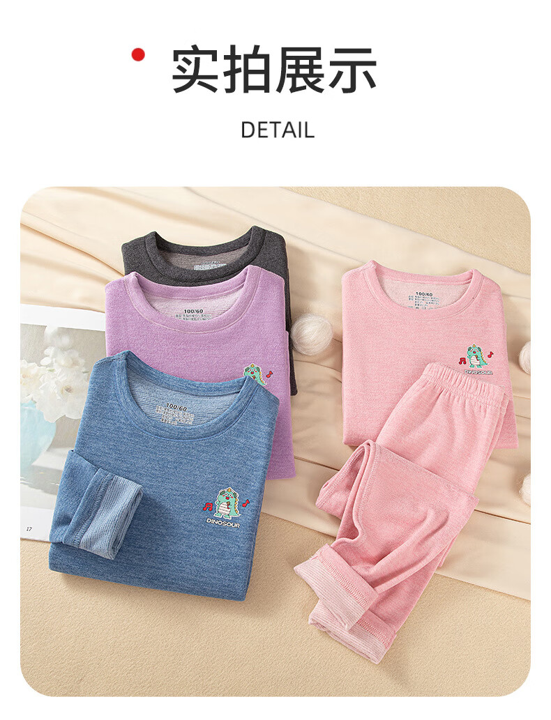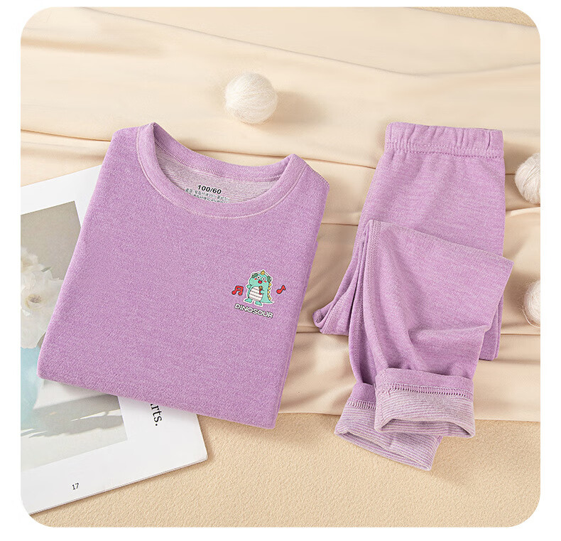 有只绵儿童保暖内衣套装羊绒蚕丝德双面绒磨毛男女童秋冬加厚两件套 山羊绒蚕丝恐龙紫色 均码 110cm