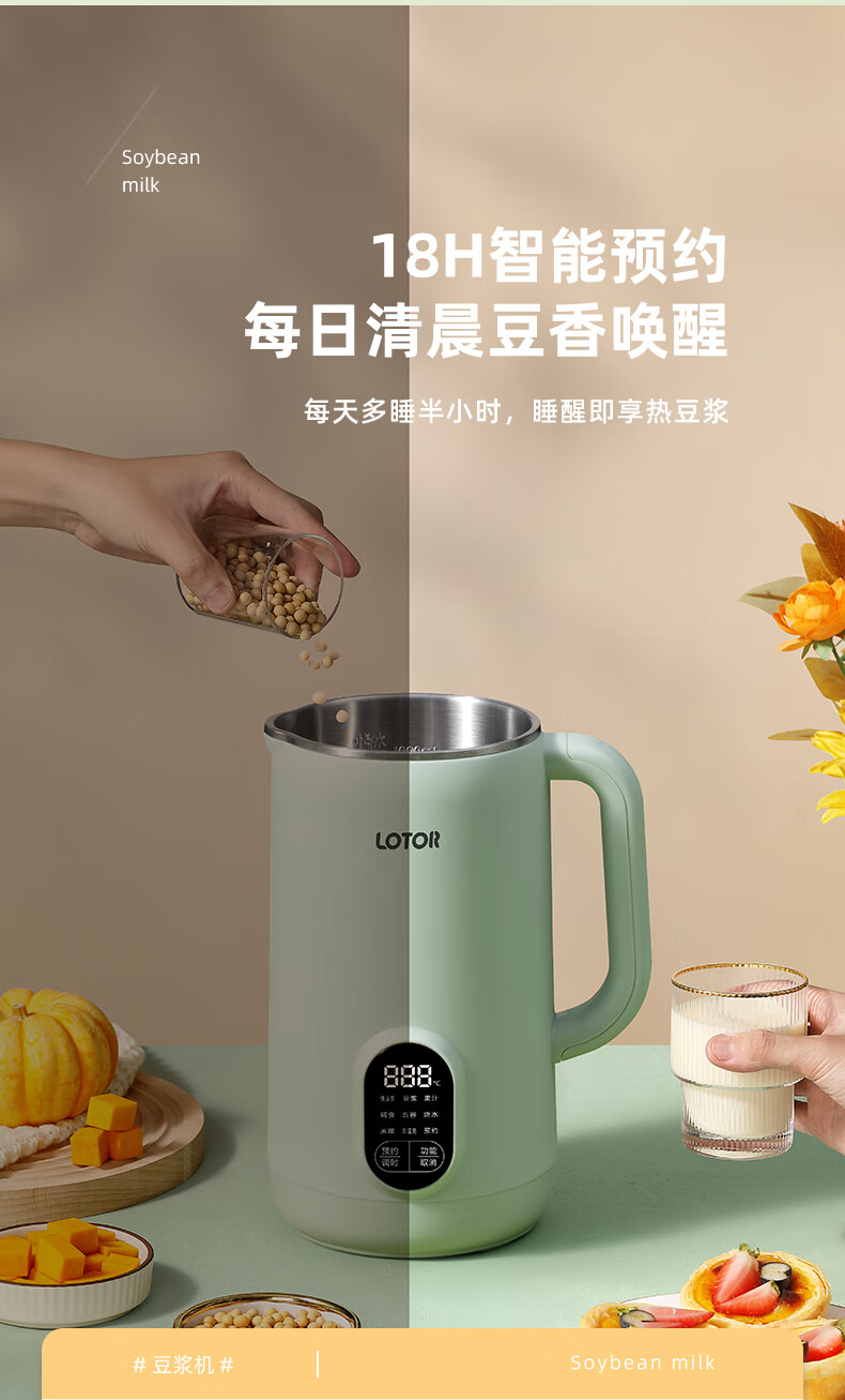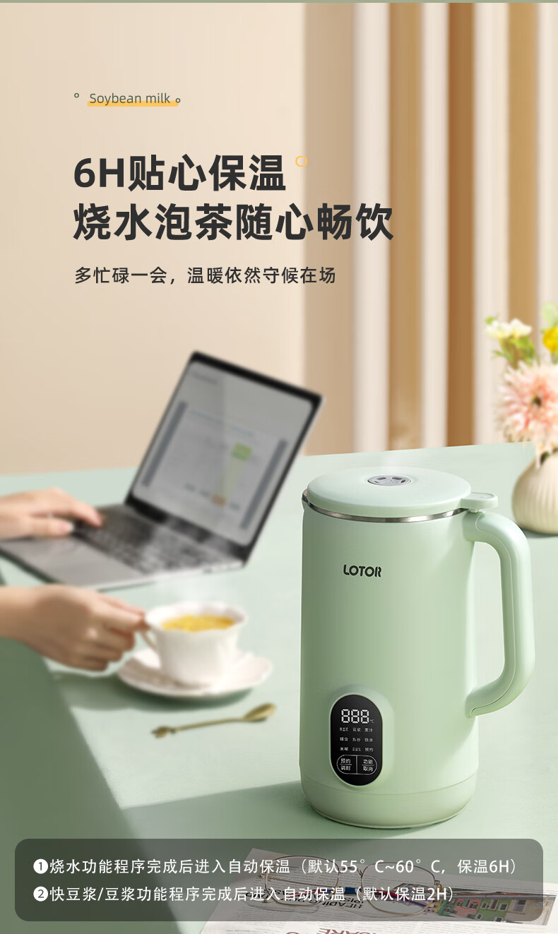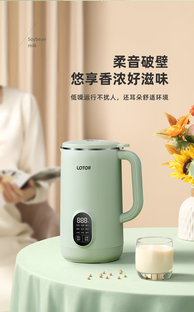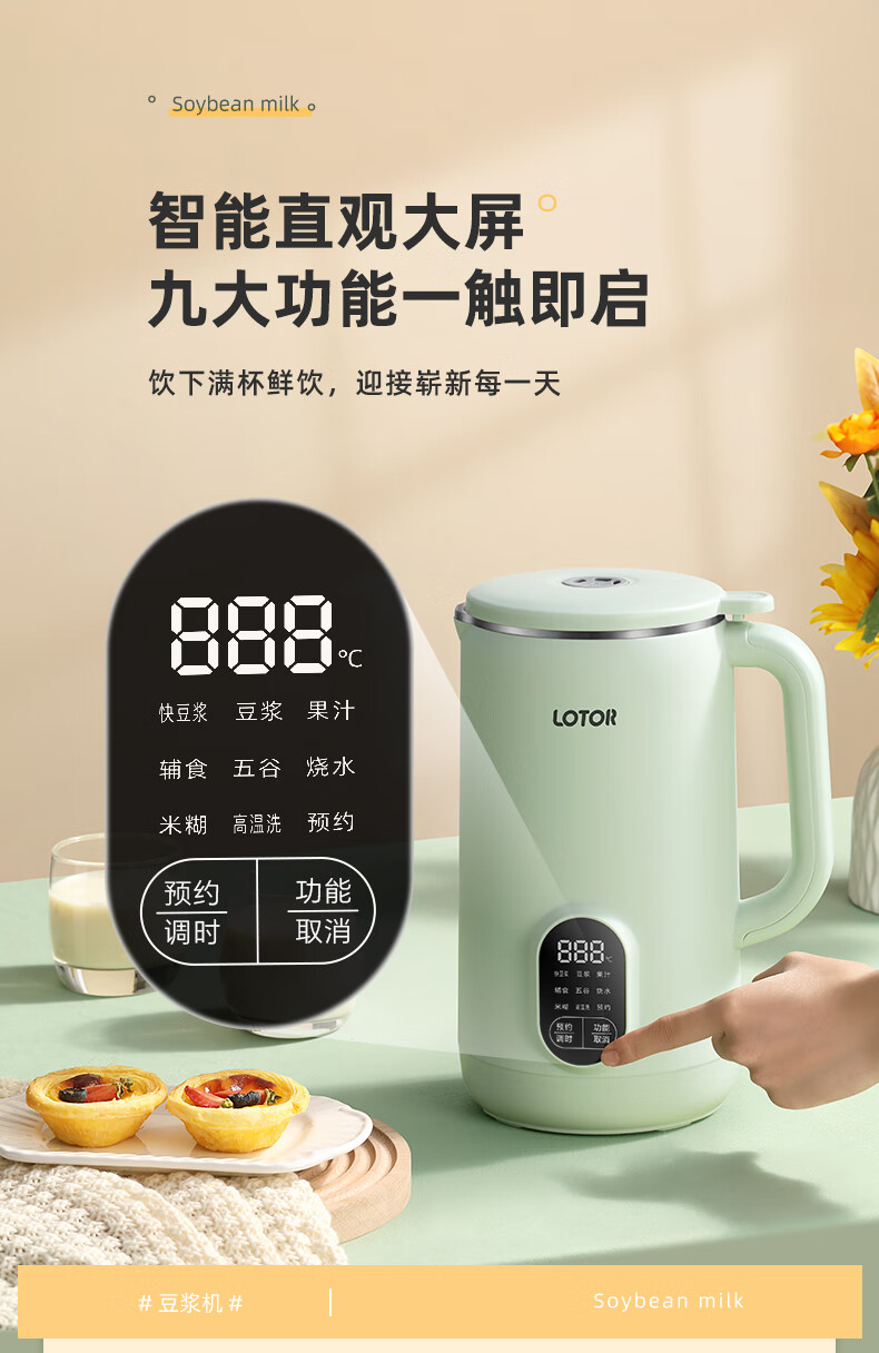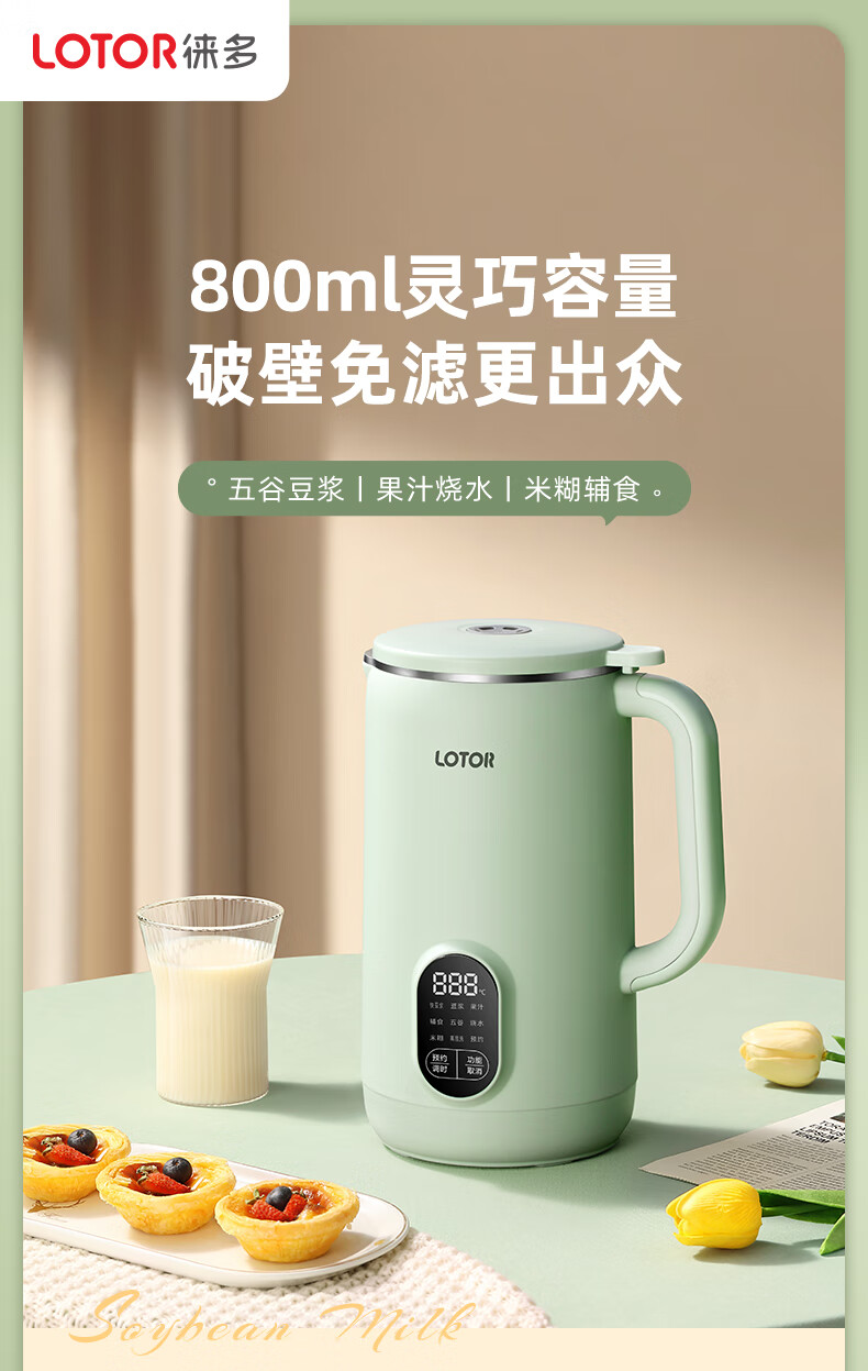 LOTOR迷你豆浆机家用小型破壁机五谷杂粮全自动免过滤1-2人食3米糊榨汁机 绿色 1L 大屏款