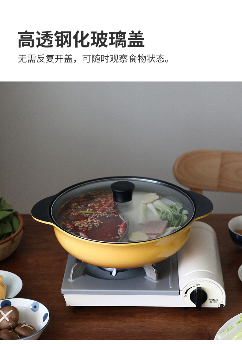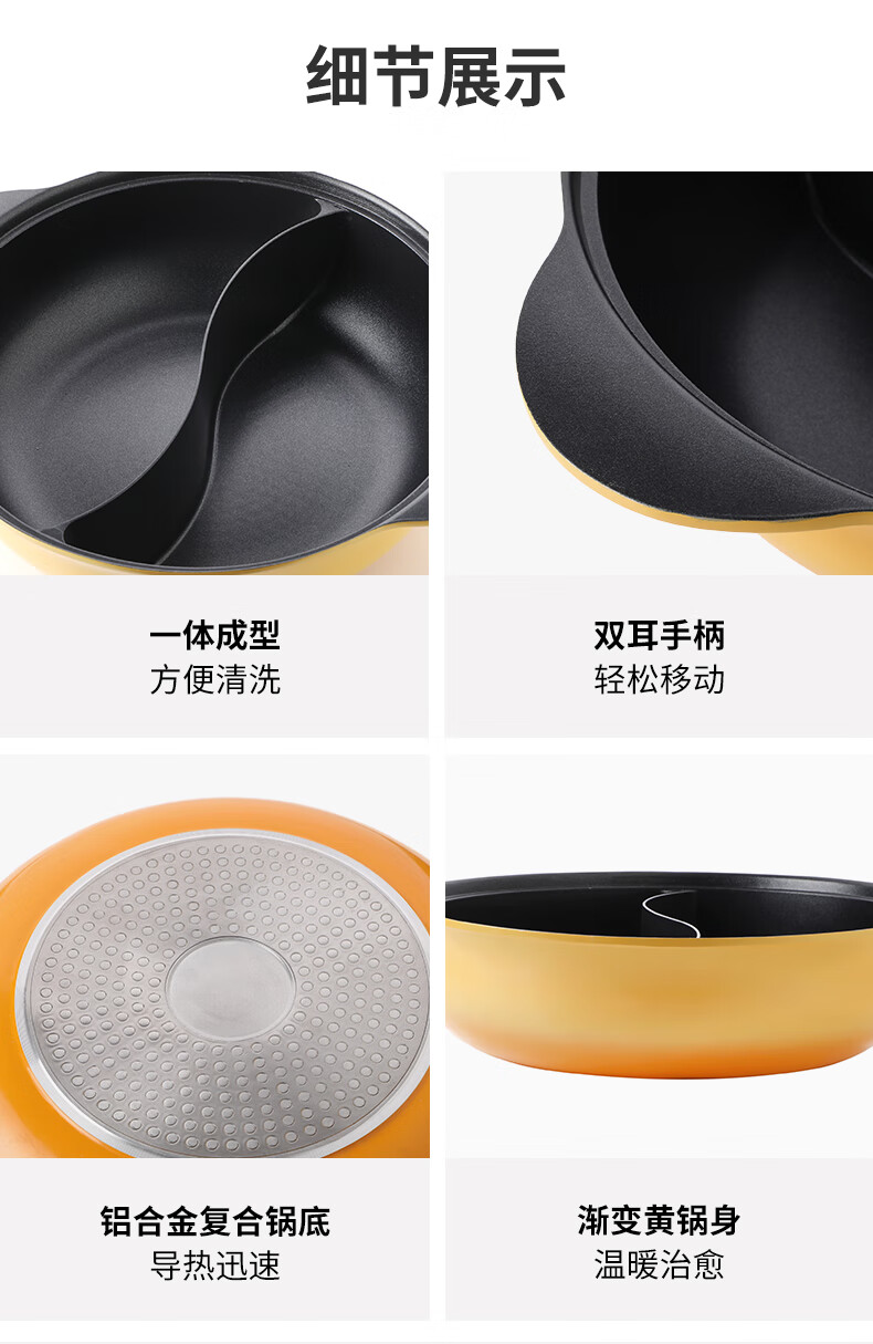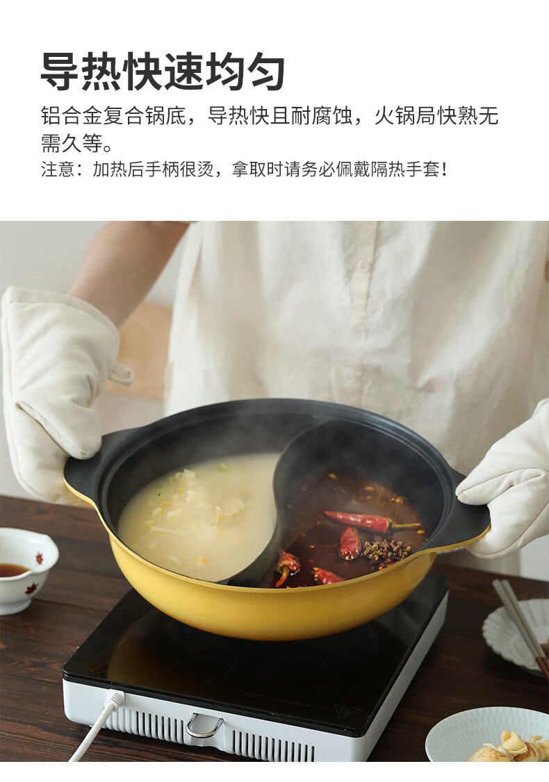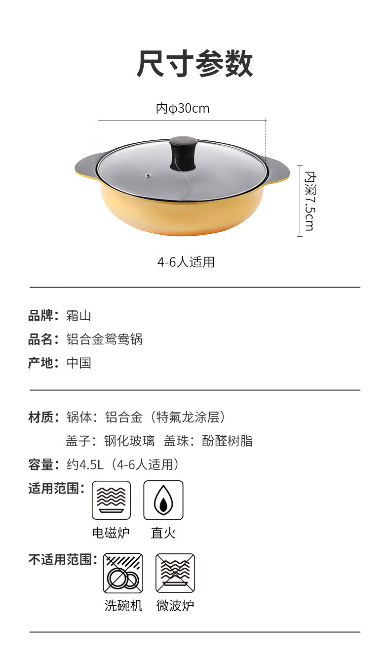 霜山鸳鸯锅家用铝合金火锅专用双耳带盖不粘锅汤锅大容量一体涮锅 S型分格鸳鸯锅-直径 30cm