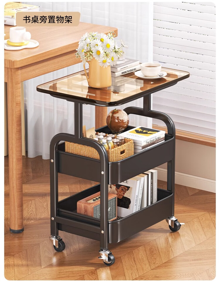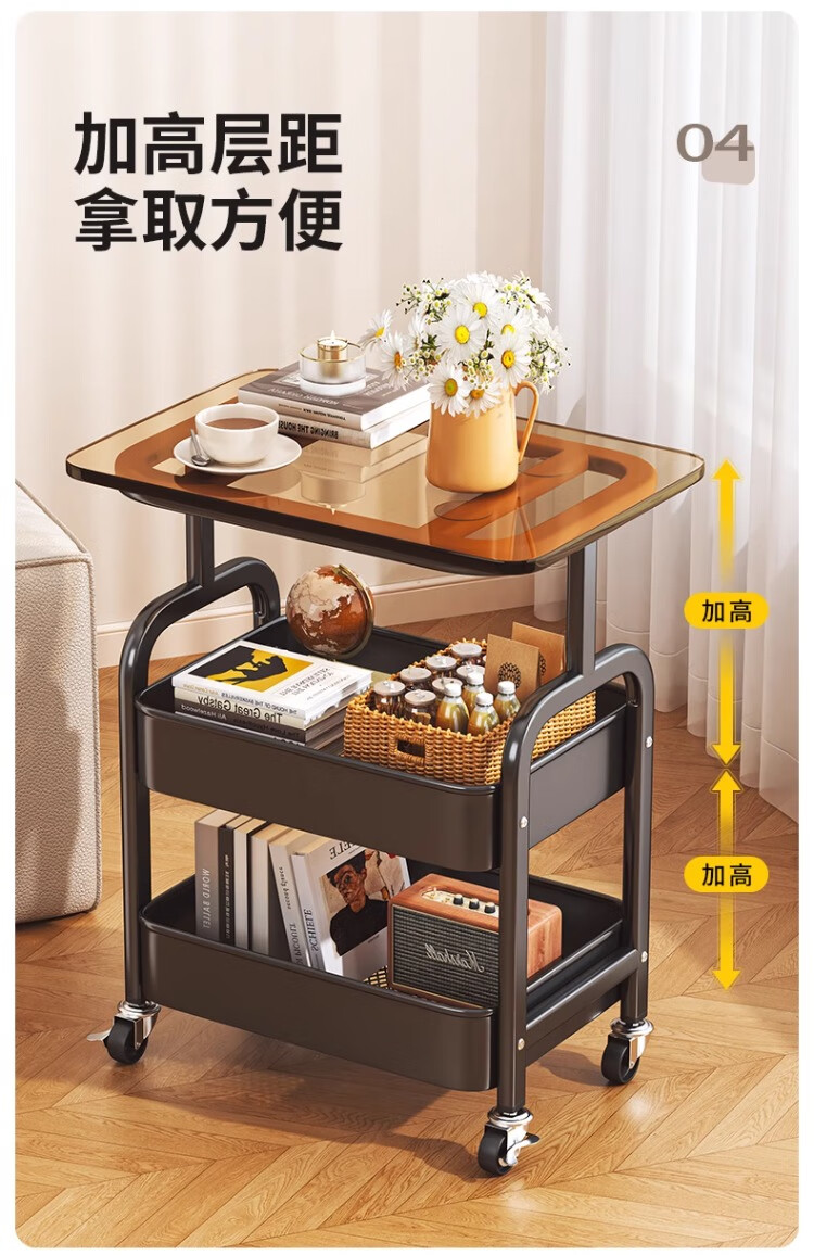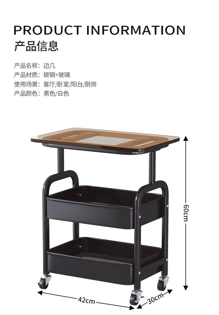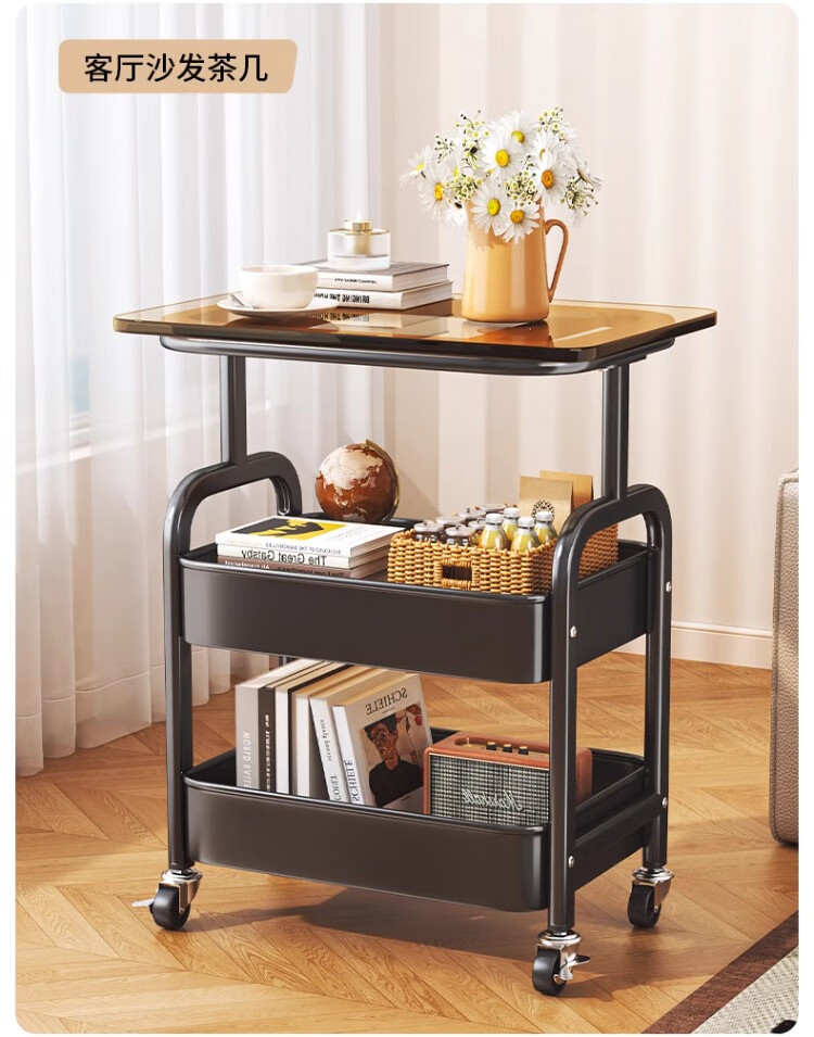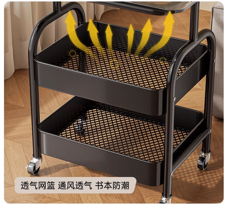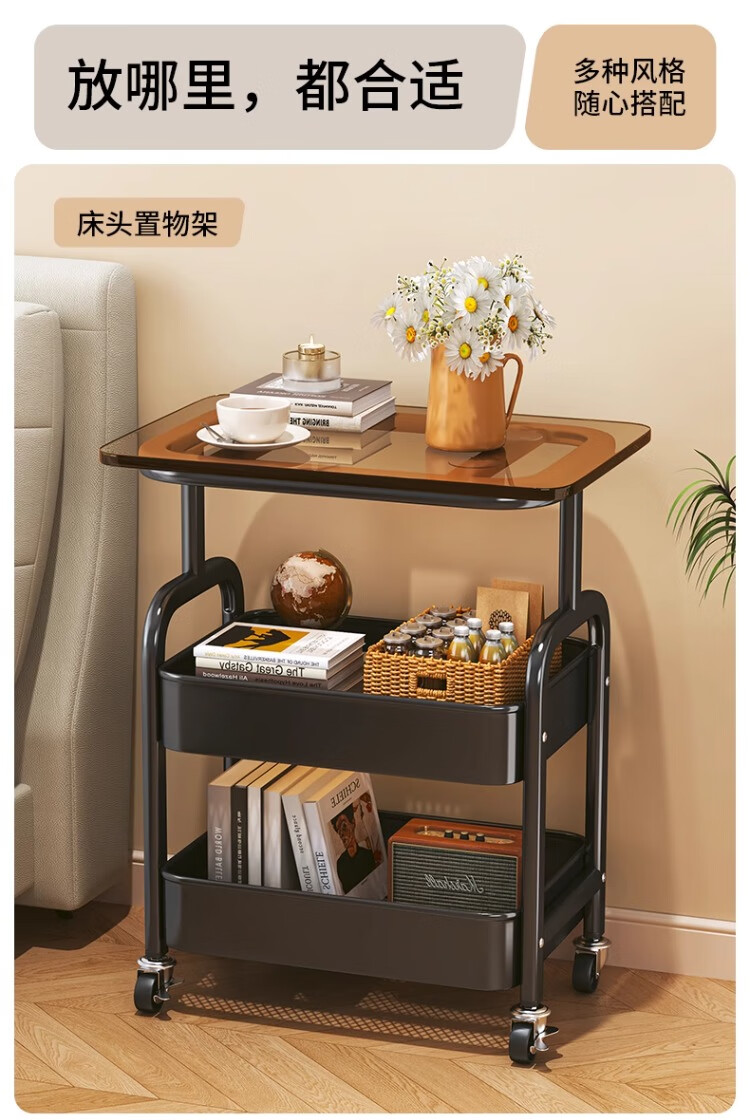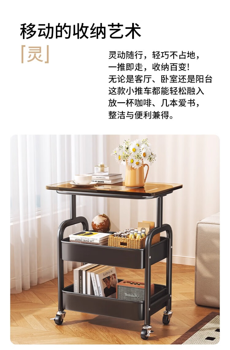 衣炫中古小推车置物架可移动沙发边几收纳柜架子床边桌子零食落地床头 三层黑色【加厚木板】顶部置物+万向轮