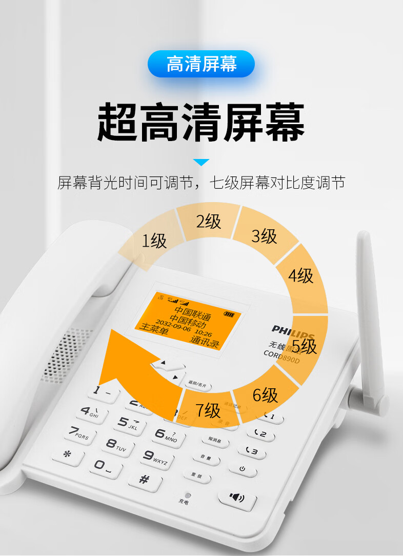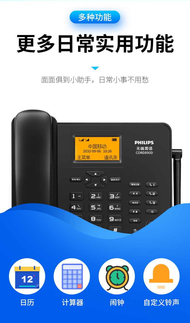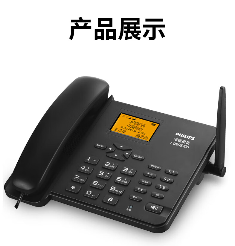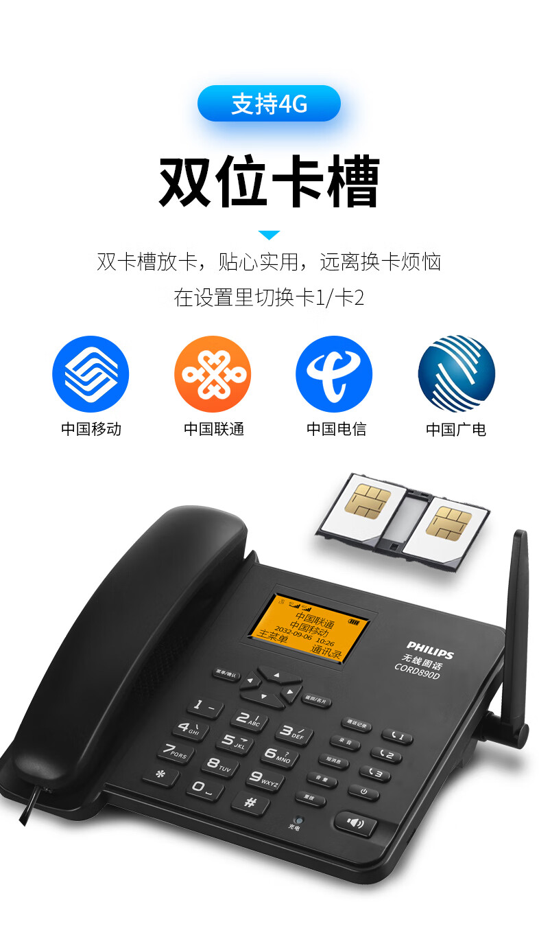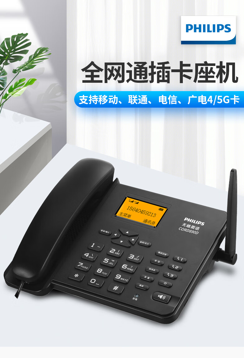 飞利浦(PHILIPS)全网通4G5G无线插卡固话电话座机电信移动联通广电4G网高清免提CORD890D 黑色