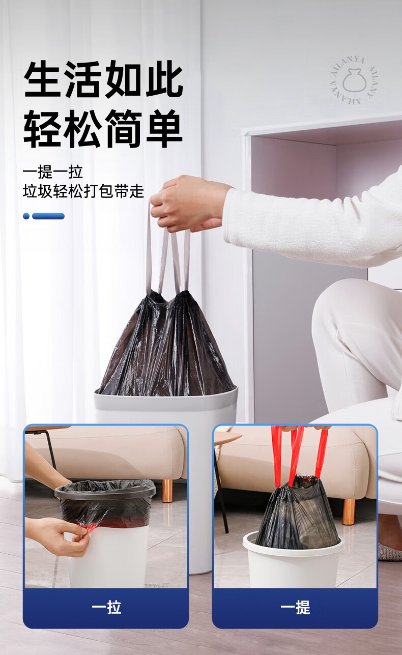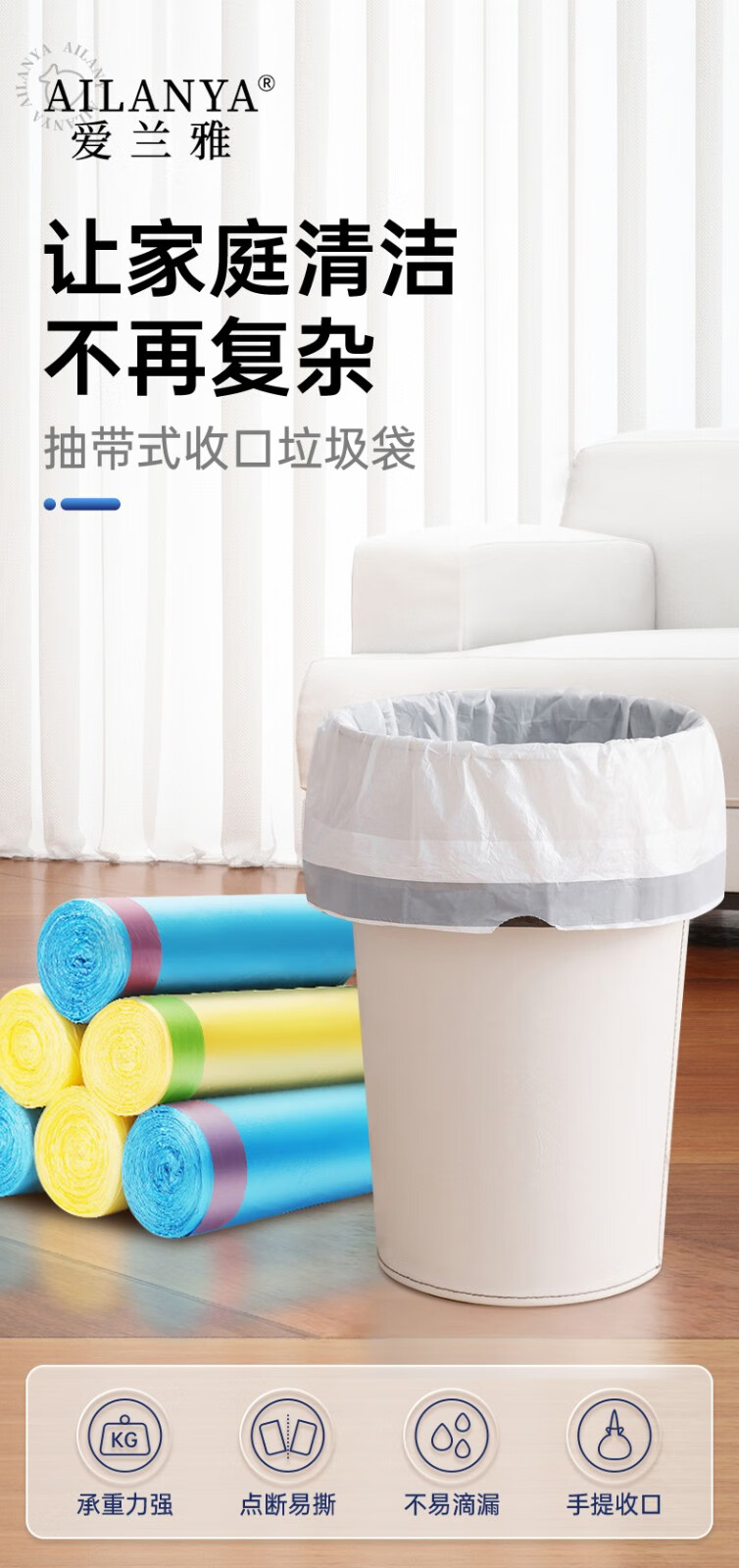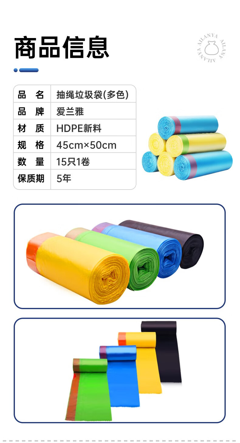 爱兰雅 垃圾袋抽绳自动收口塑料袋 家用办公厨房 加厚彩色混装随机发货 45*50抽绳150个装(10卷)
