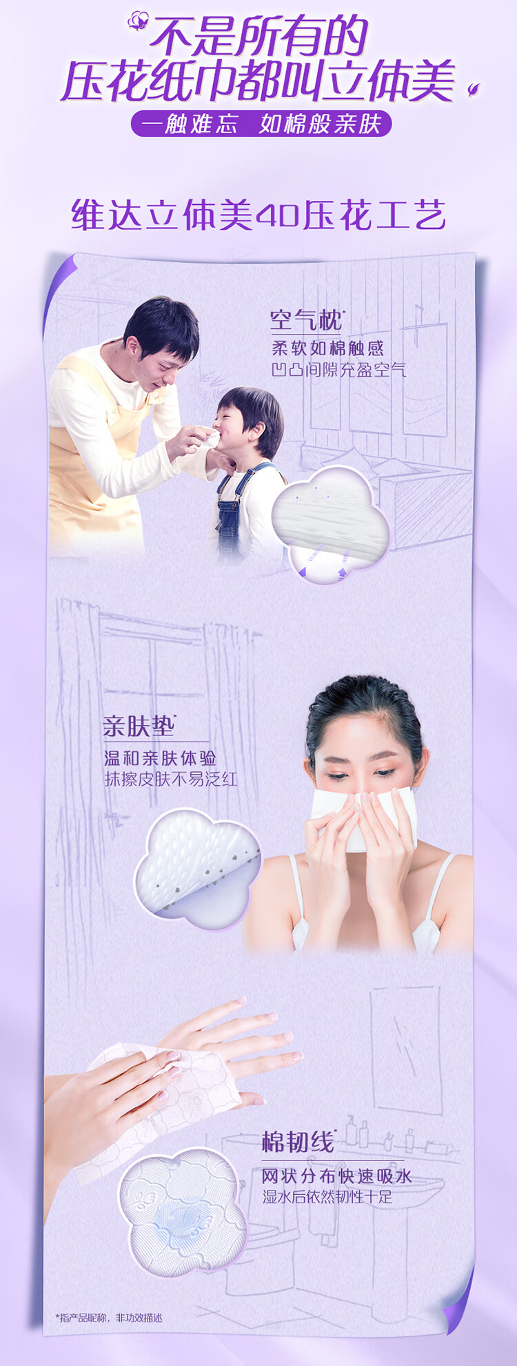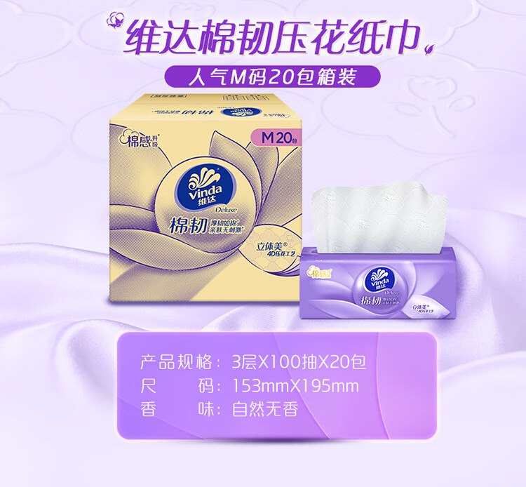 维达(Vinda)抽纸 棉韧压花立体3层M码大尺寸 擦手餐巾纸面巾厚棉亲肤原生木浆 厚韧如棉 3层 100抽*20包 整箱装