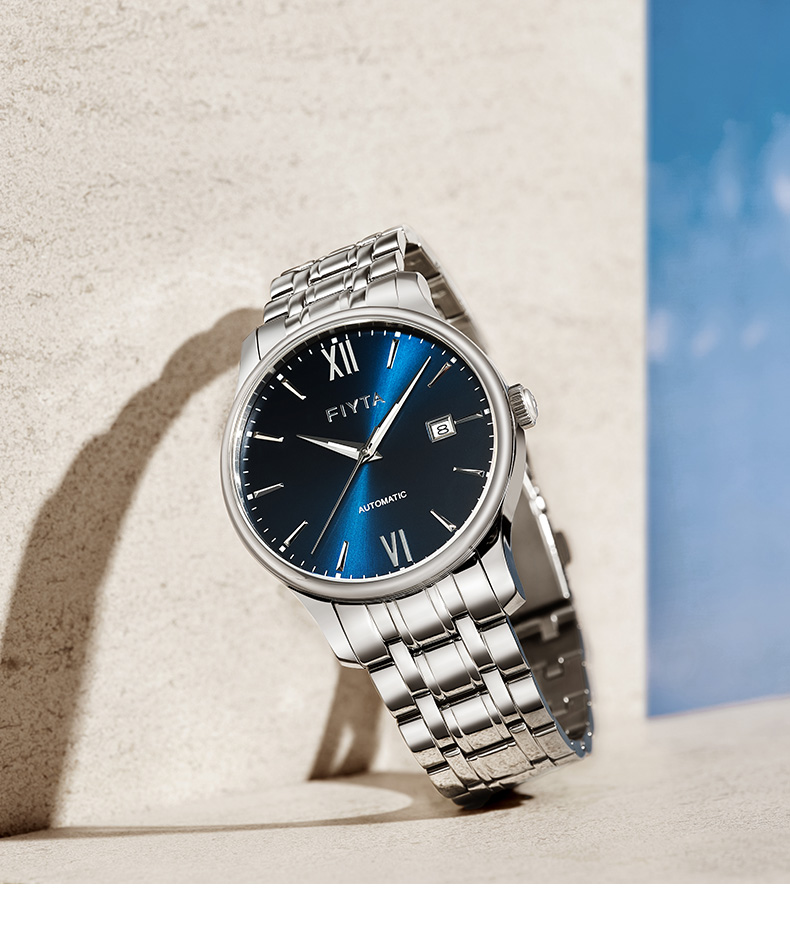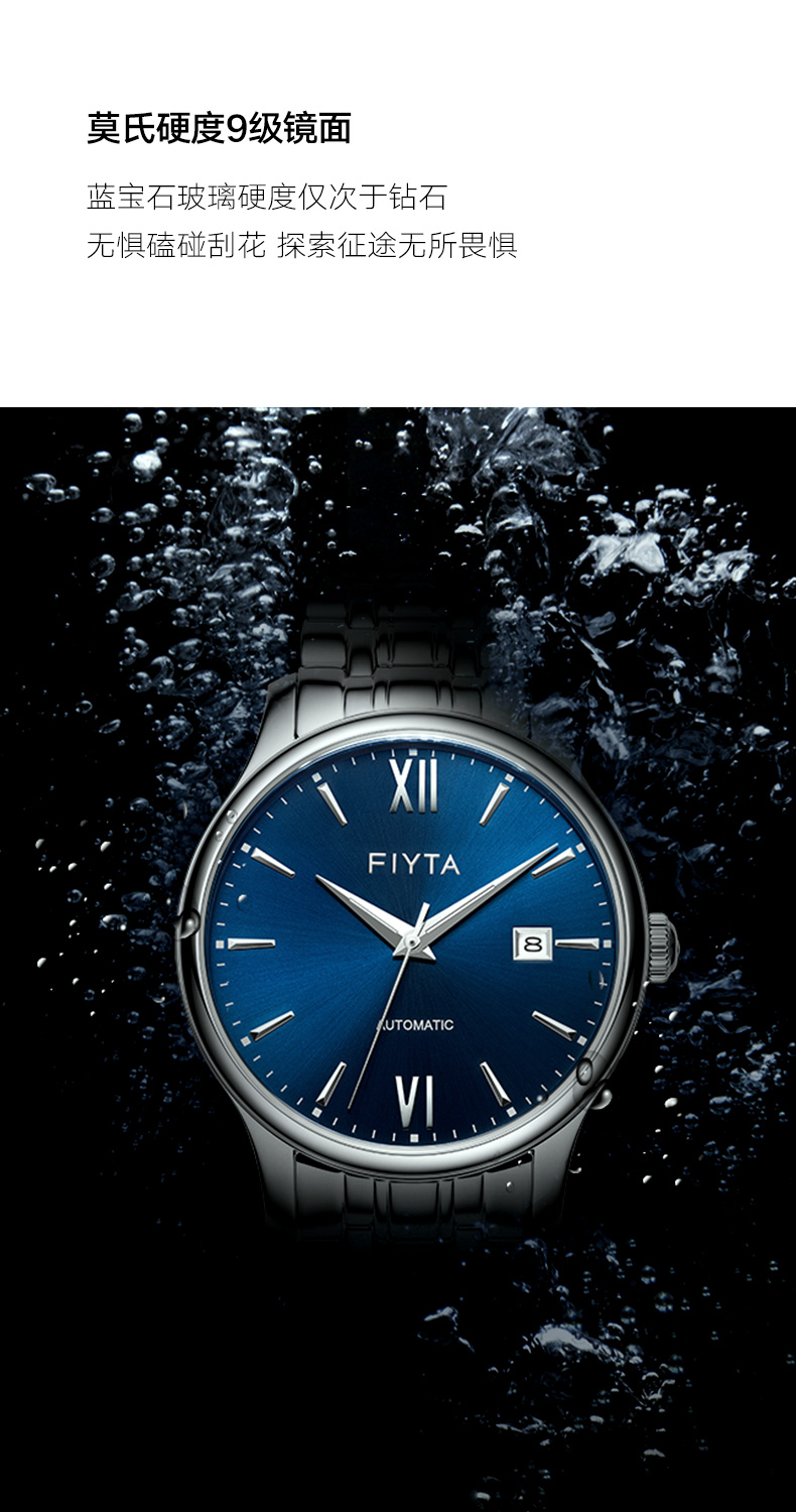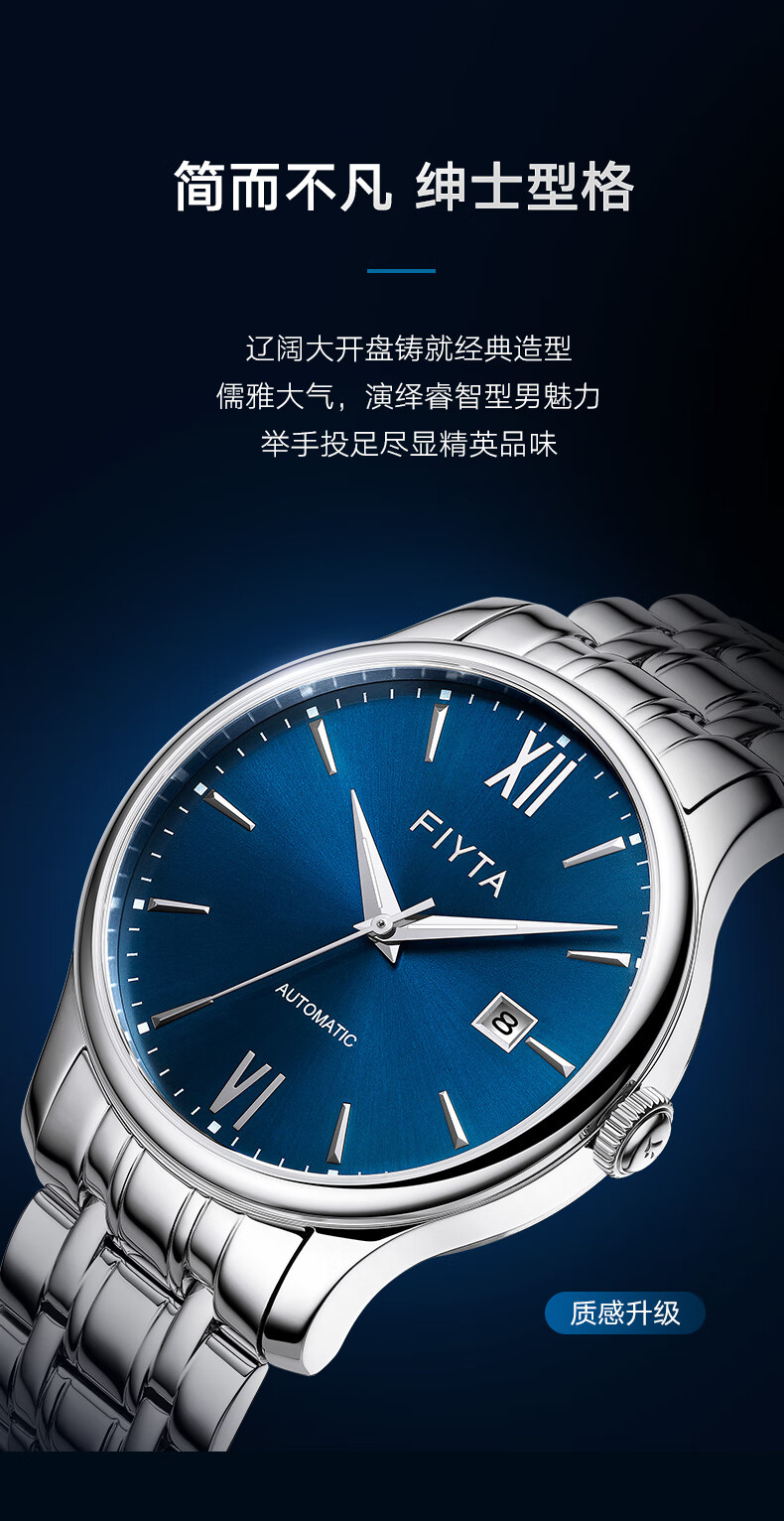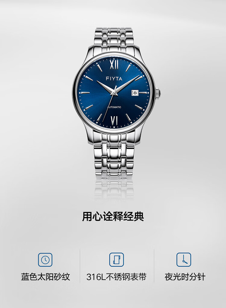 飞亚达(FIYTA)手表男 经典系列带日历蓝盘钢带自动机械男表 节日生日礼物