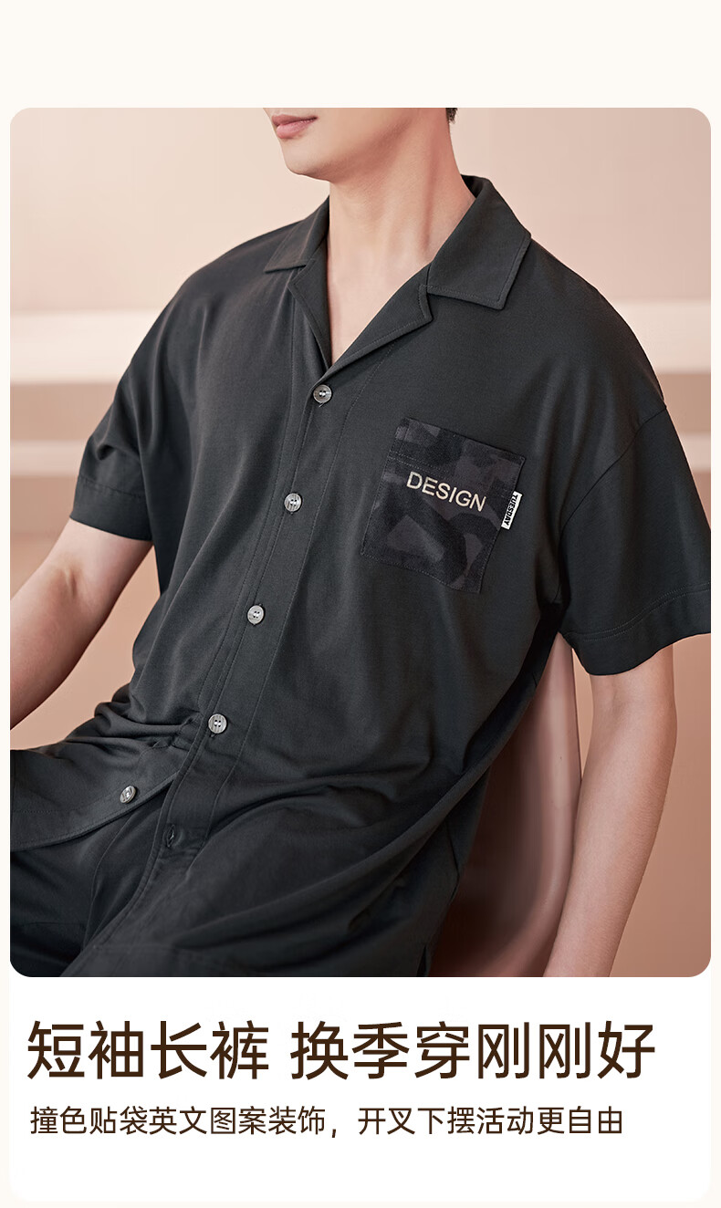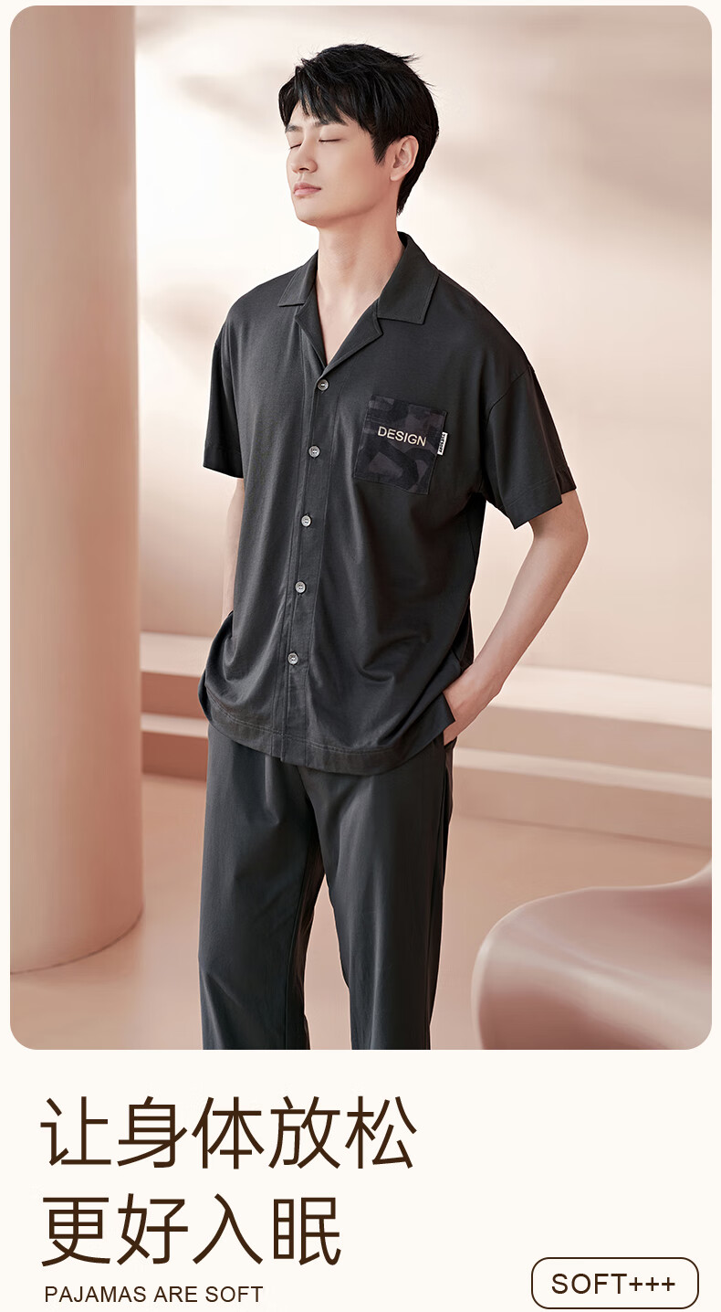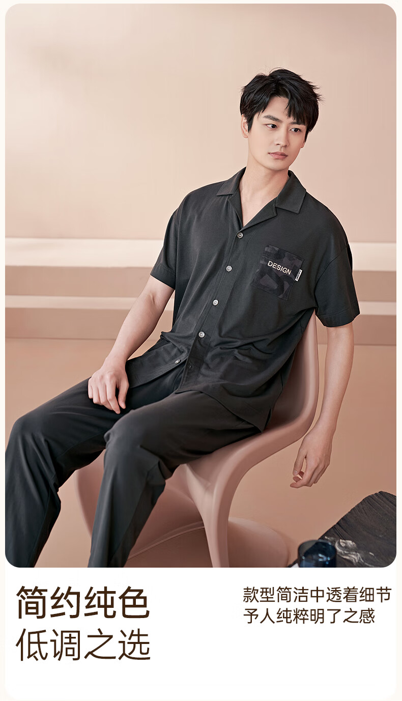 玛伦萨【5A抗菌】纯棉睡衣男夏季2025新款纯色短袖长裤男士家居服套装 碳灰 L