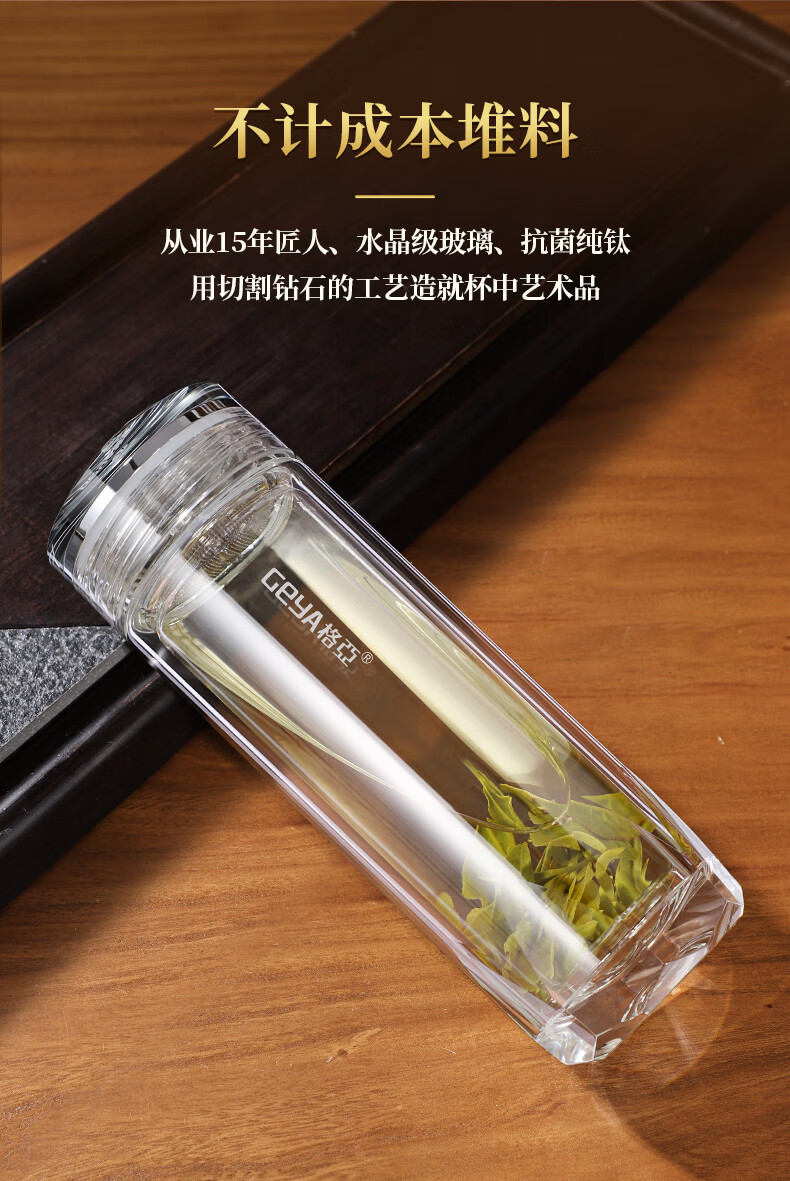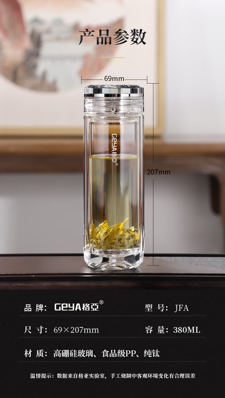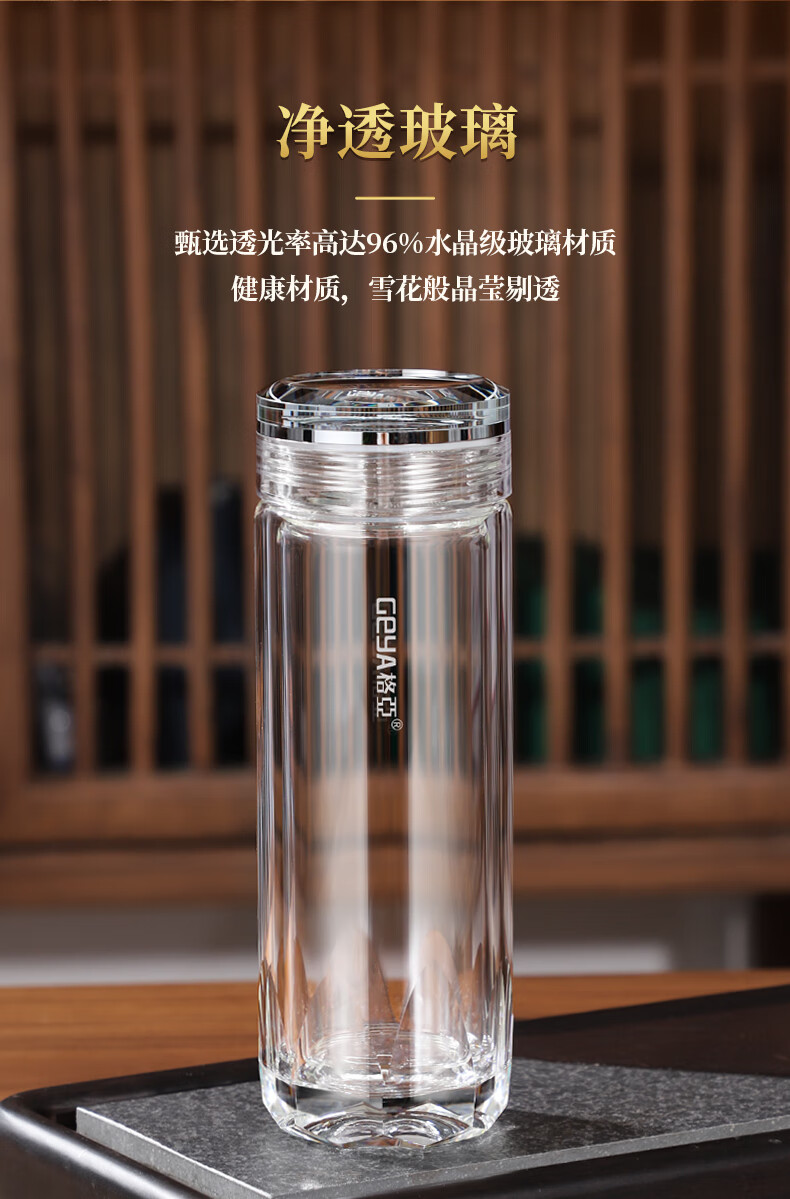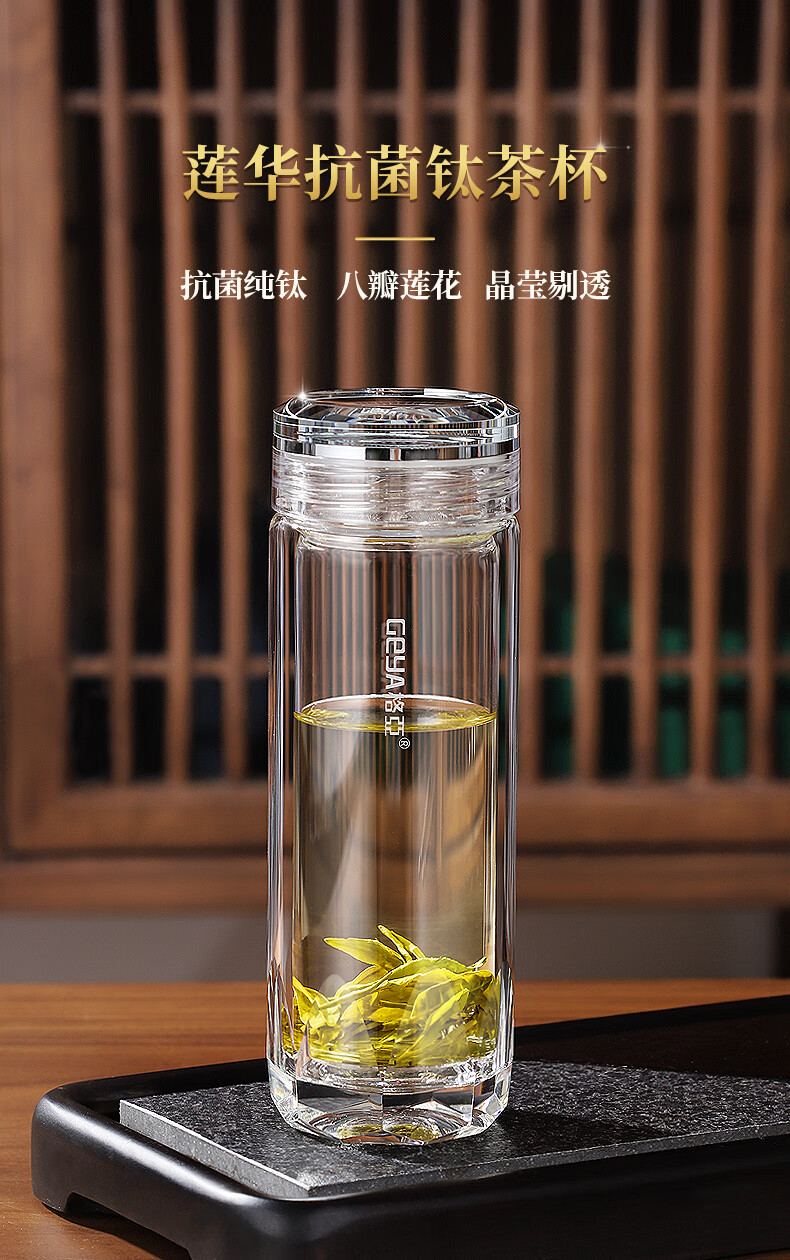 格亚(GEYA)莲华菱形抗菌钛茶杯双层玻璃杯抑菌玻璃茶杯男士玻璃水杯子定制 莲华【礼盒装】380ml