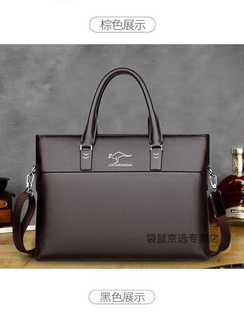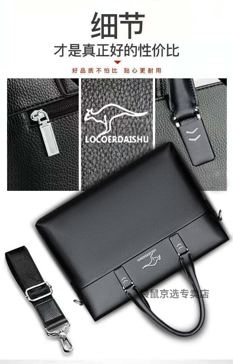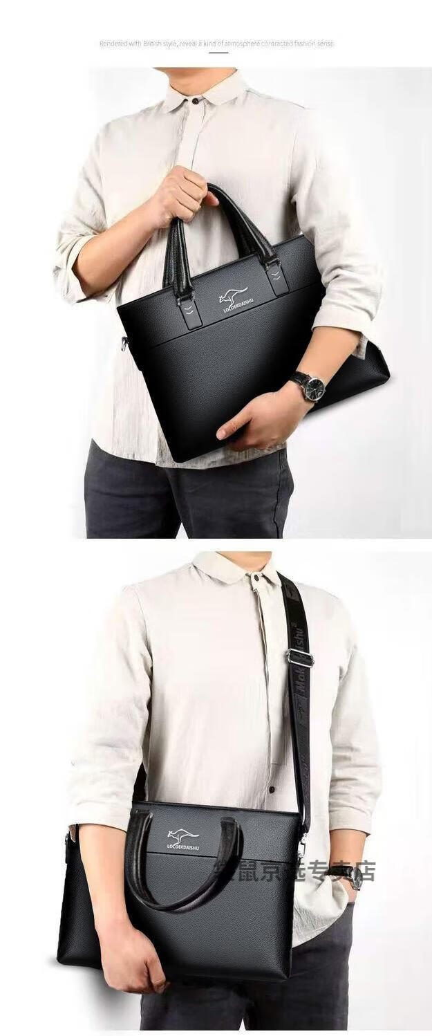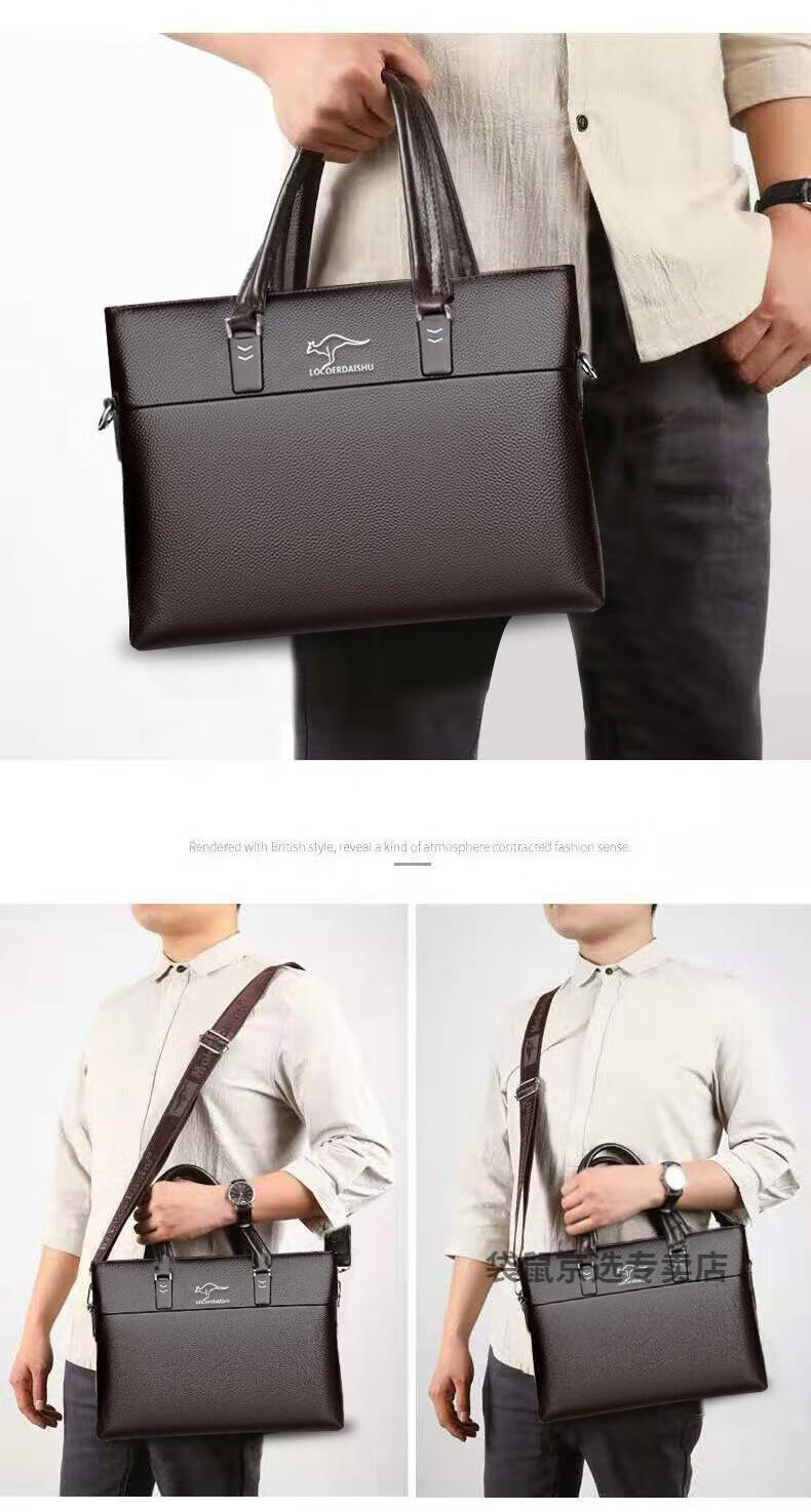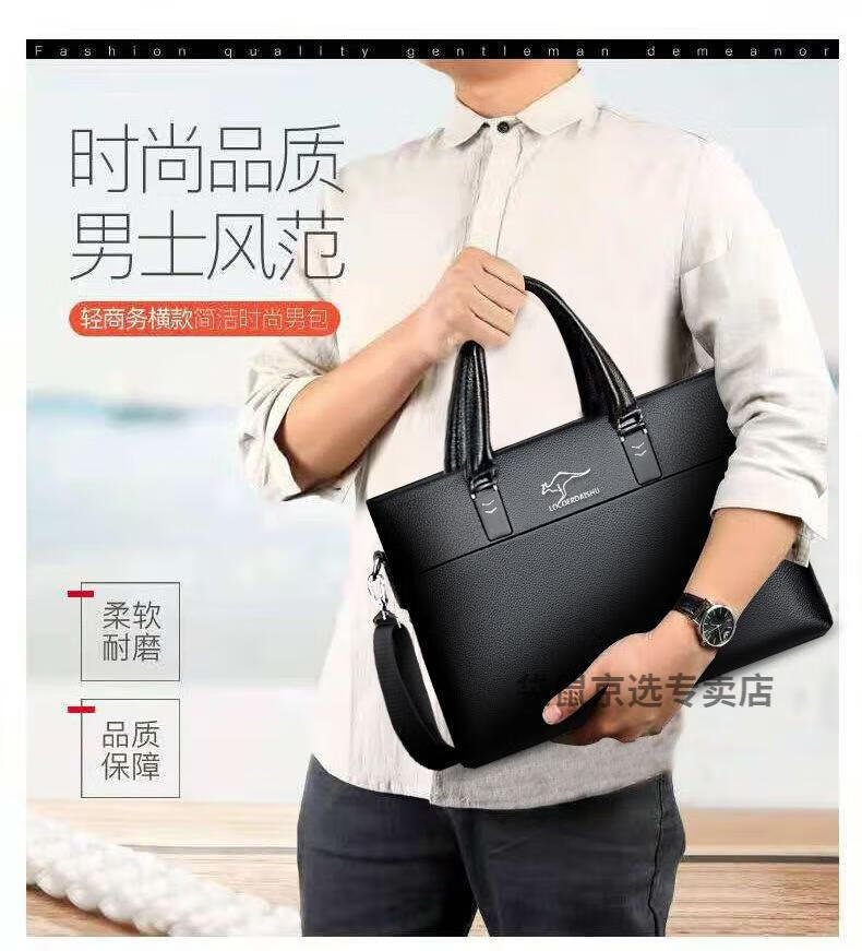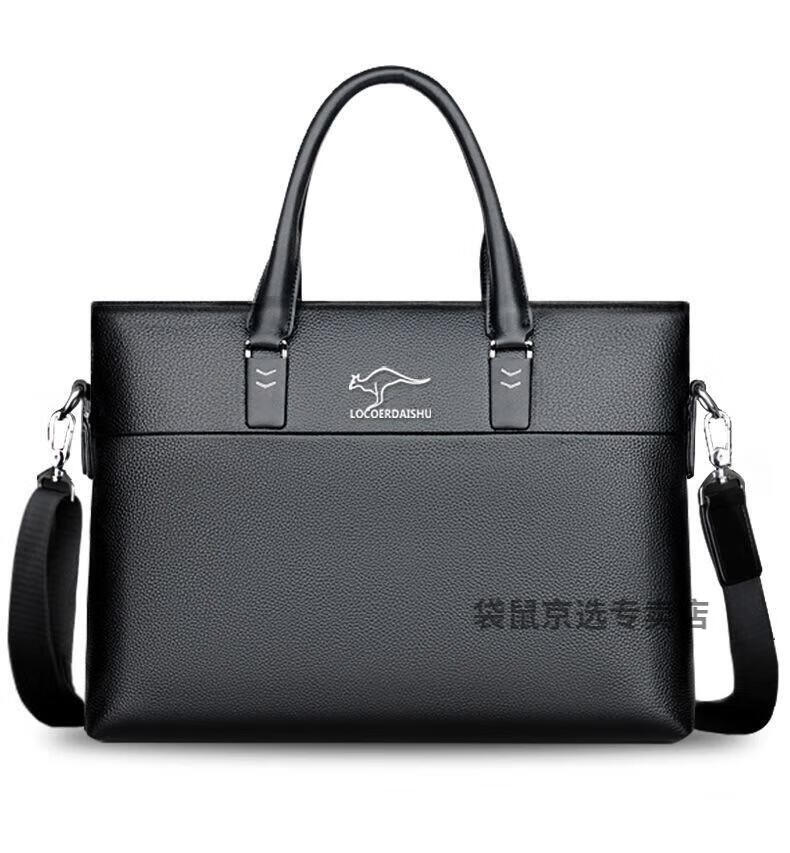 袋鼠轻奢品牌真皮质感男男士横款手提包公文包挎包商务包电脑包男斜挎 黑色升级加厚面料
