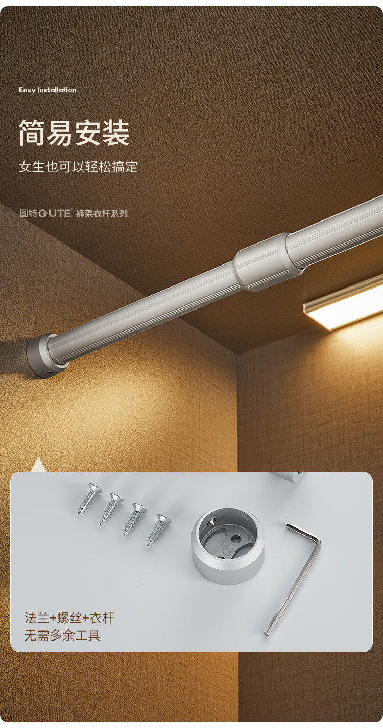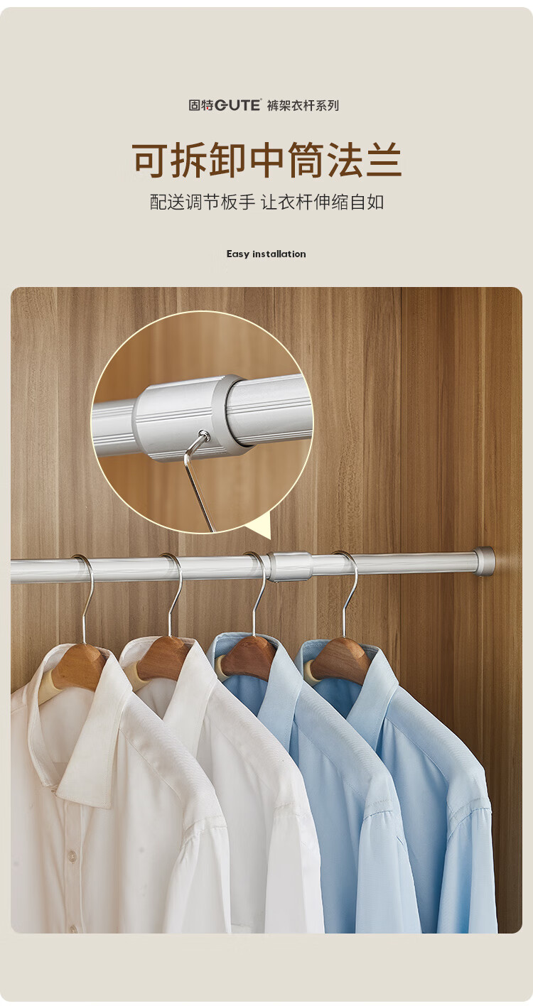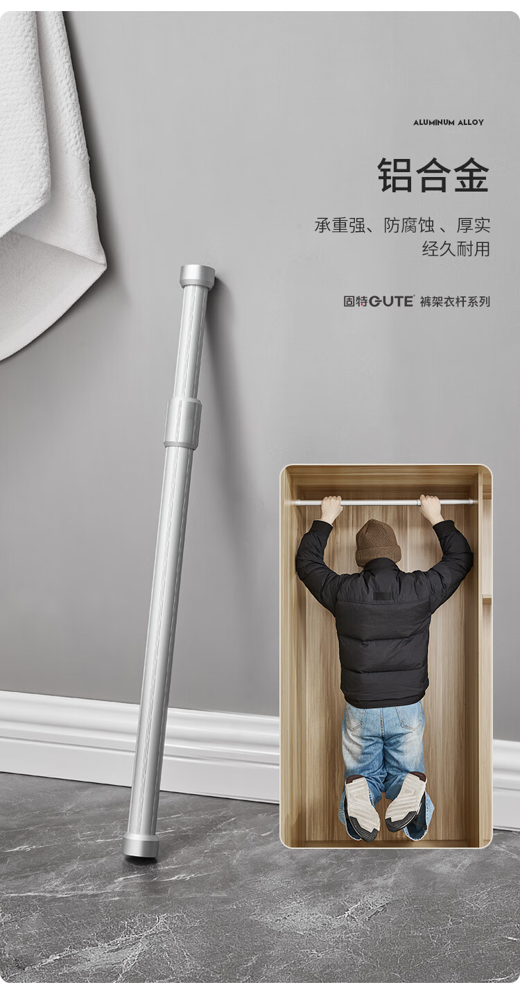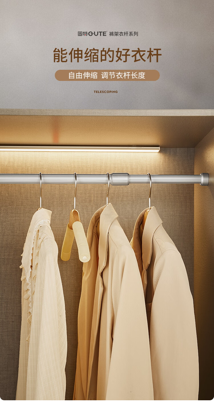 固特(GUTE)衣柜挂衣杆可伸缩橱柜杆衣柜杆固定杆衣架晾衣杆配底座银色中号