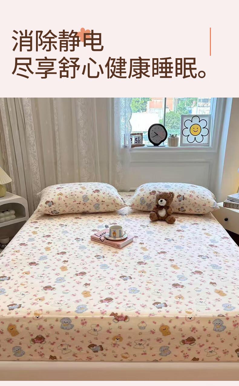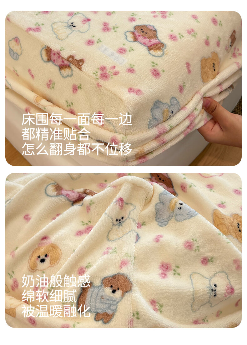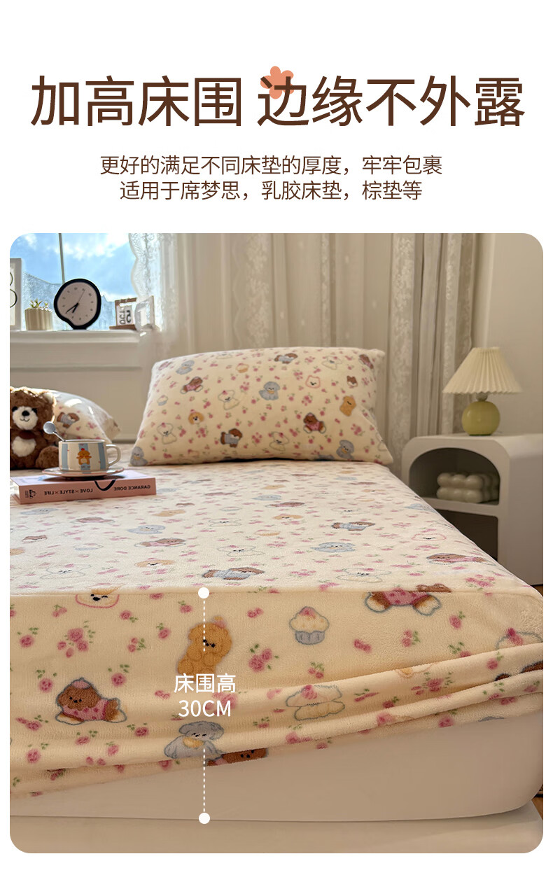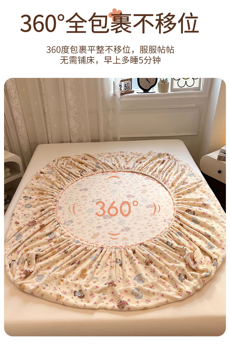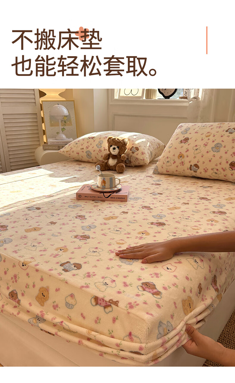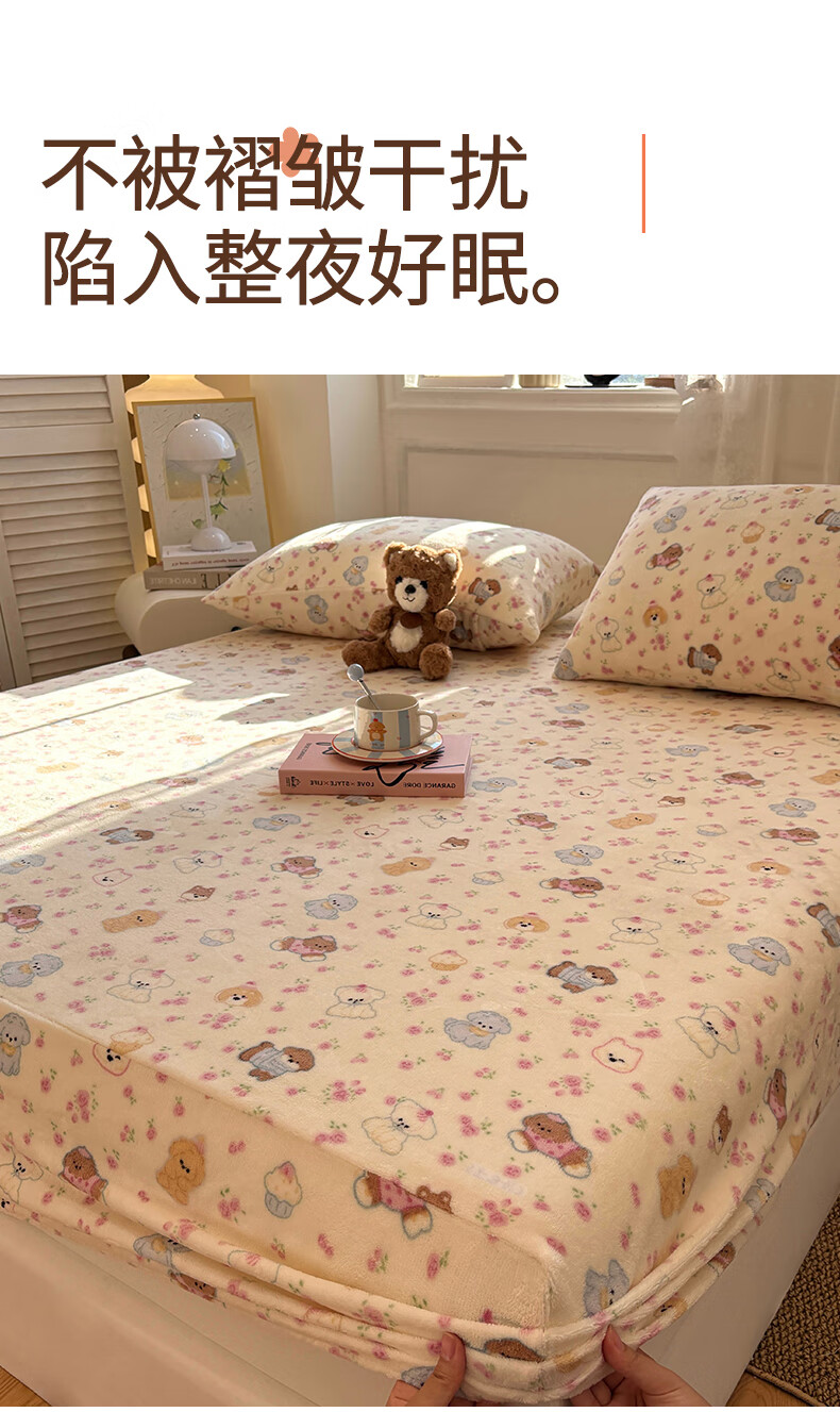 猫人(MiiOW)冬季加绒牛奶绒床笠珊瑚绒法兰绒床罩家用床垫保护罩加厚床套宿舍 芋泥小兔【亲肤保暖】 三件套-180x200cm床笠+枕套*2