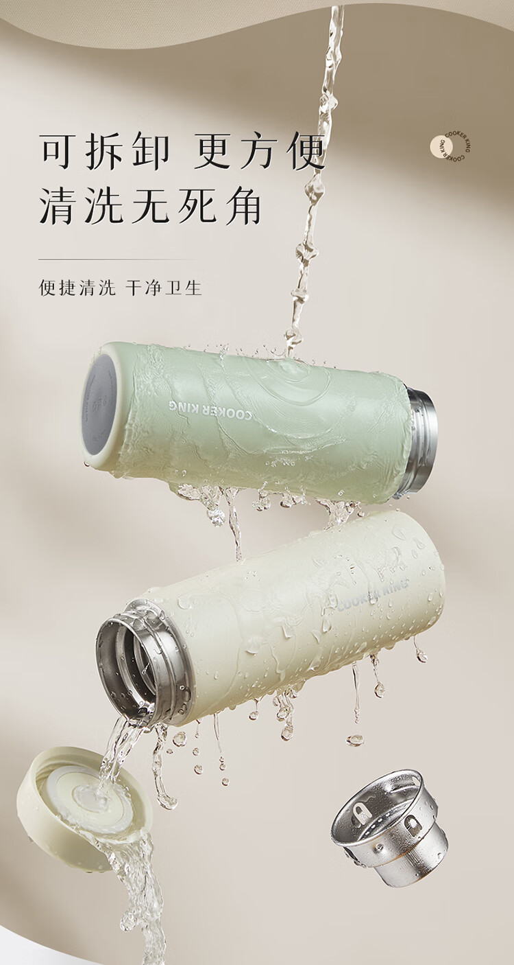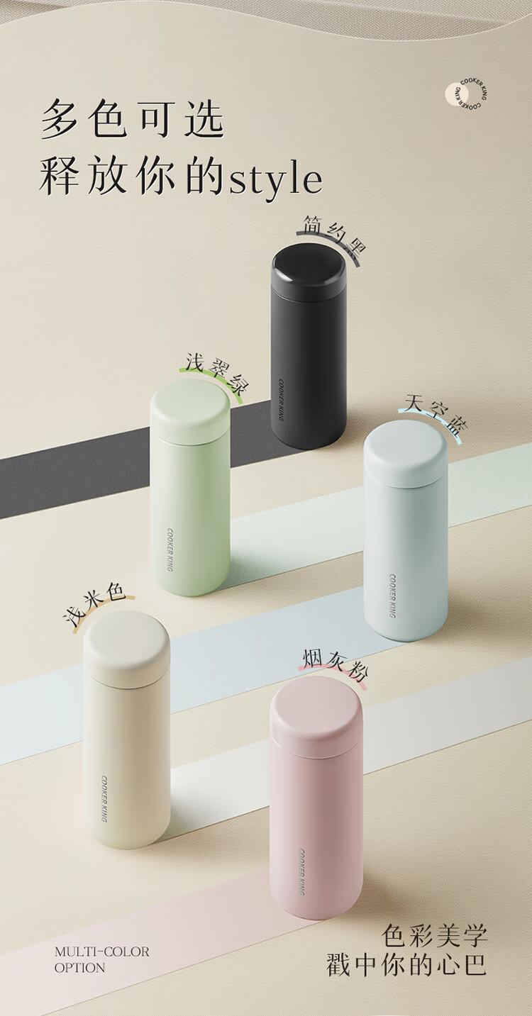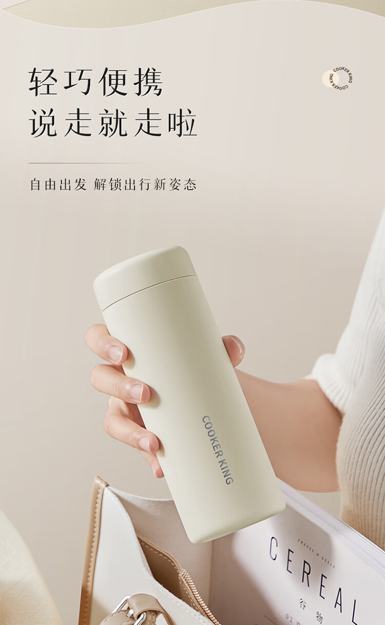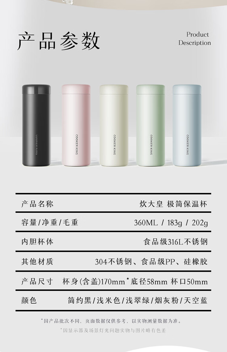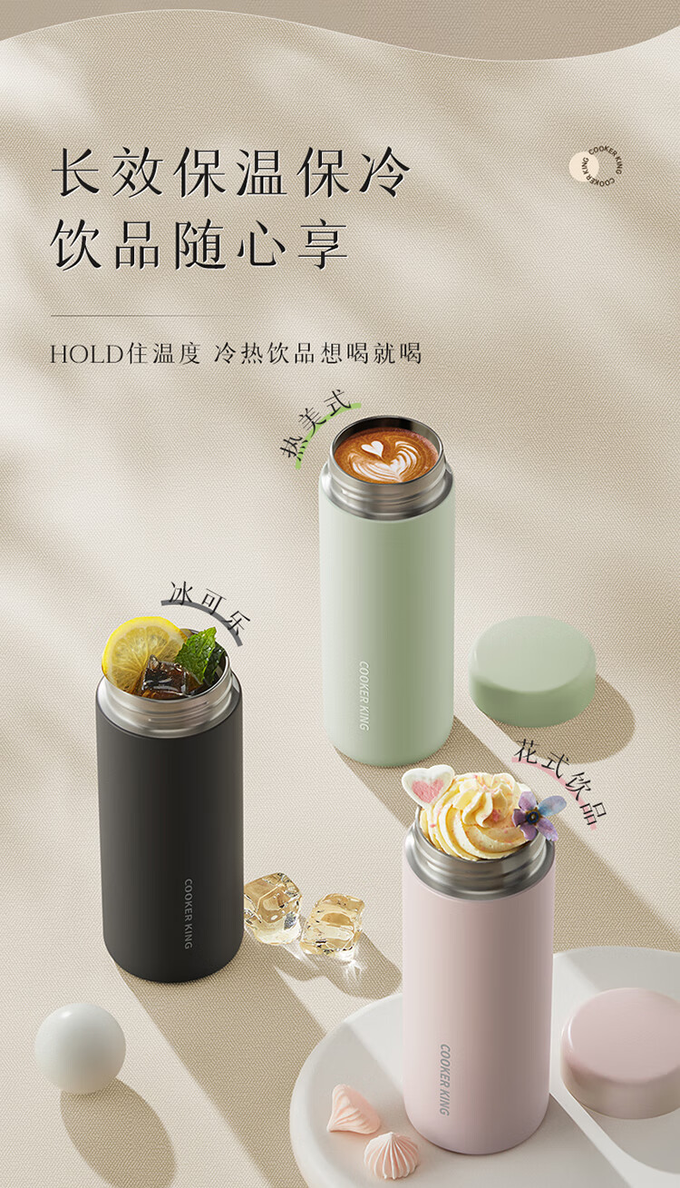 炊大皇保温杯 316L不锈钢水杯 男女士简约轻巧便携茶水杯子简约黑360ml