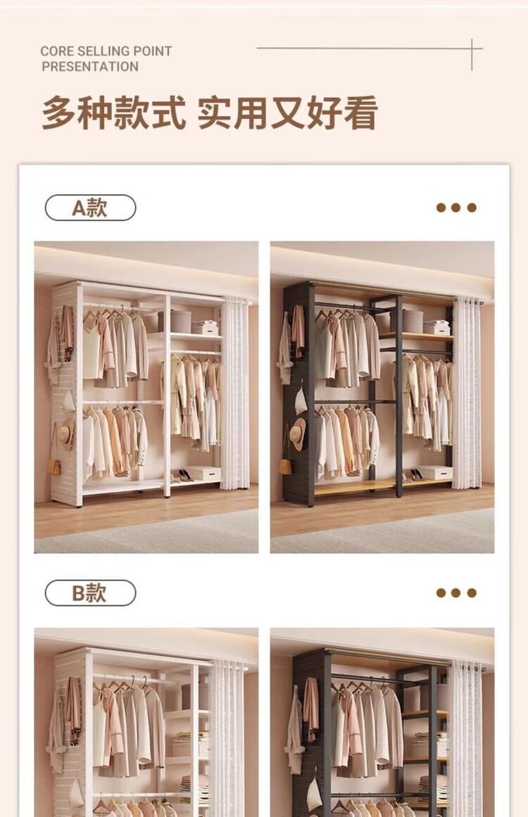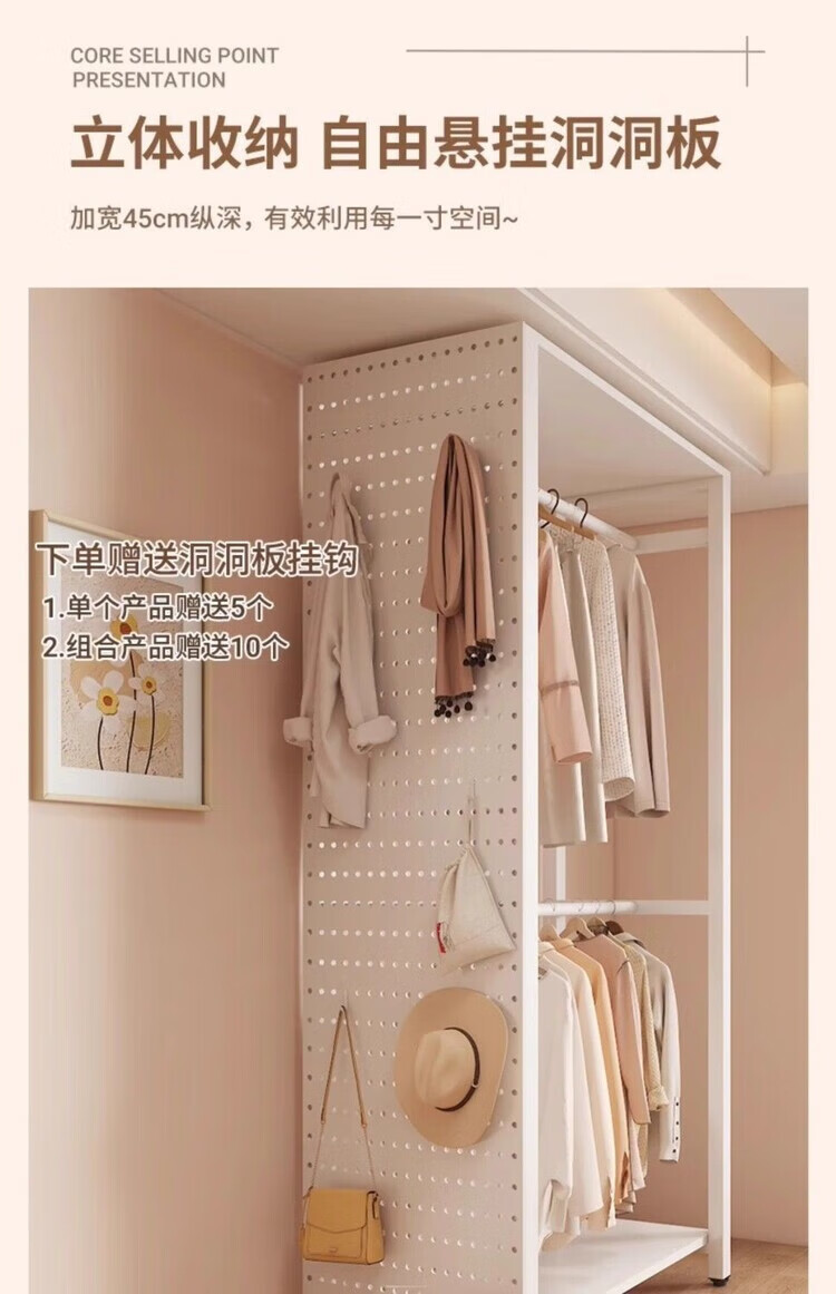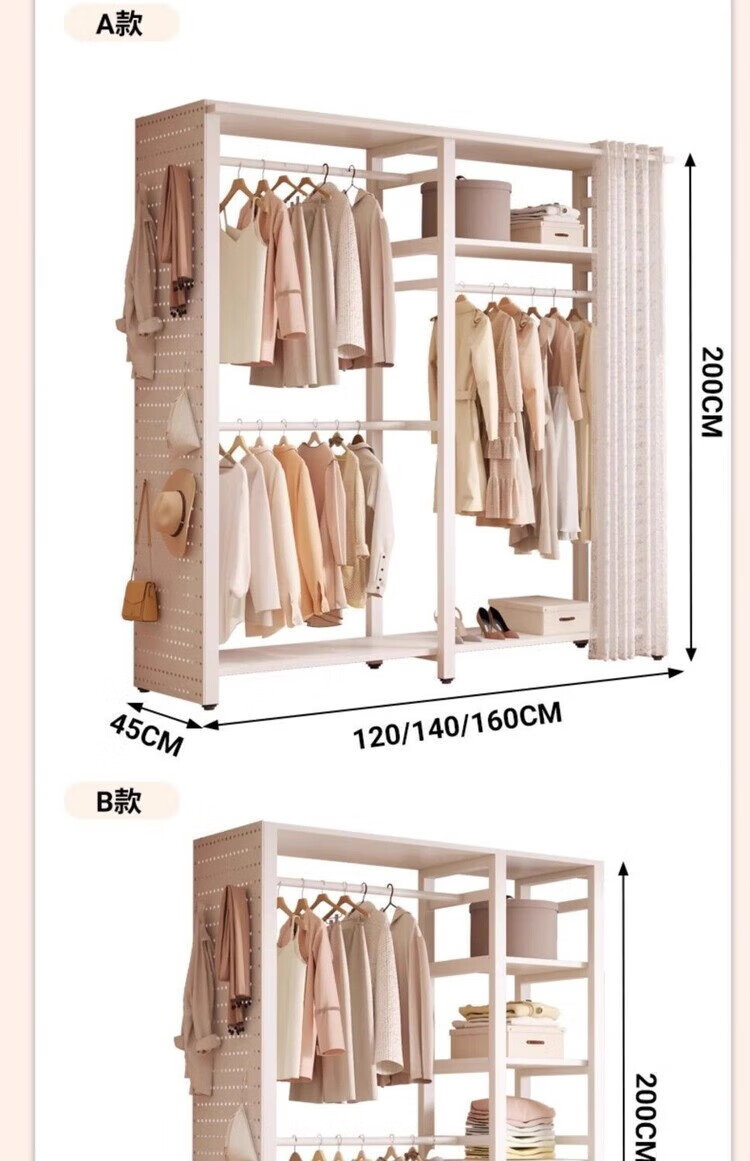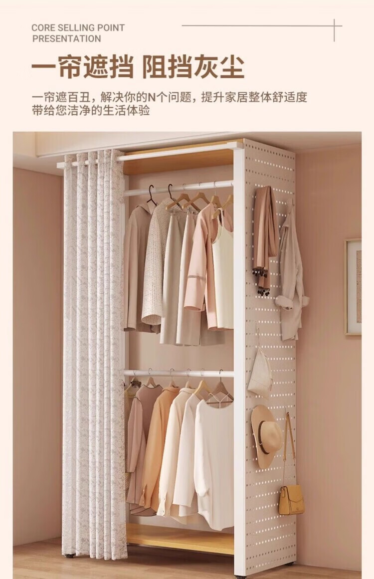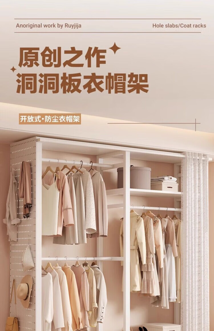 倘然之家衣帽架洞洞板落地卧室家用挂衣架子衣架置物架简易组装开放式衣柜 【A款前帘+单侧洞洞板】120*45*200
