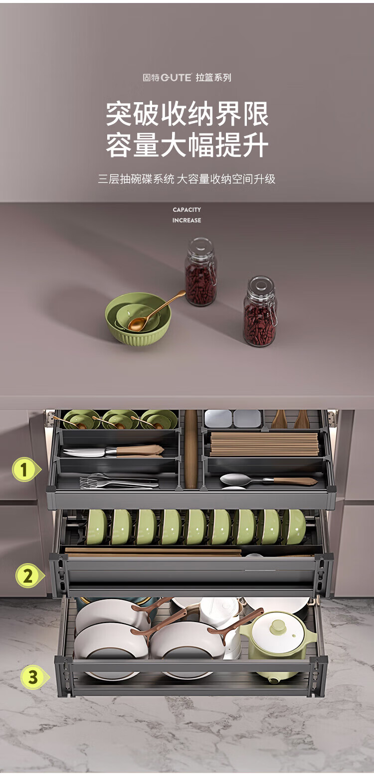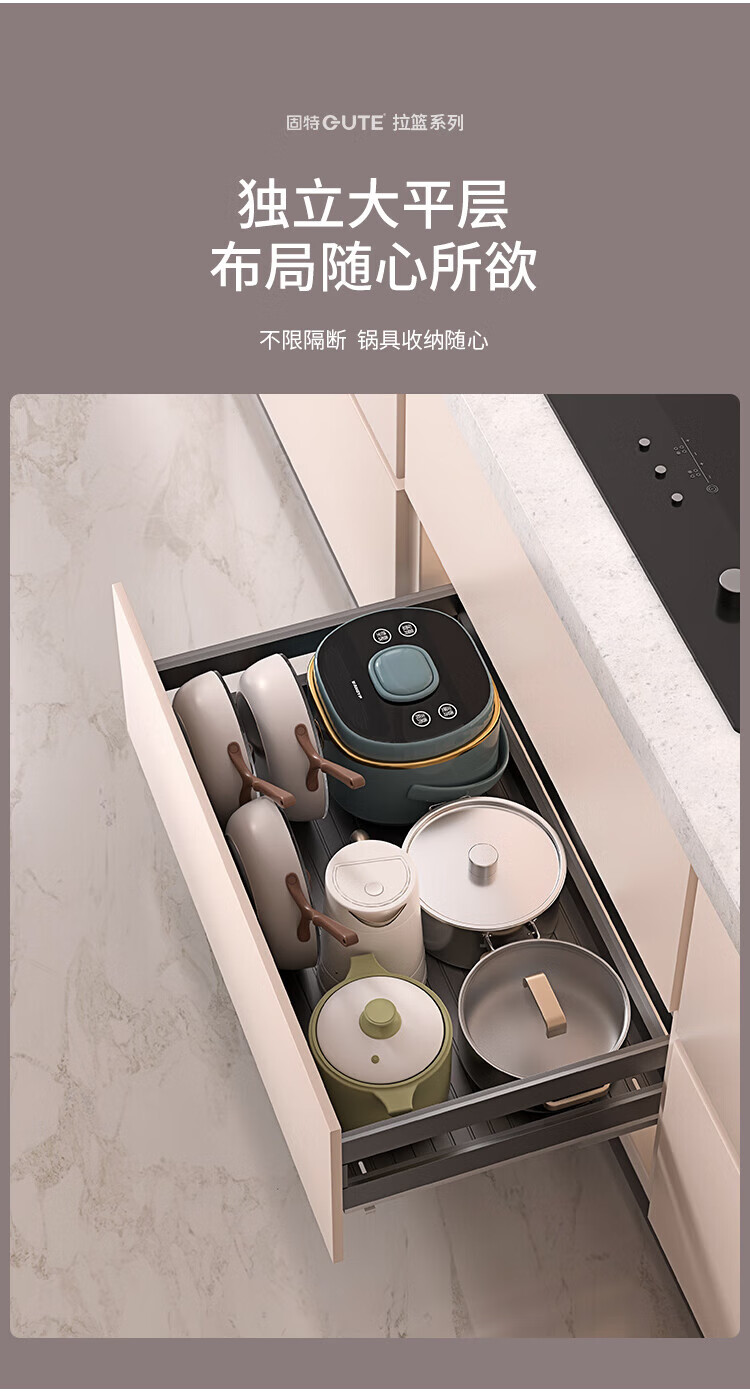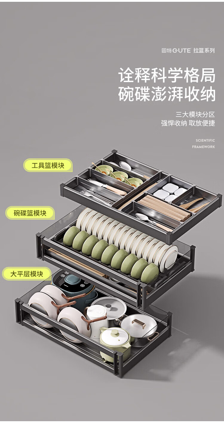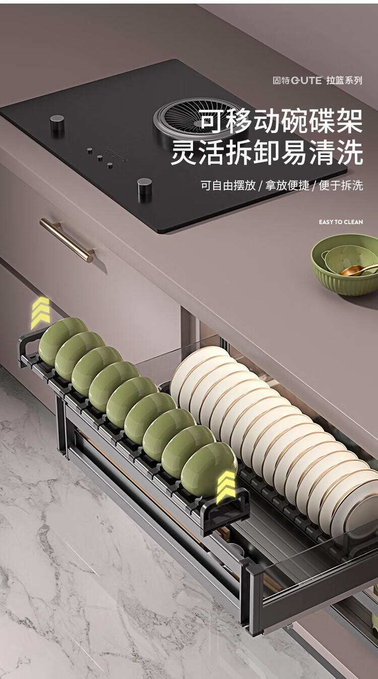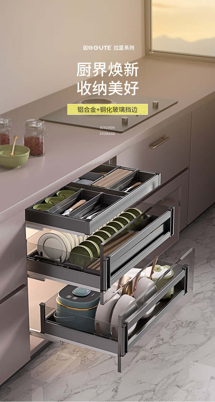 固特(GUTE)厨房拉篮橱柜抽屉式碗碟蓝收纳架橱柜加厚碗篮碗架置物架内置阻尼 【玻璃款600柜】铝合金单层 大容量收纳