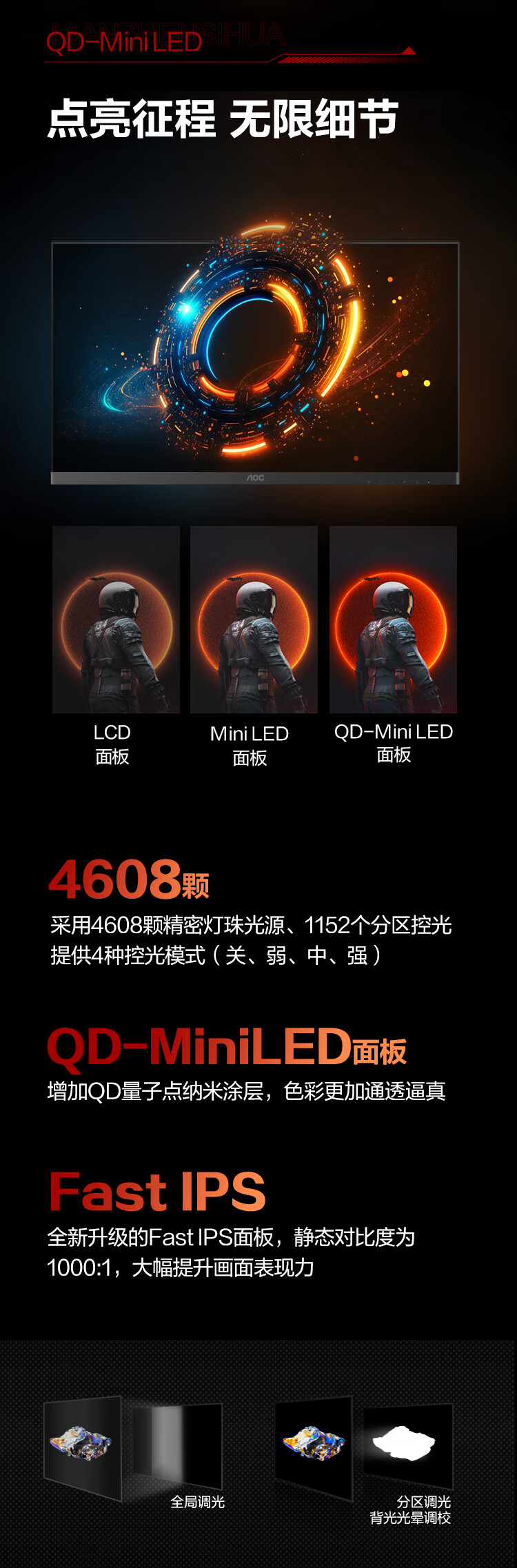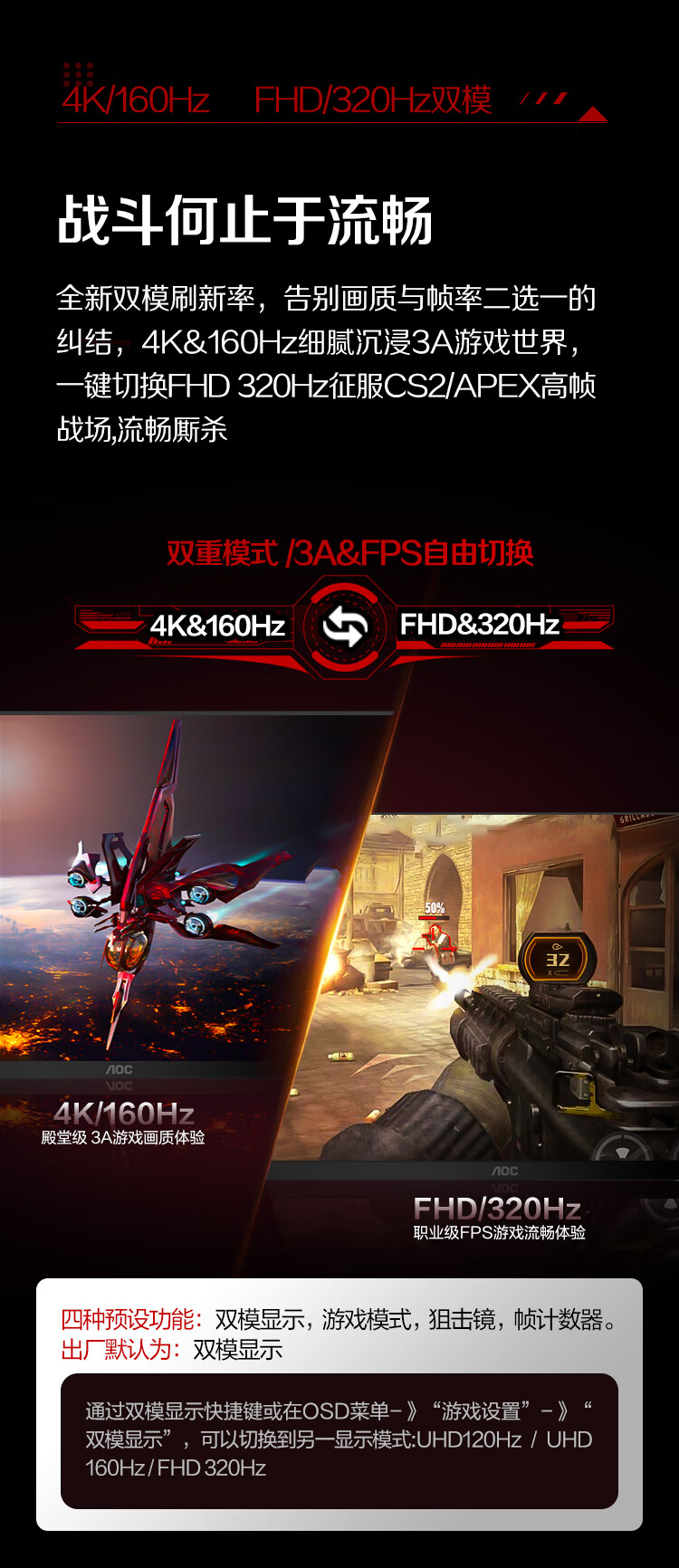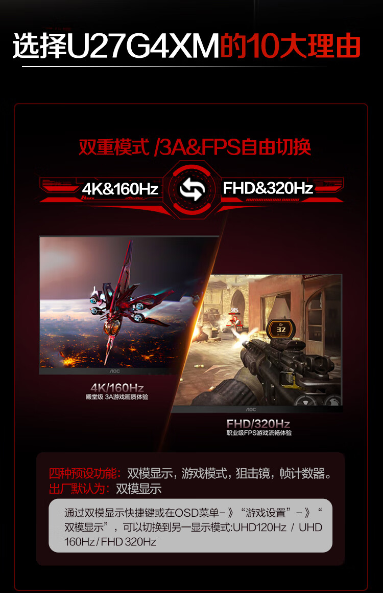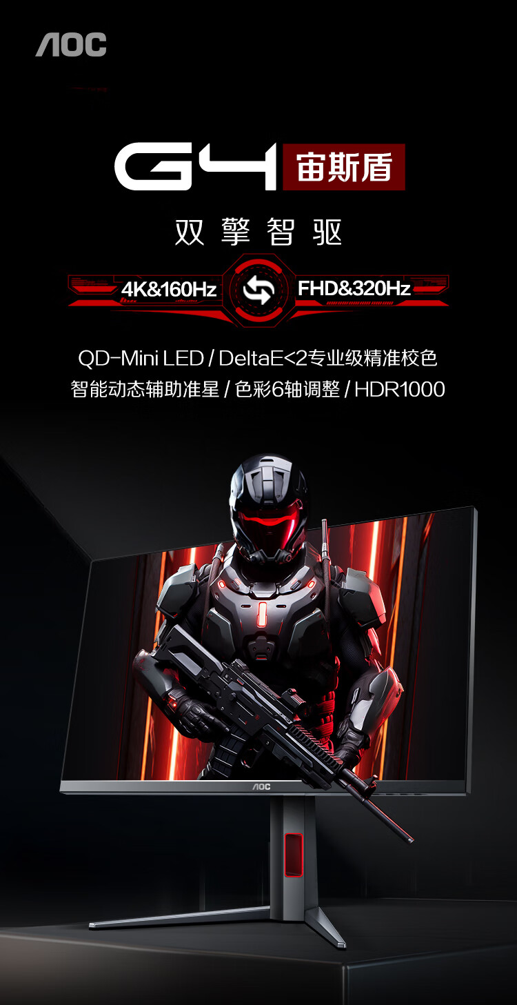 AOC 27英寸1152分区QD-MiniLED 4K 160Hz双模FHD 320Hz HDR1000 1ms 游戏电竞电脑显示器 逐光U27G4XM