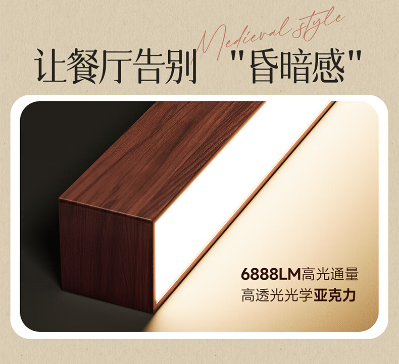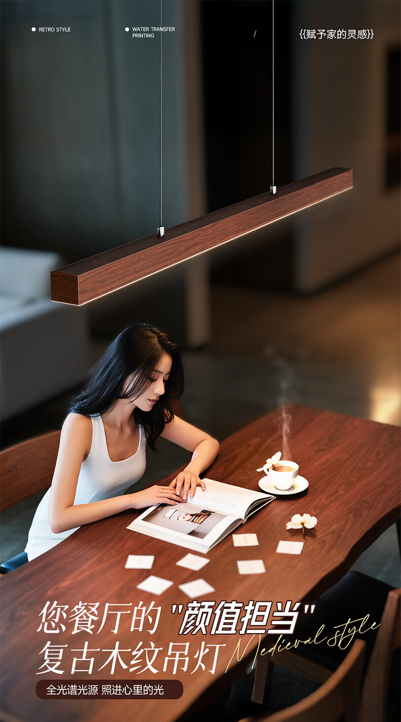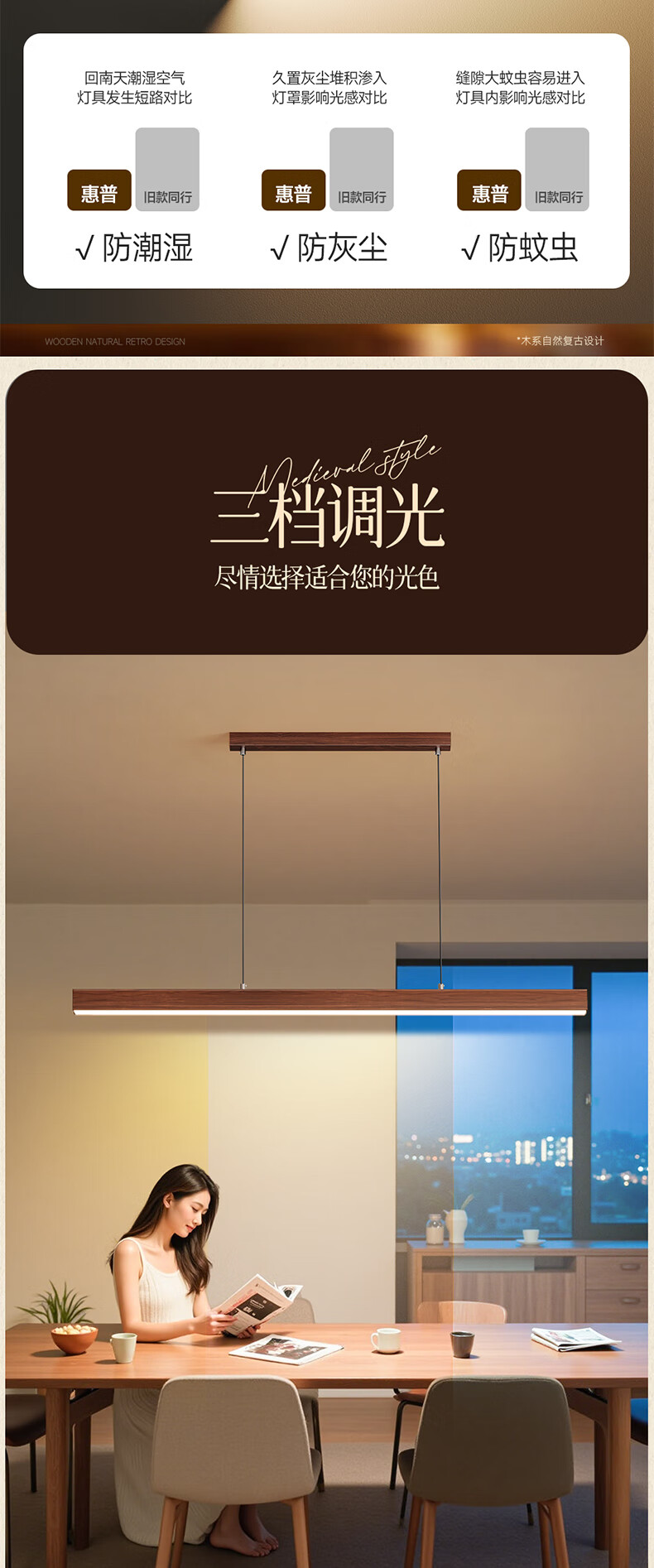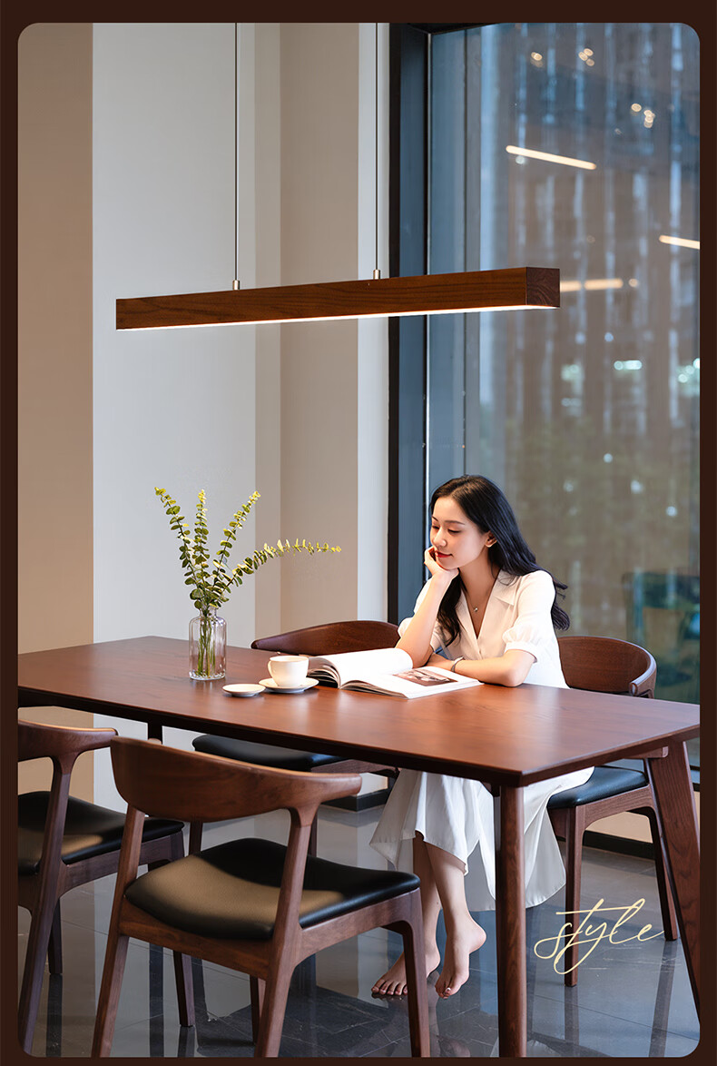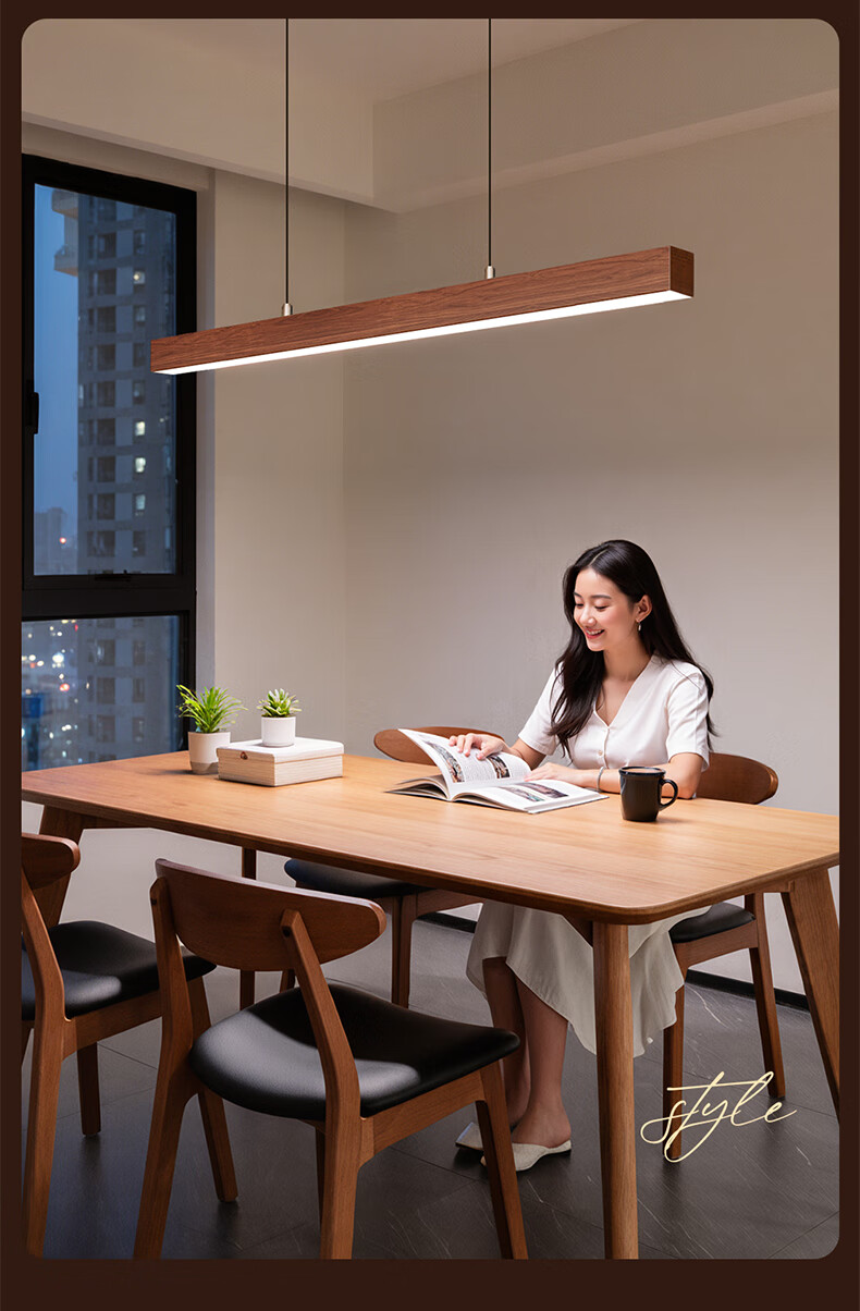 惠普胡桃木色餐厅吊灯日式现代简约中古风茶室吧台木纹长条书房餐桌灯 全光谱护眼-胡桃木纹100CM-三色光