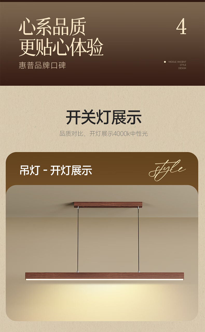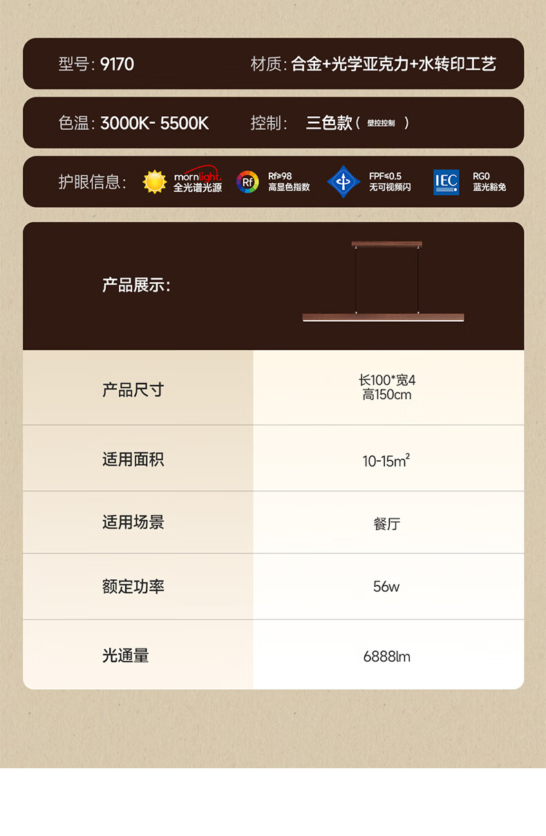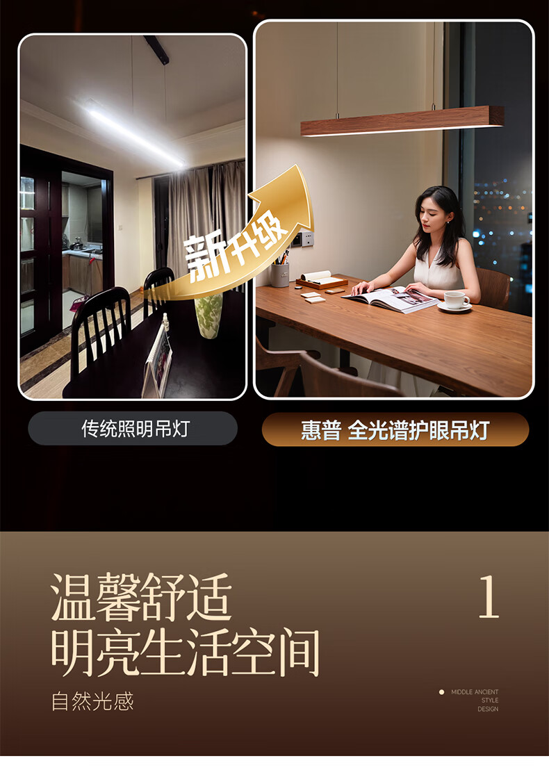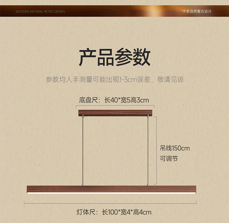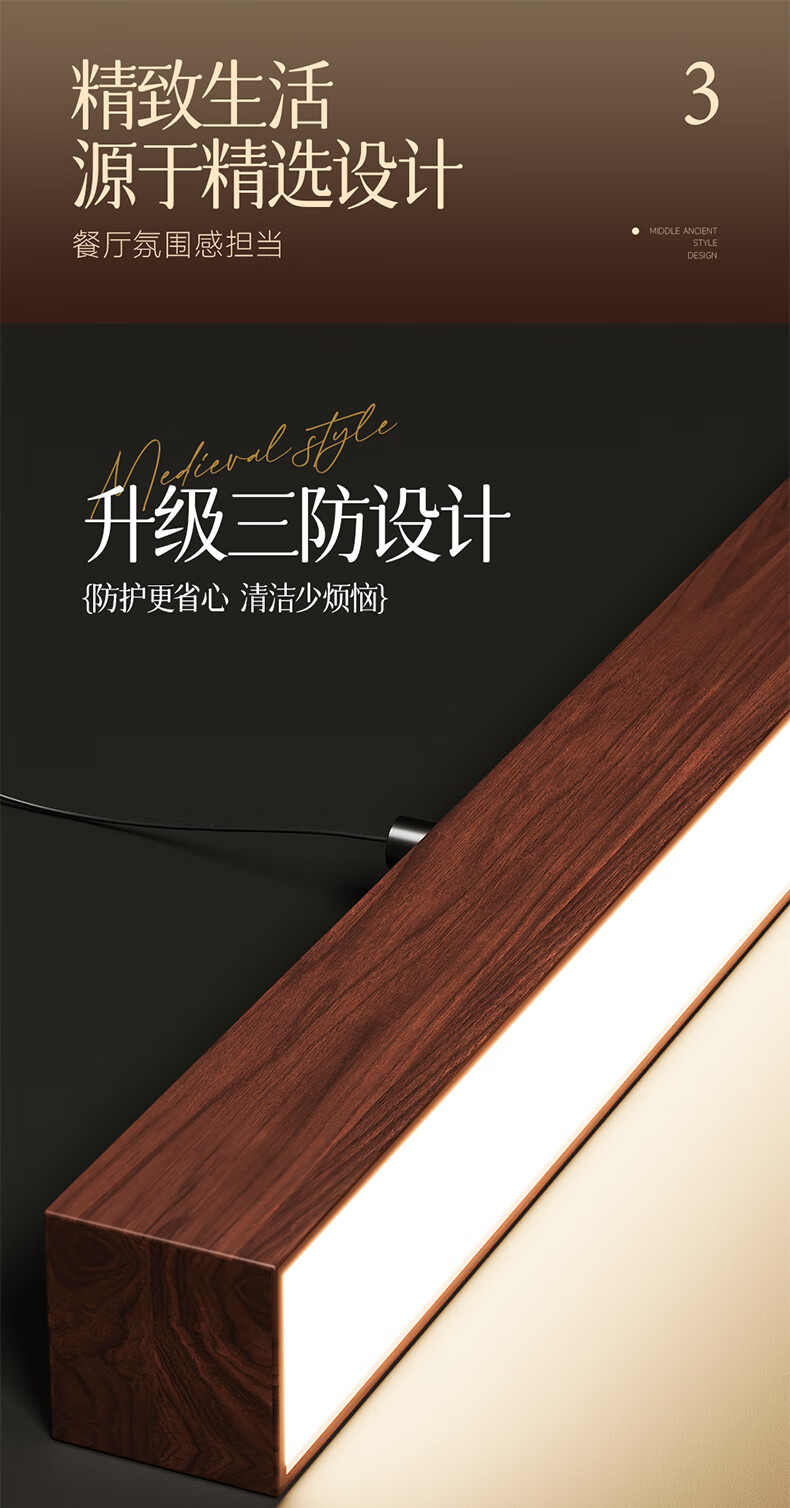 惠普胡桃木色餐厅吊灯日式现代简约中古风茶室吧台木纹长条书房餐桌灯 全光谱护眼-胡桃木纹100CM-三色光
