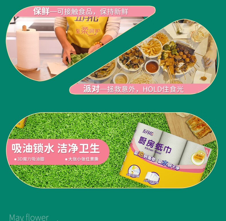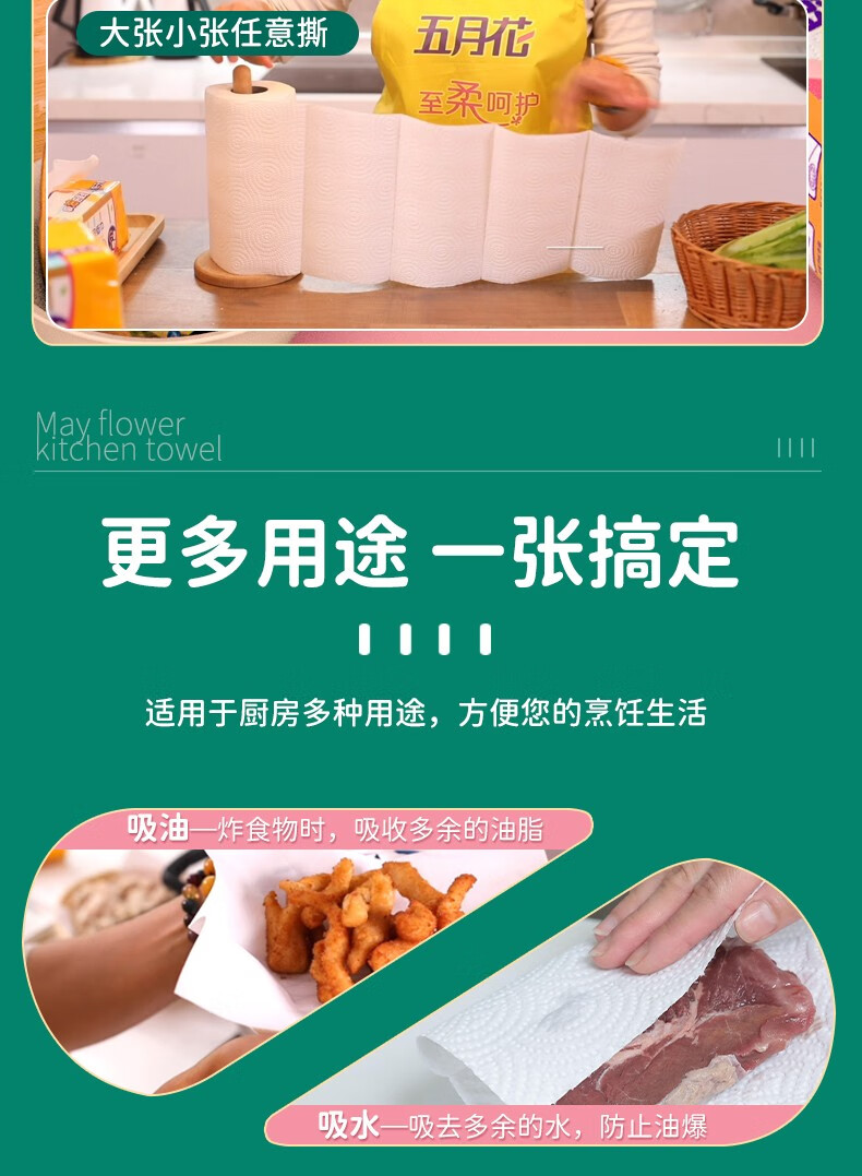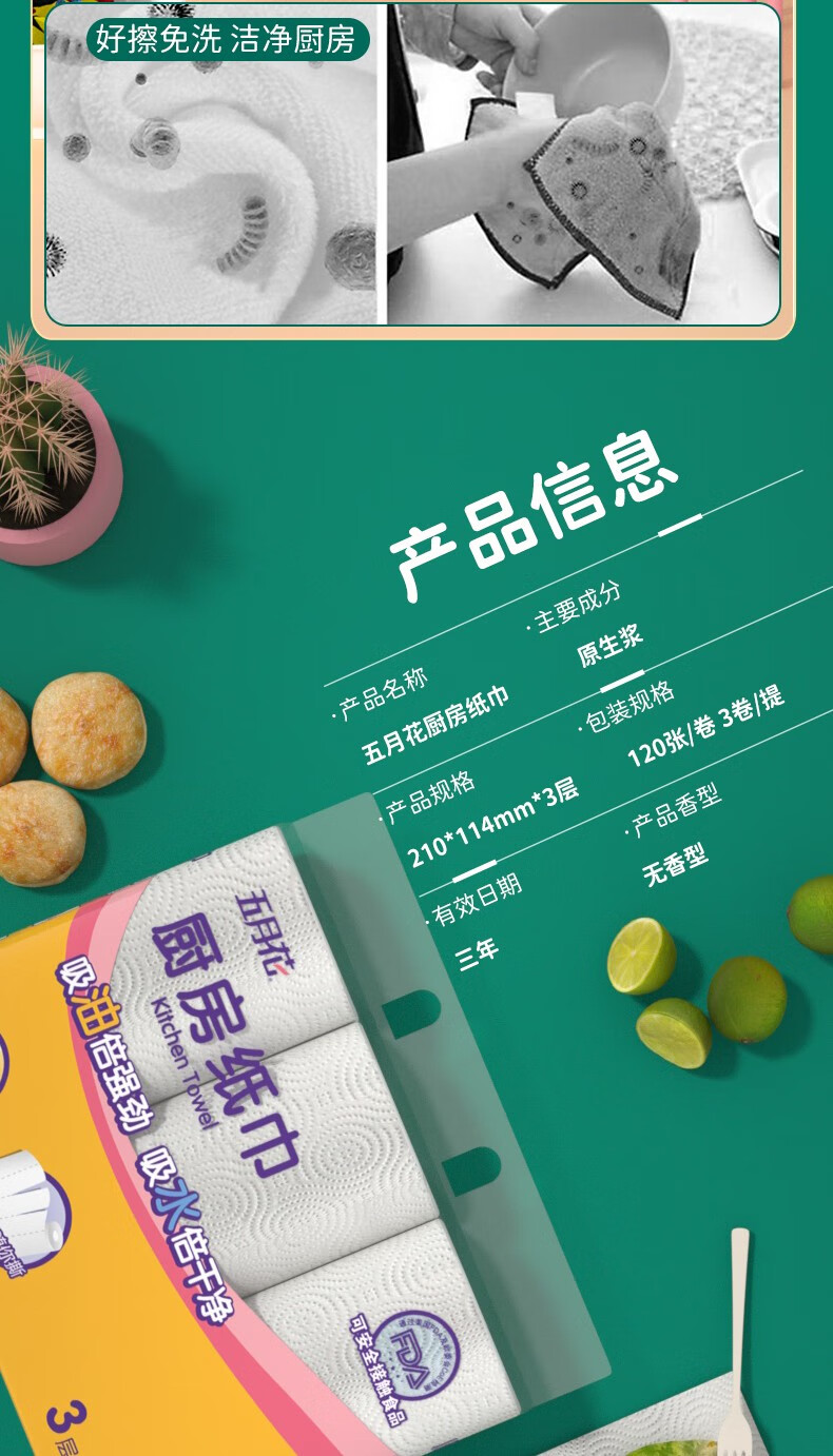 五月花(May Flower)厨房纸巾厨房用纸卫生纸吸油纸吸水纸擦手纸3层整箱装食品级实惠 3层 120节*3卷
