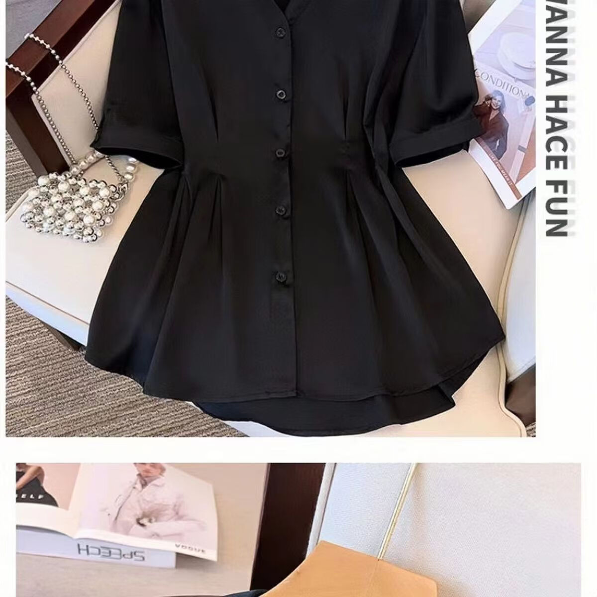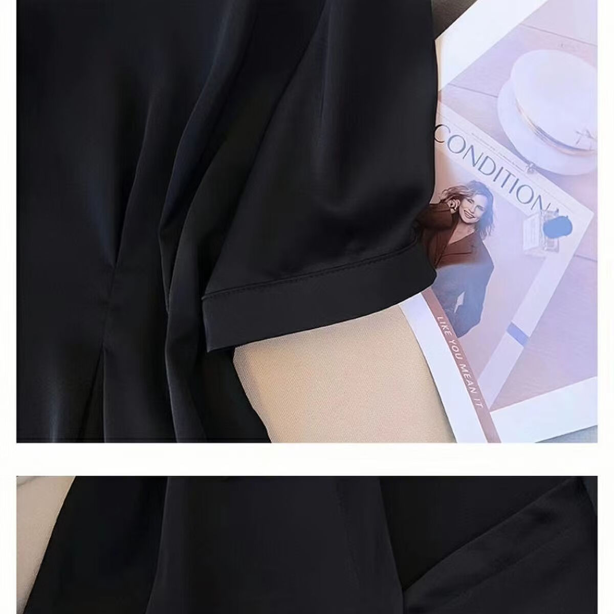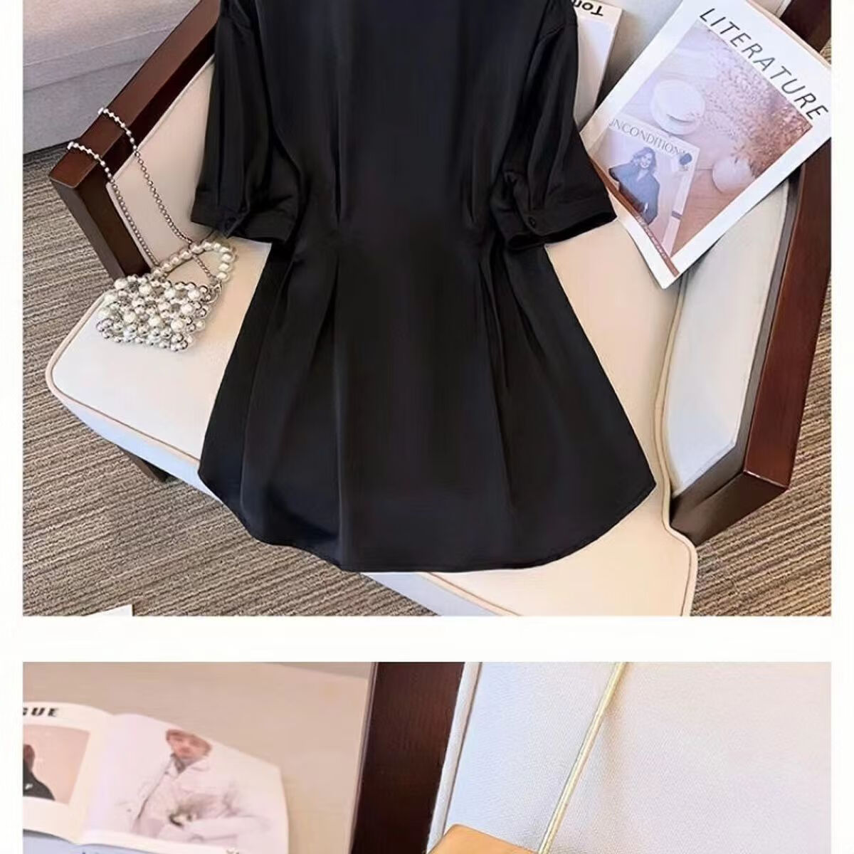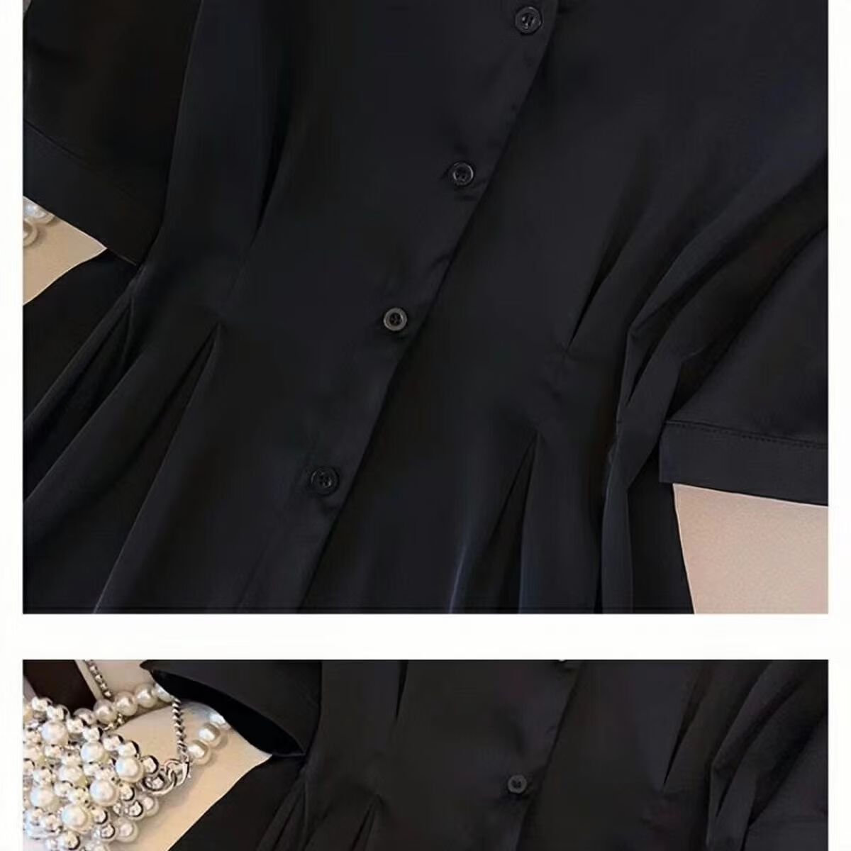 大码女装翻领收腰短袖衬衫女夏季新款胖妹妹时尚气质上衣潮妈妈装 黑色 L (115-130斤)