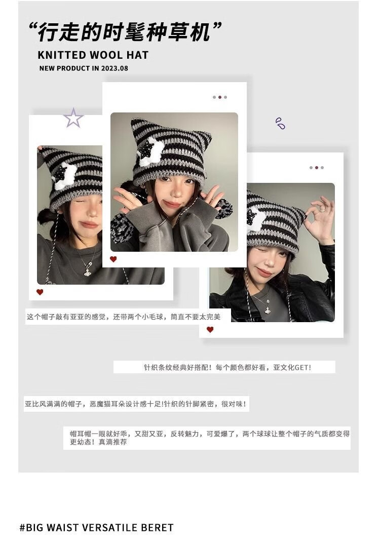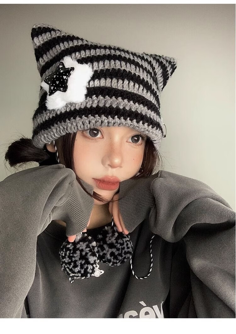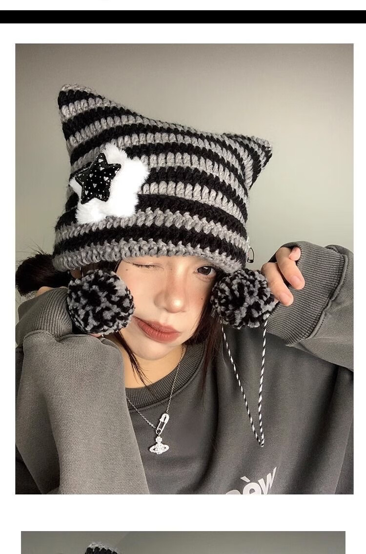 【甄选好物】亚比风猫咪耳朵帽子女秋冬y2k条纹针织帽韩版可爱保 张元英同款【黑色】