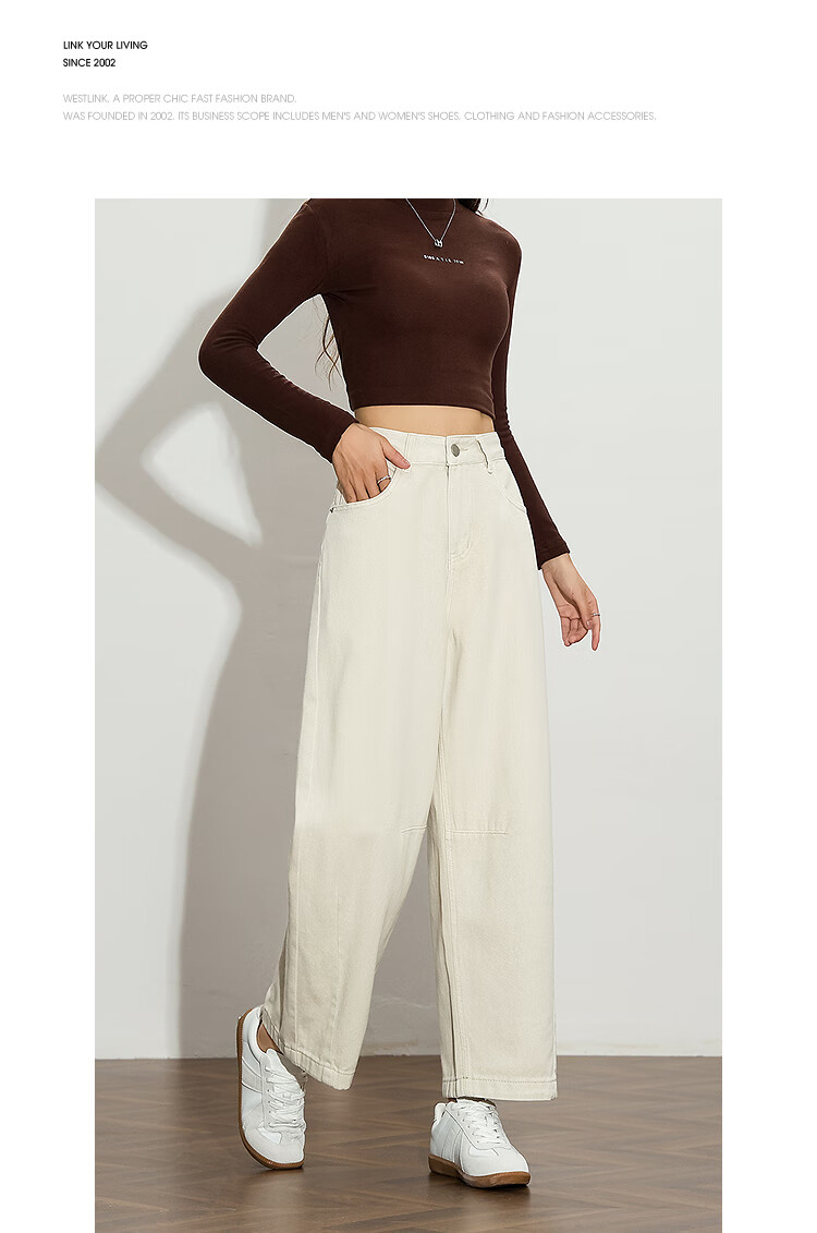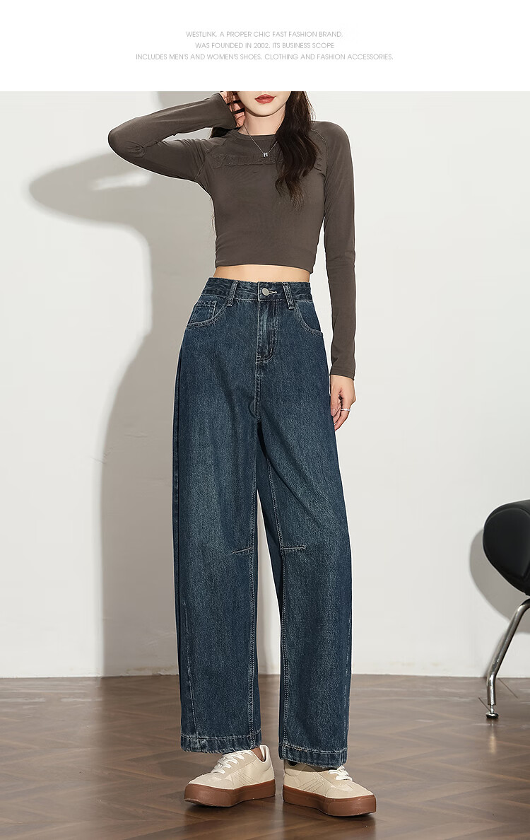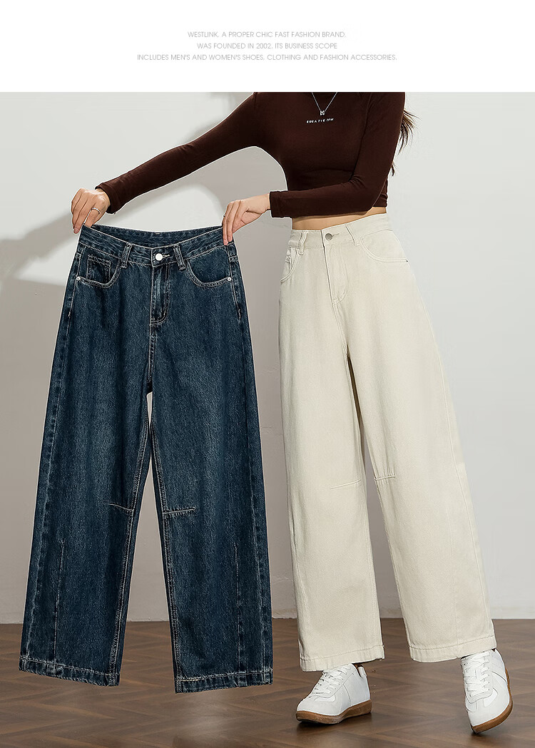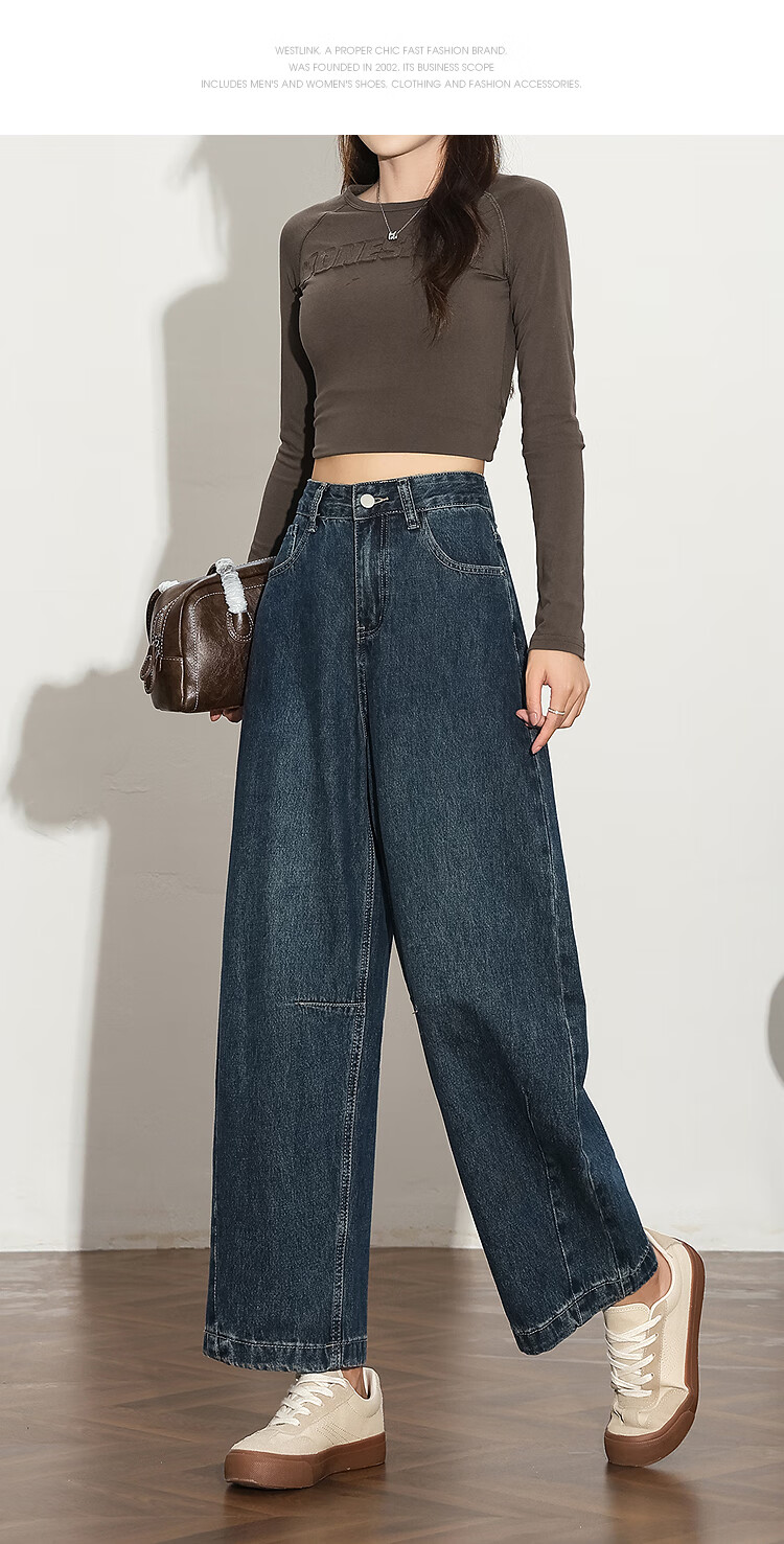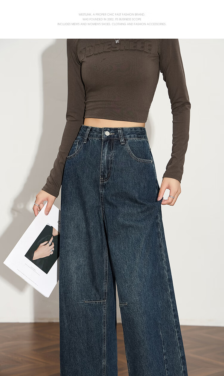 西遇(Westlink)复古拼接水洗牛仔裤女宽松阔腿裤 深蓝色(H0051280) 26 (155)