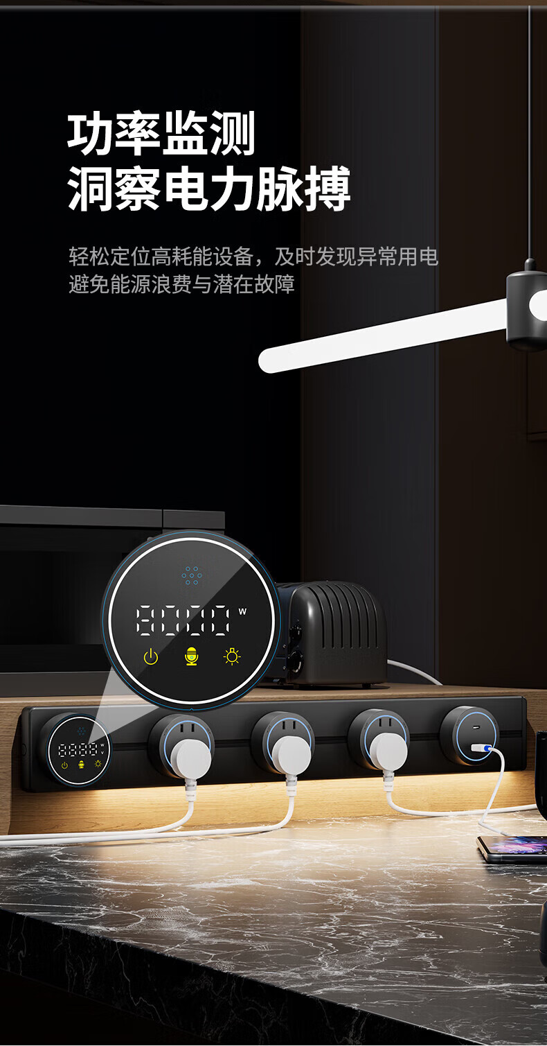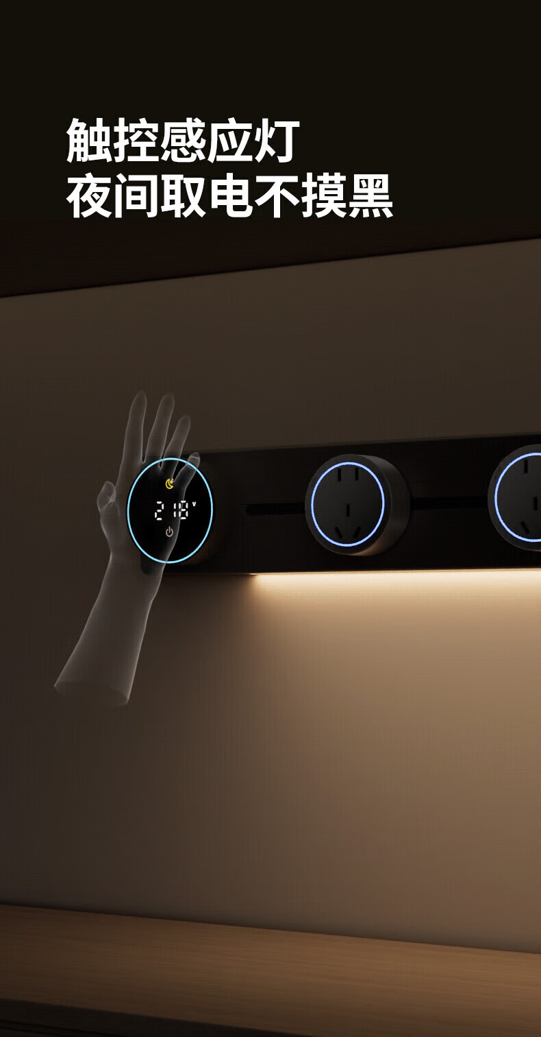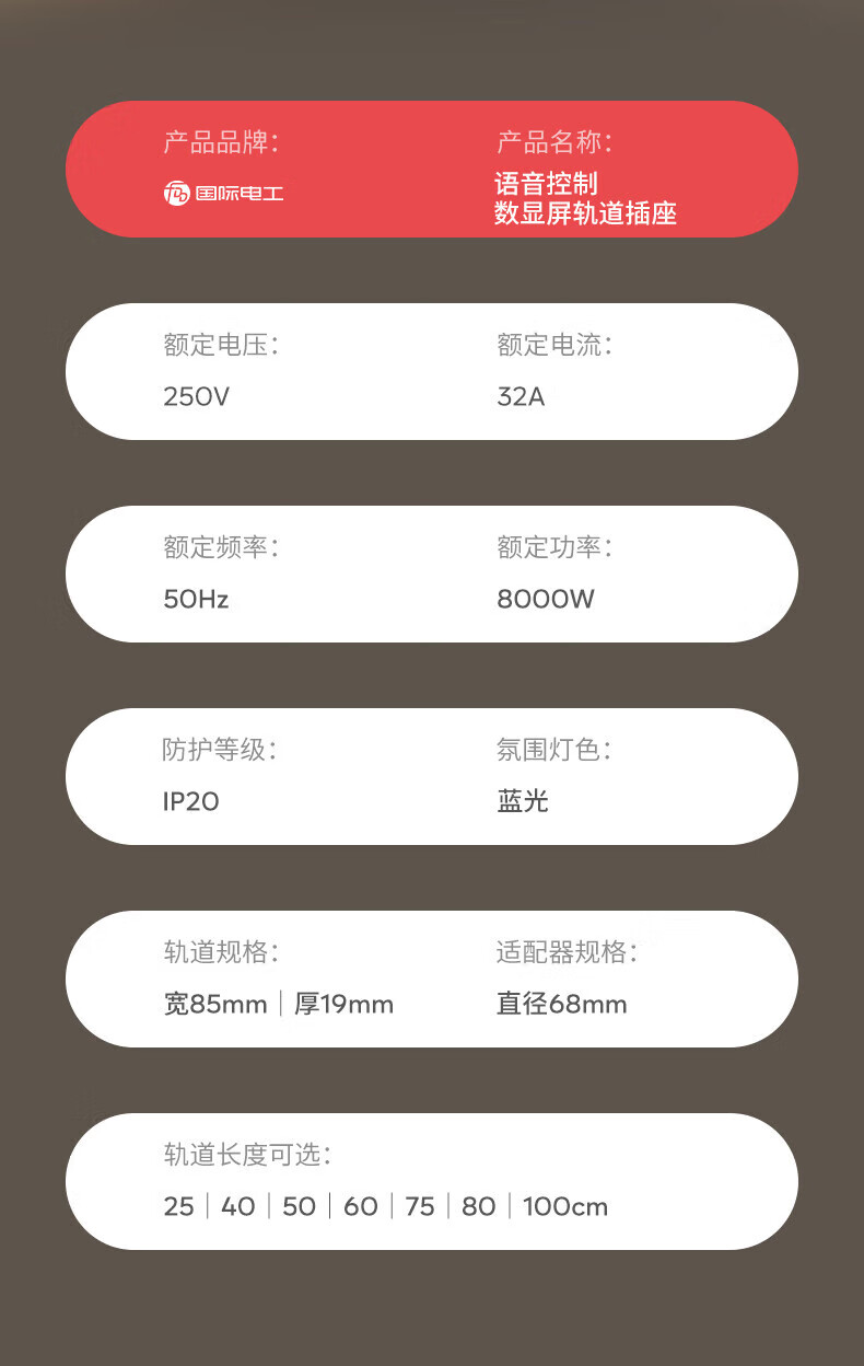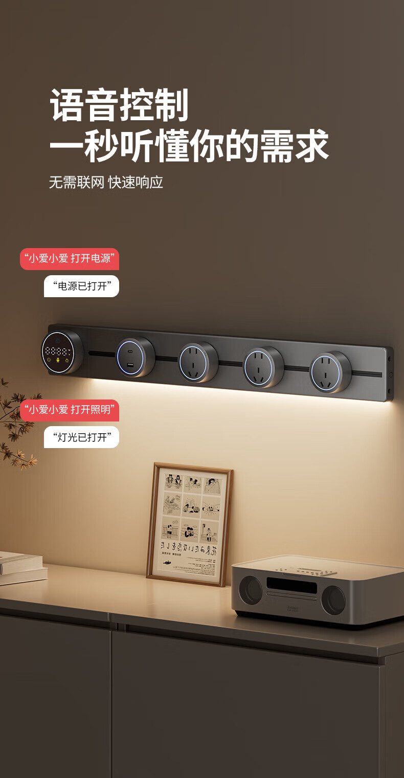 国际电工智能语音控制显示屏轨道插座家用厨房餐边柜移动带灯数显滑动插排 数显语音控制-40cm+2大五孔(带灯)