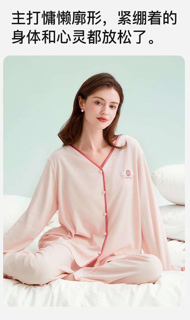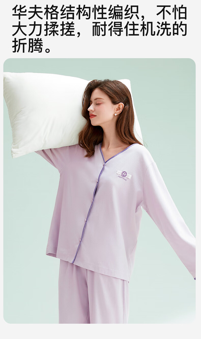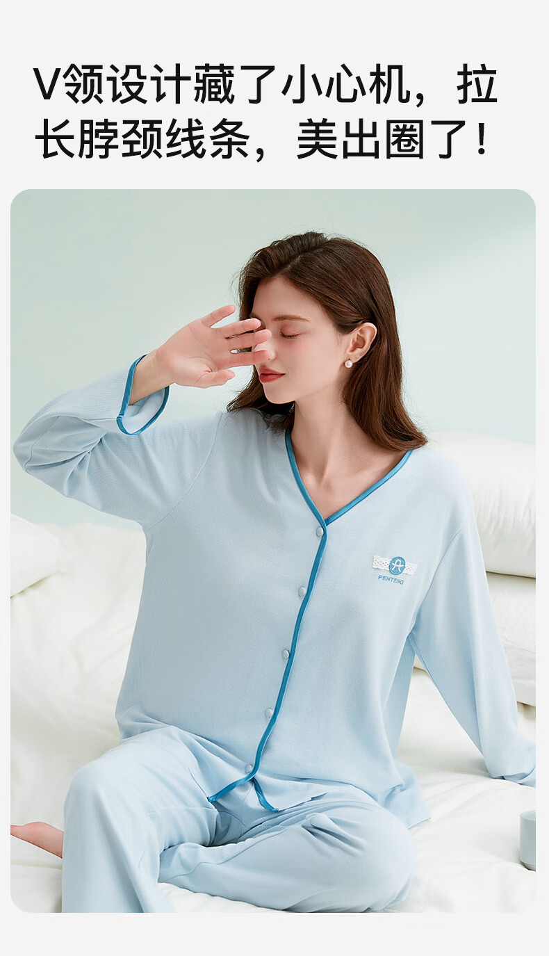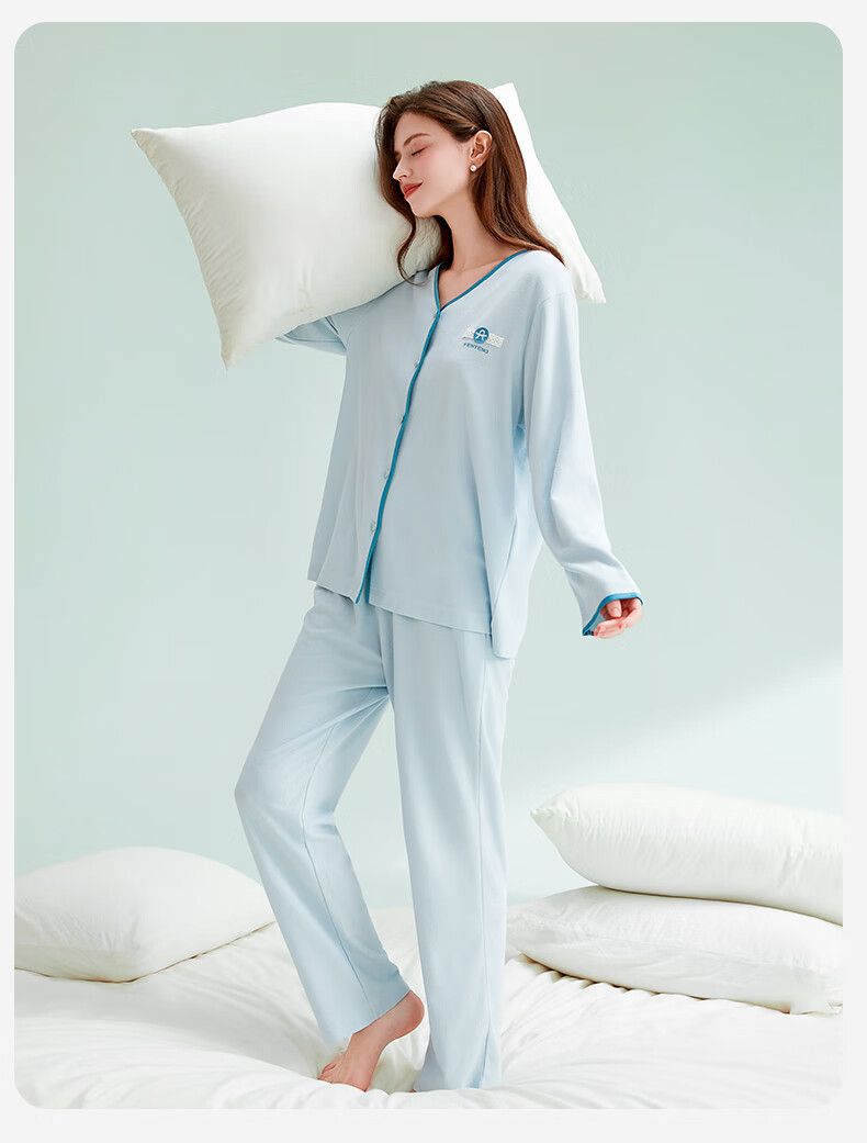芬腾睡衣女棉柔华夫格2025秋撞色V领简约软棉棉休闲长袖家居服套装 冰兰 M