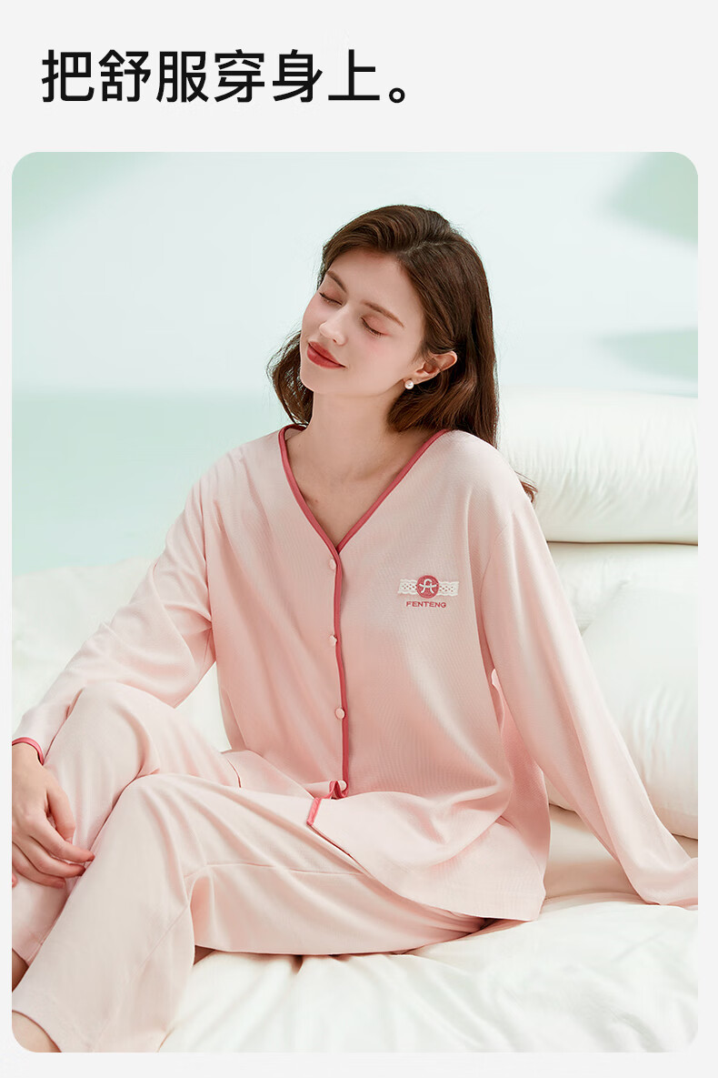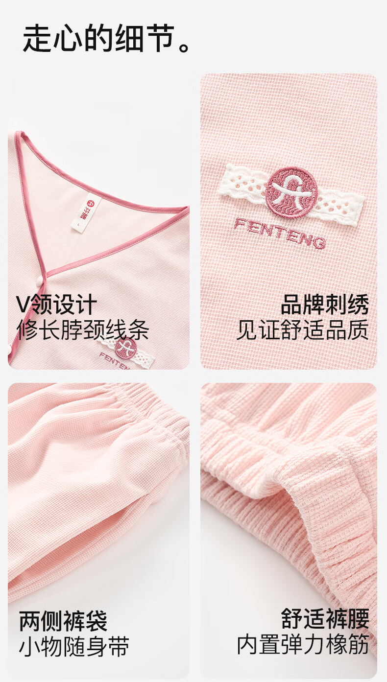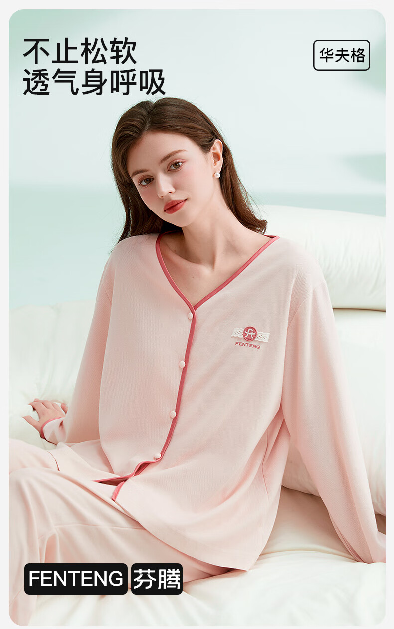 芬腾睡衣女棉柔华夫格2025秋撞色V领简约软棉棉休闲长袖家居服套装 冰兰 M