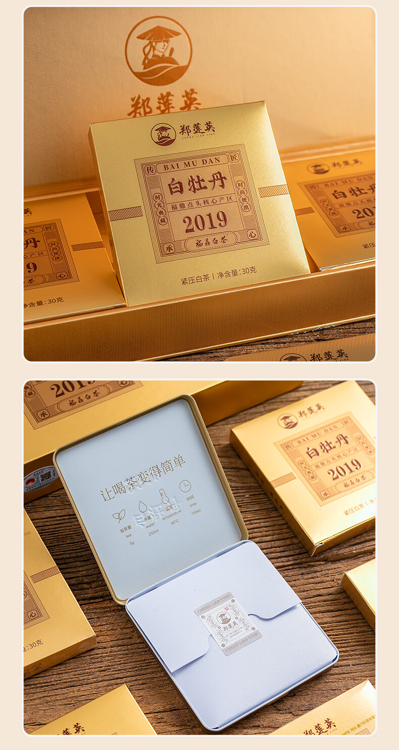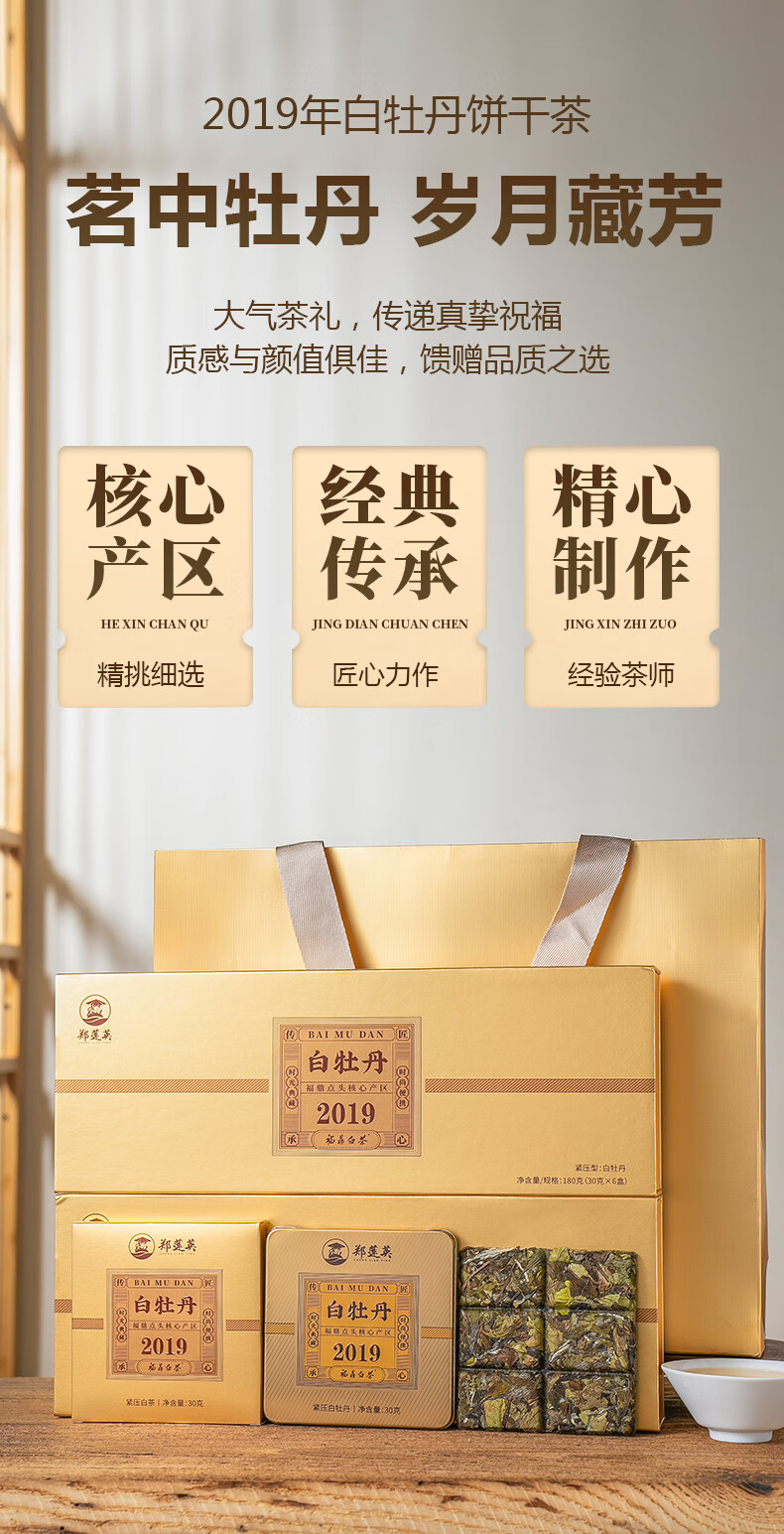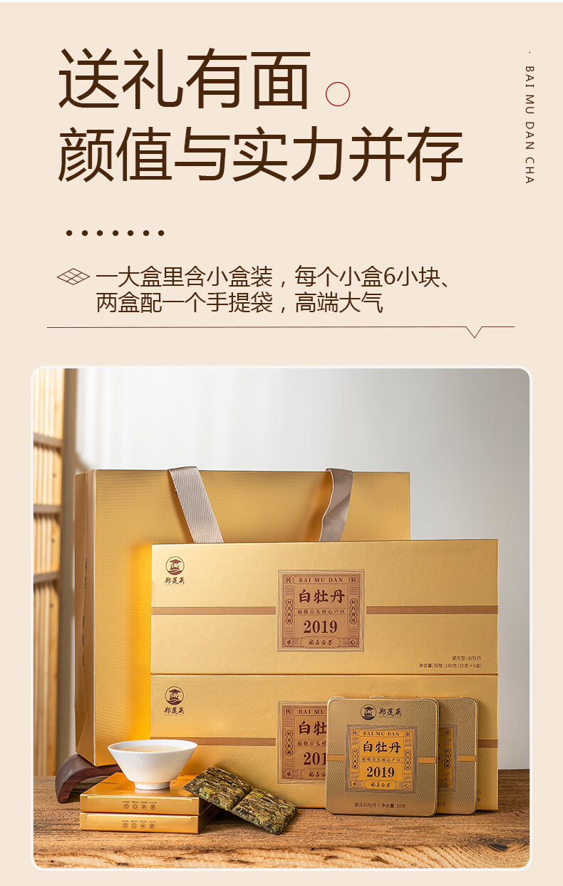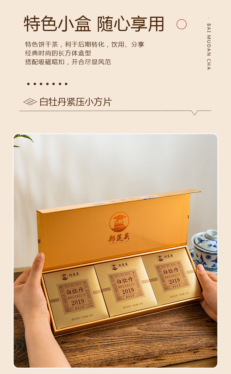 郑莲英(ZHENGLIANYING)茶叶2019年白牡丹白茶福鼎白茶老白茶小方片节日送礼礼盒装360g