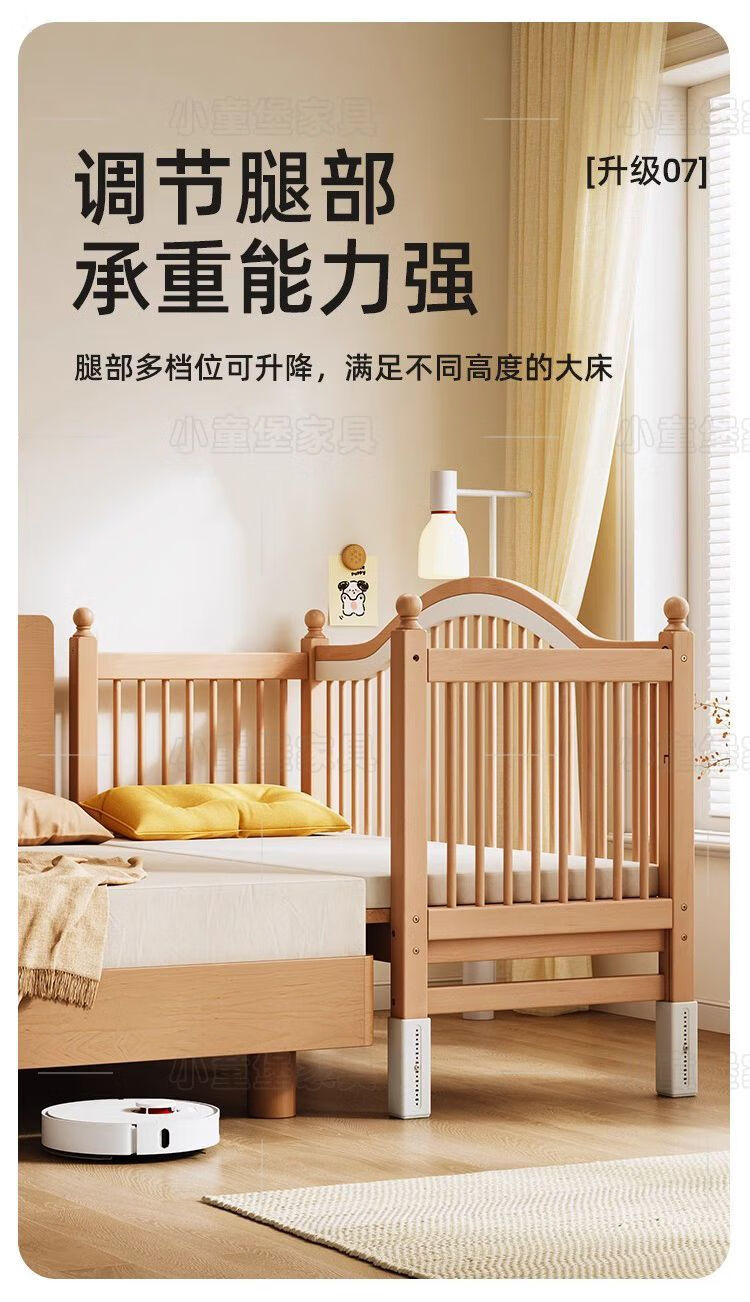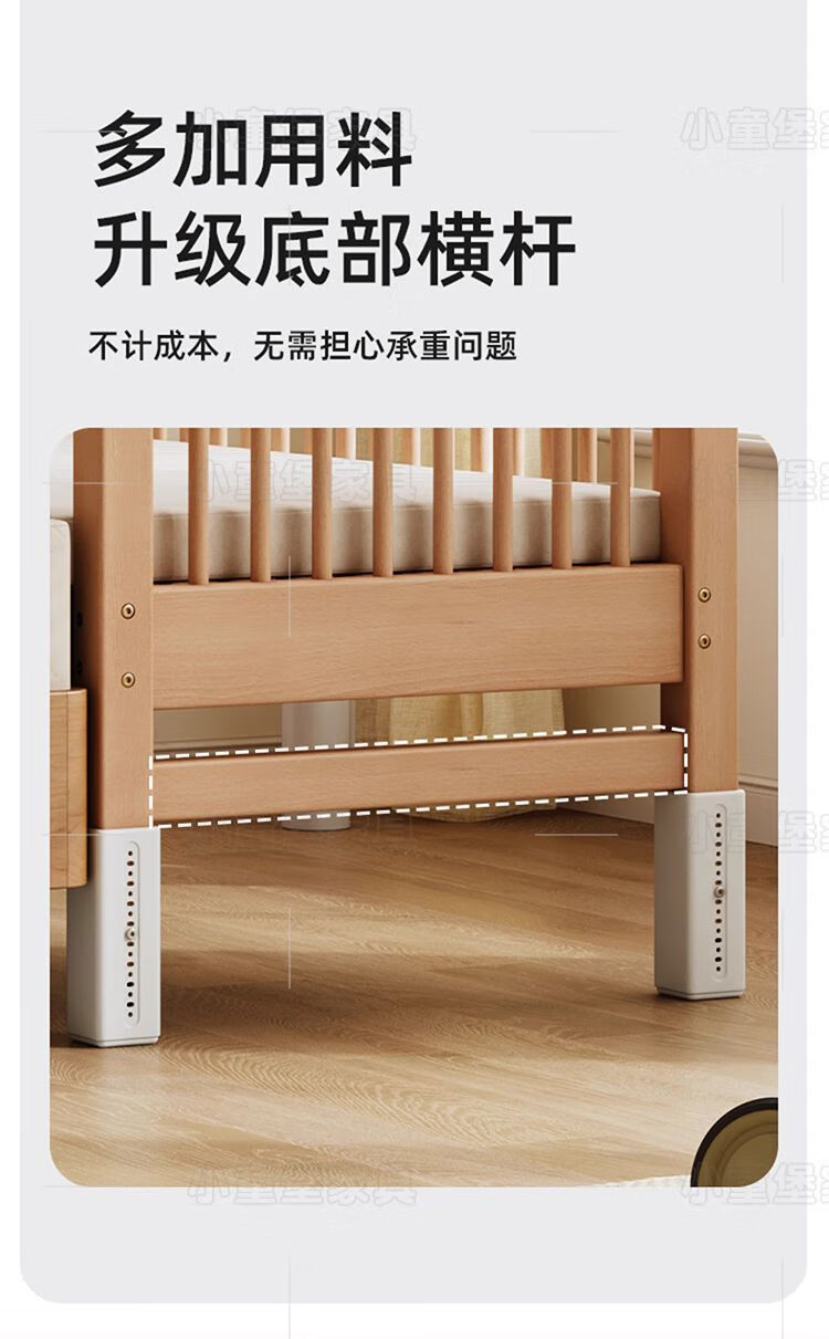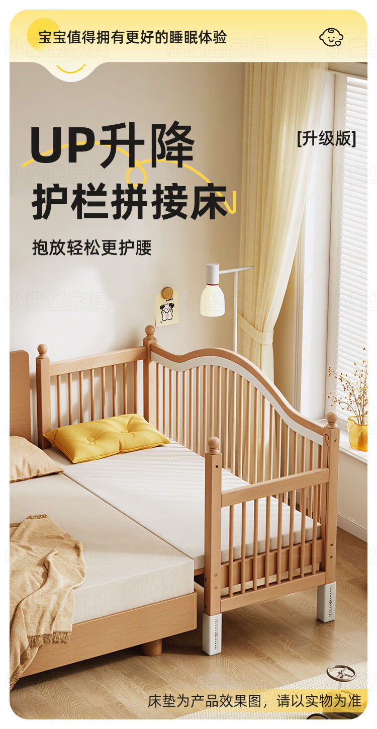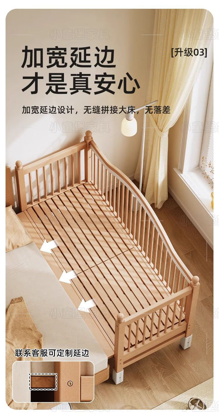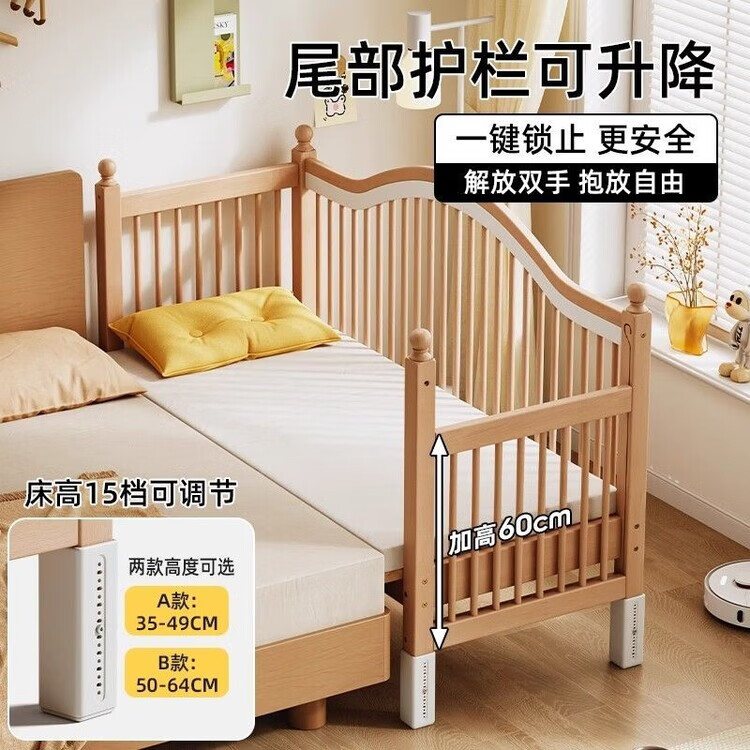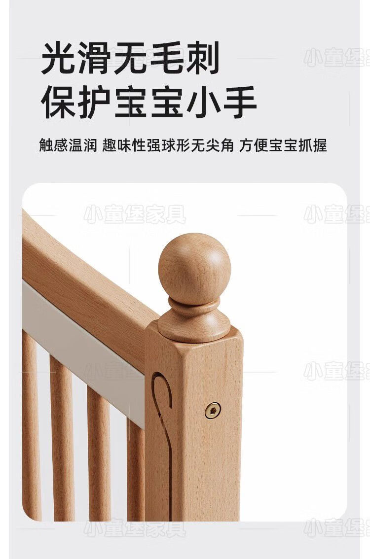 海诗圣堡榉木儿童拼接床实木婴儿床拼接大床升降护栏加宽床边床宝宝单人床 床高可调节(15档可调节) 全床榉木丨三面护栏丨150*60侧升降