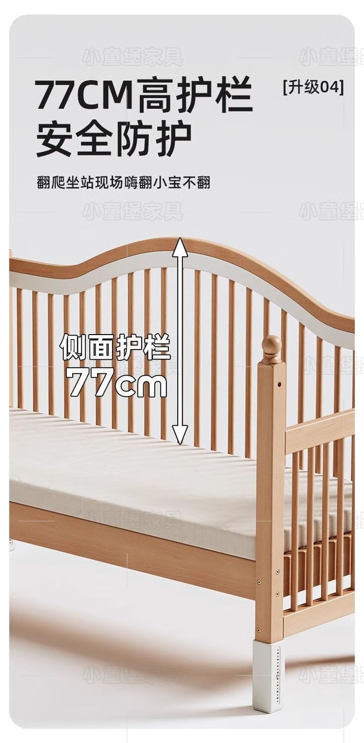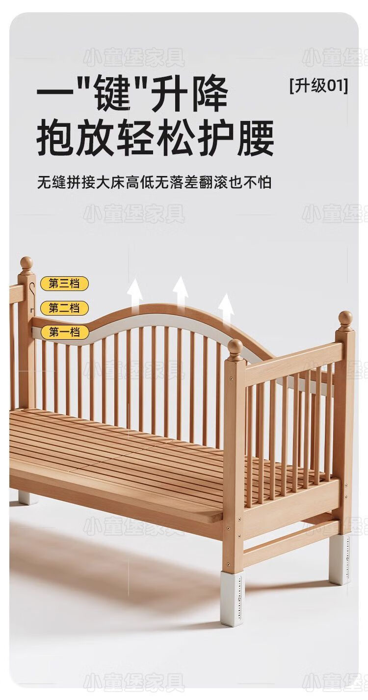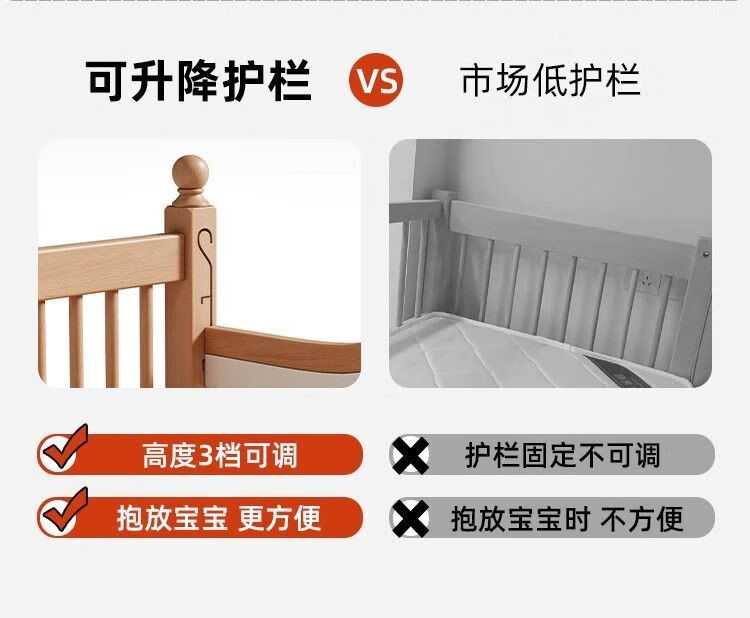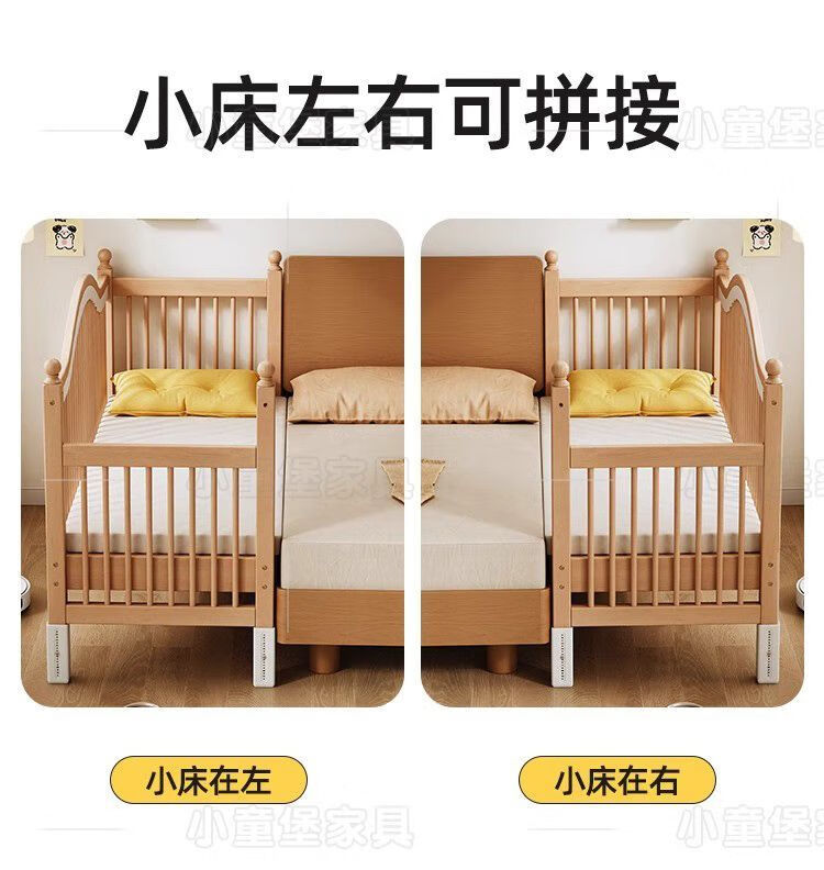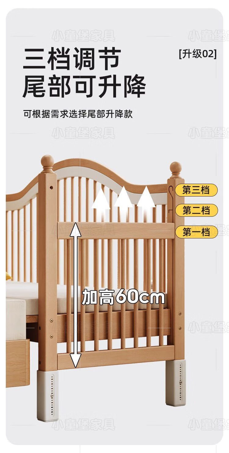 海诗圣堡榉木儿童拼接床实木婴儿床拼接大床升降护栏加宽床边床宝宝单人床 床高可调节(15档可调节) 全床榉木丨三面护栏丨150*60侧升降