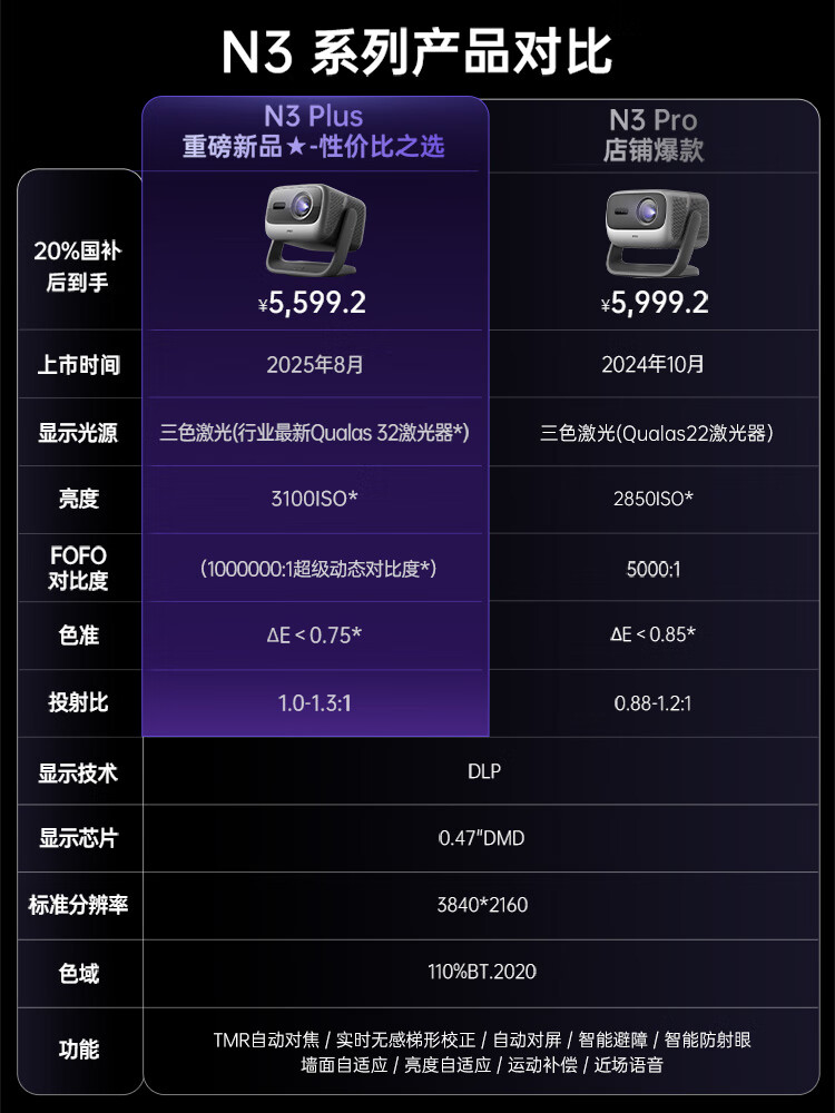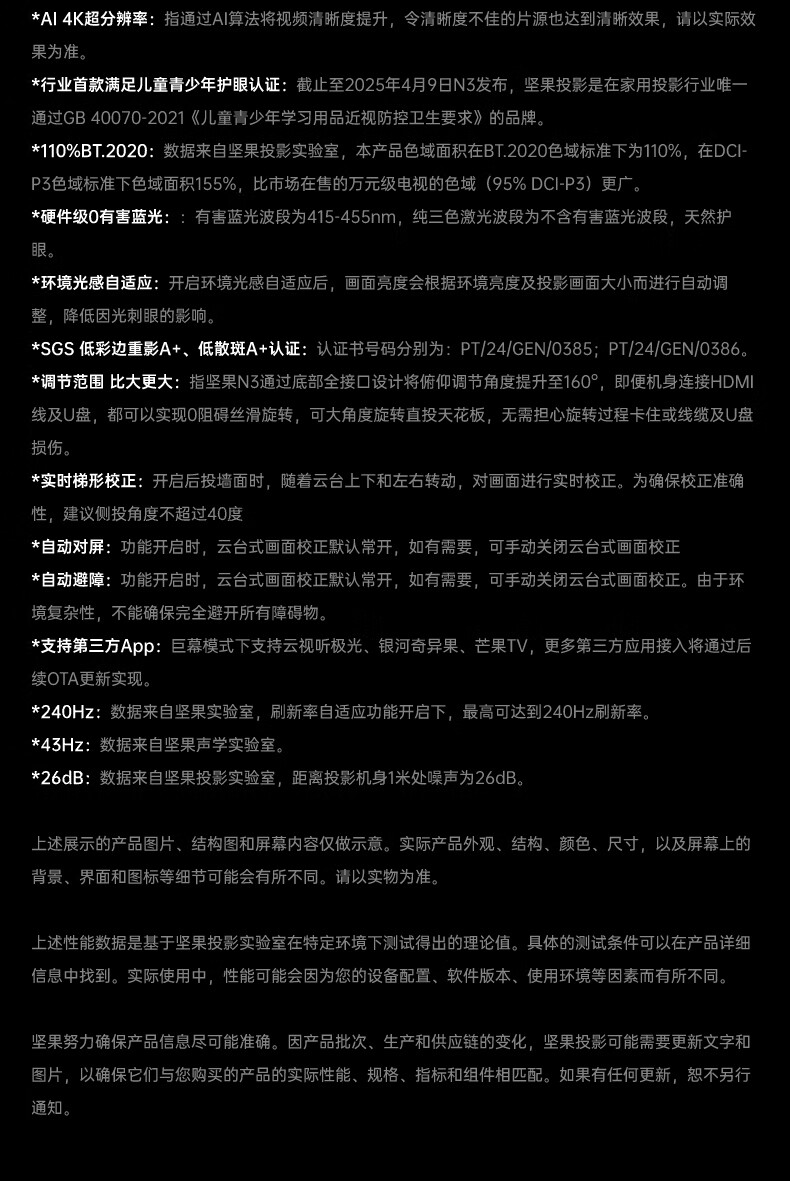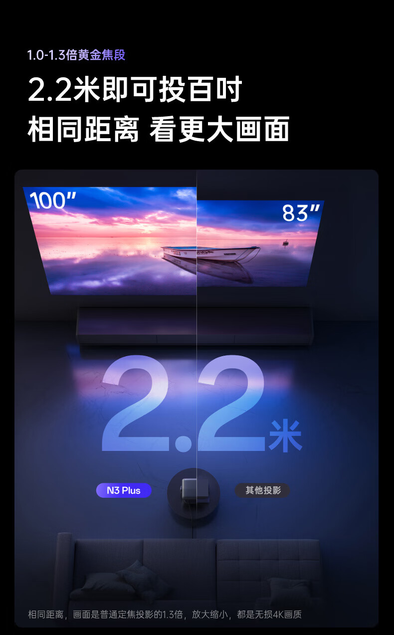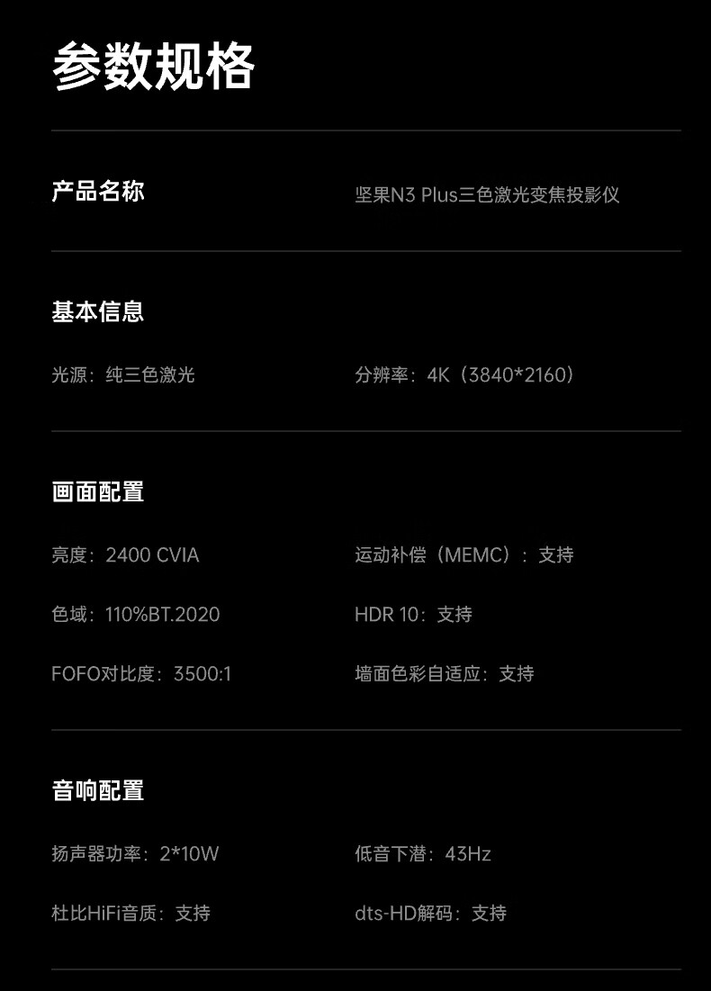 坚果投影(JMGO)N3 Plus纯三色激光变焦投影仪家用 4K无损超高清云台投影机 智能家庭影院 N3 Pro平替 国家补贴20%