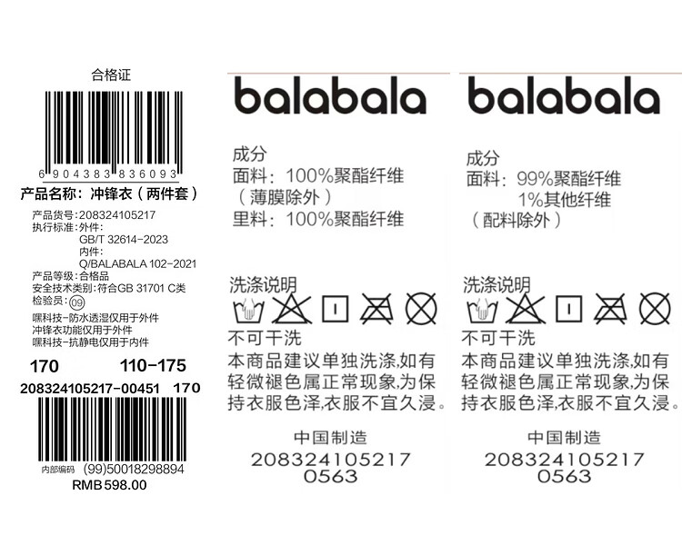 巴拉巴拉冲锋衣童装儿童外套2024年春秋装男童女童防风三合一208324105217