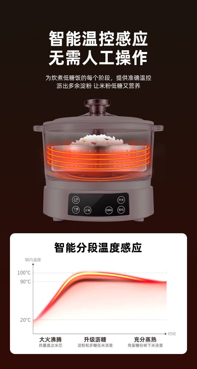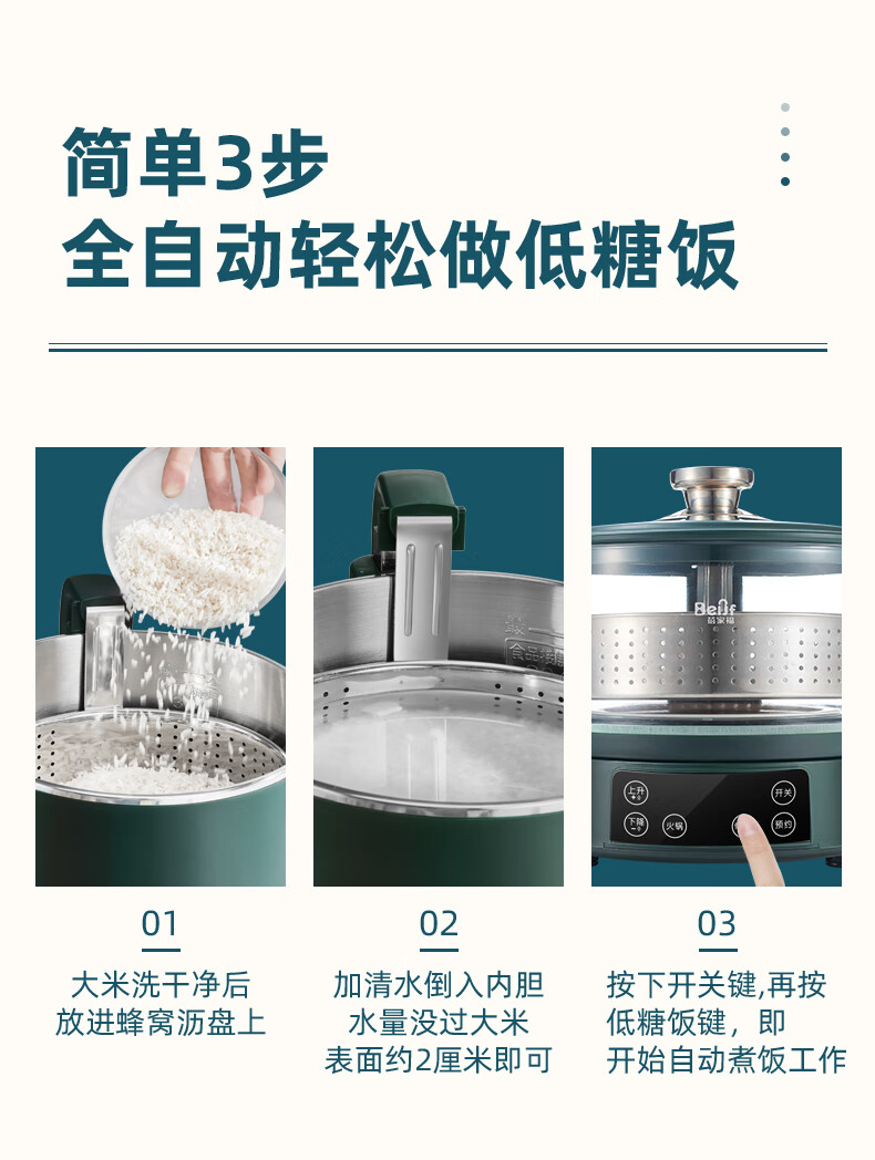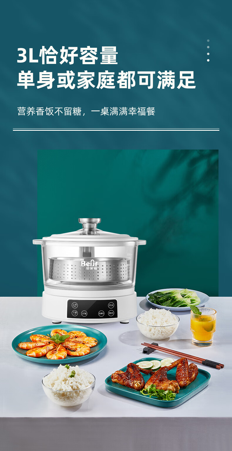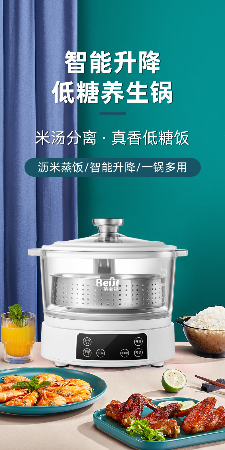 蓓家福蓓家福低糖电饭煲全自动升降式米汤分离智能预约多功能沥米饭锅过滤糖分蒸饭器 3L白色【可煮1斤低糖大米】(侧面升降) 3L
