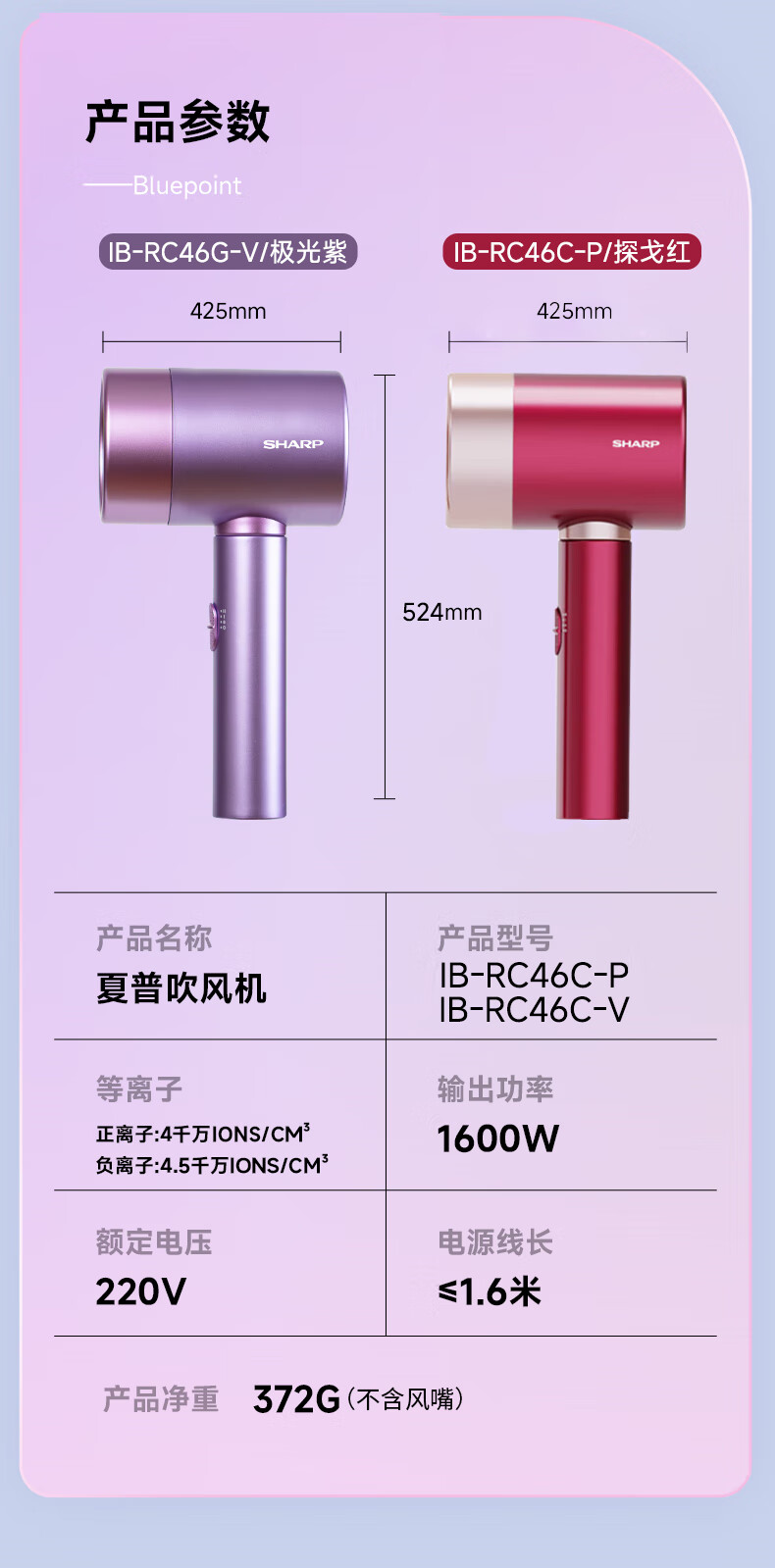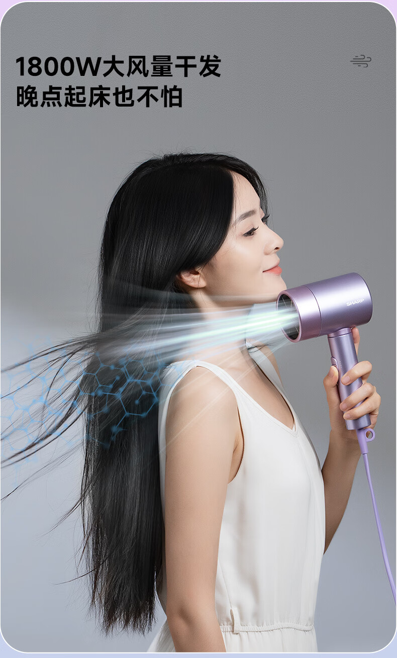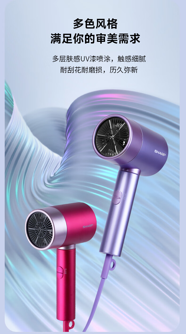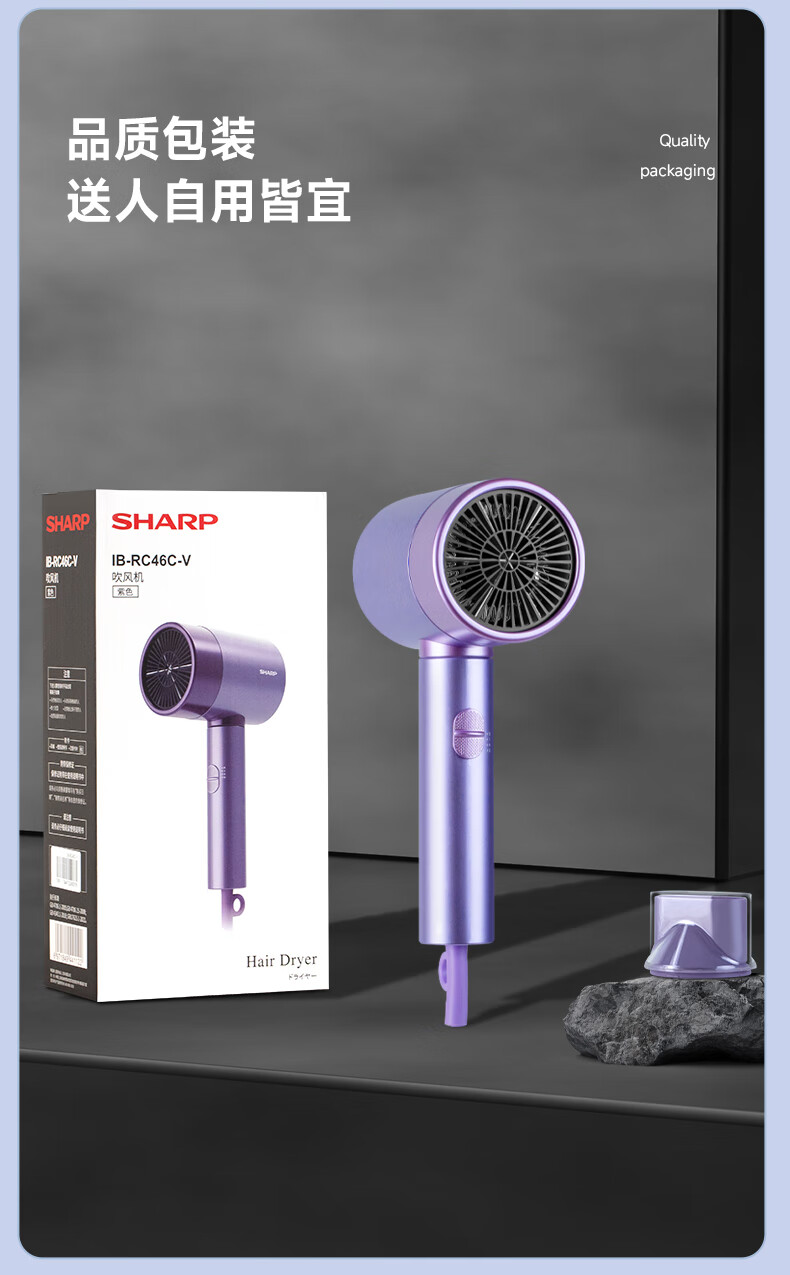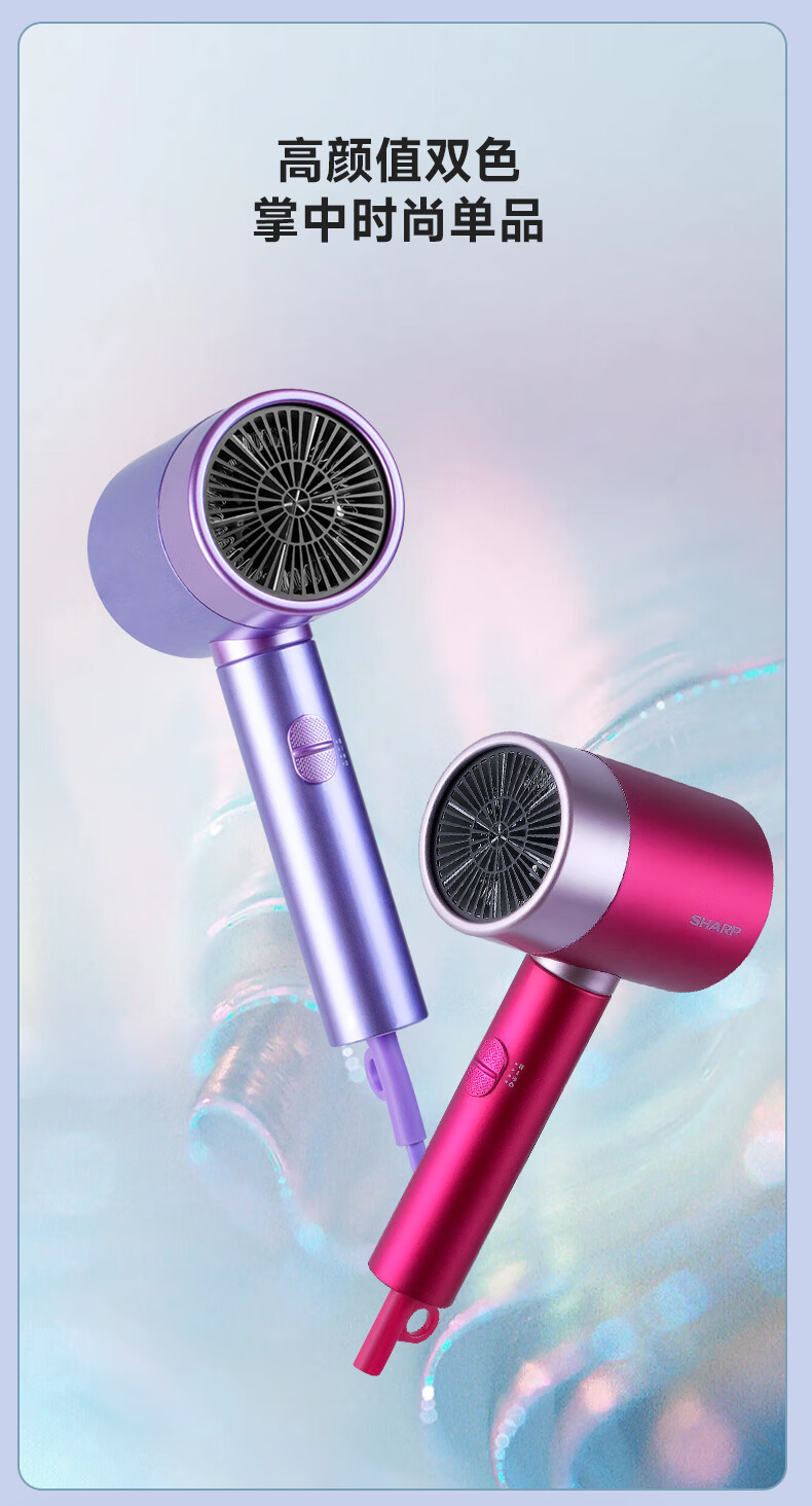 夏普(SHARP) 家用吹风机 高速电吹风低噪音负离子大风力智能温控护发低音大功率速干电吹风学生 IB-RC46C-P